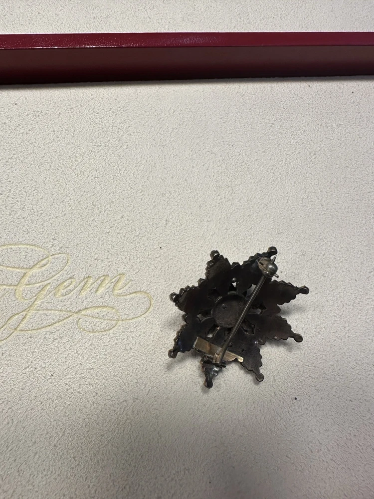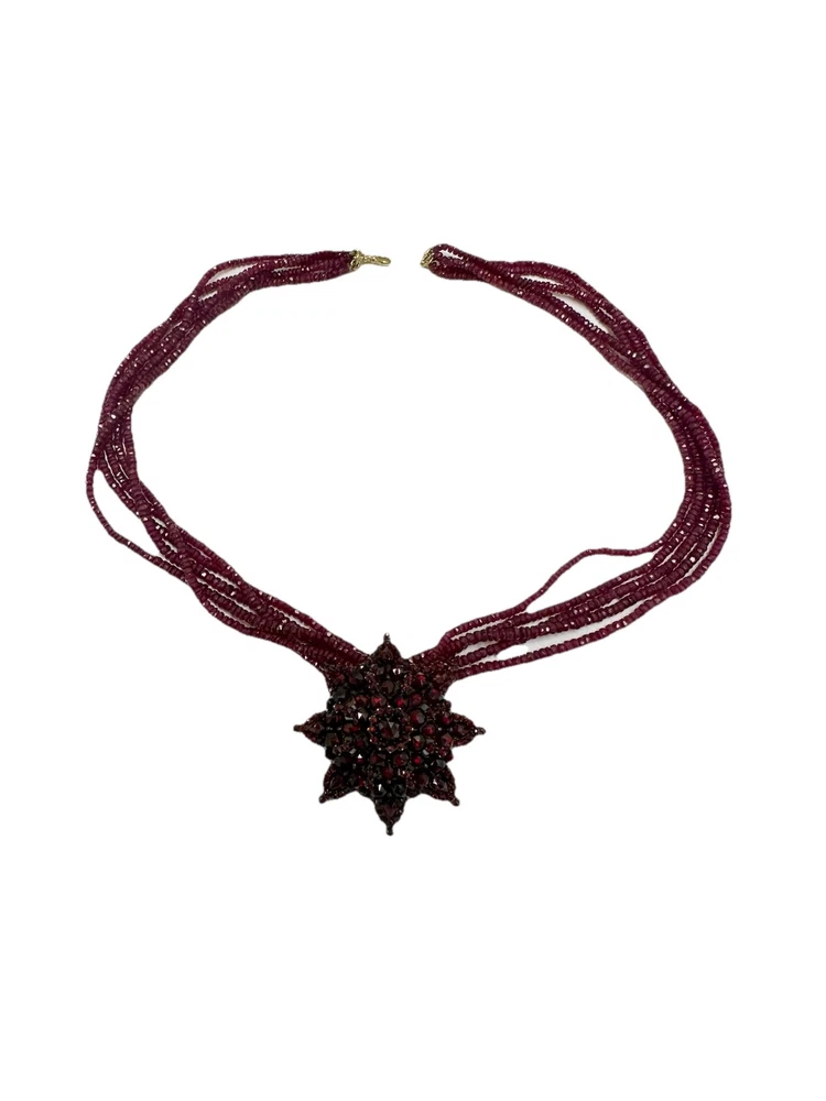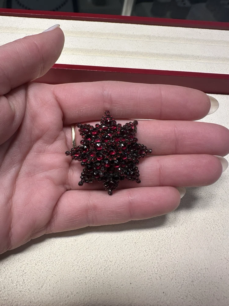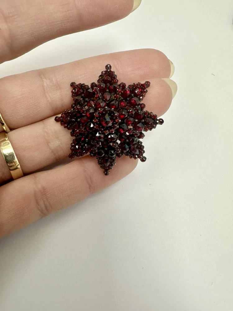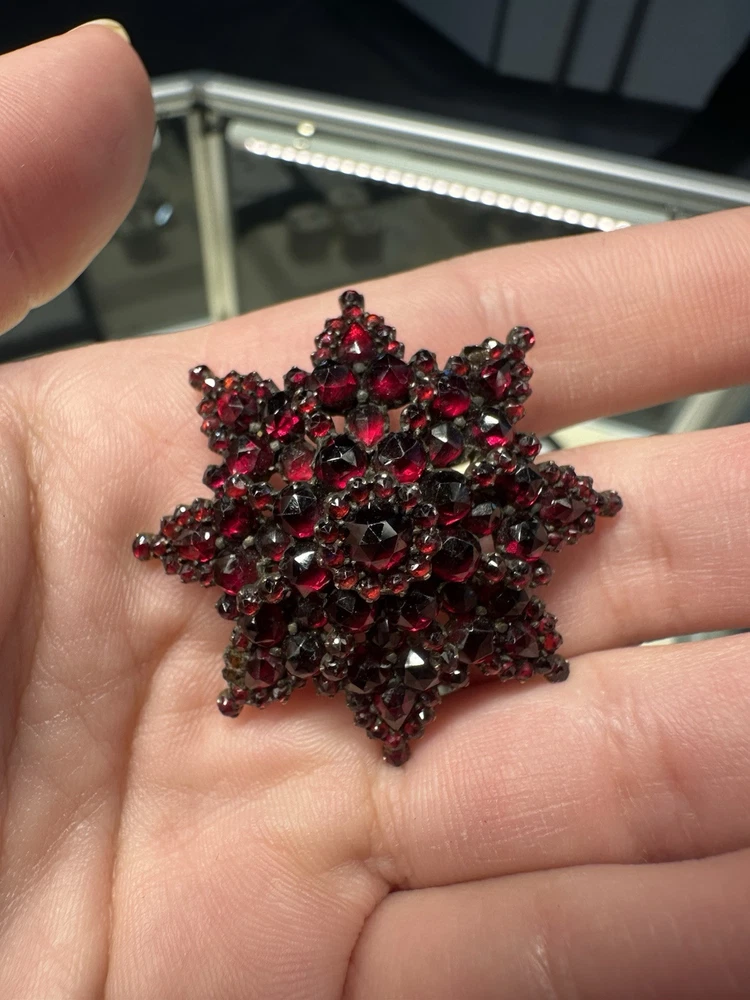 Dazzling antique bohemian garnet broach. I added some pictures with it being used as a pendant on my natural ruby and 18k gold strand (sold separately). There is some wear, but considering the incredibly vintage date of creation this piece has stood up to the test of time. I had to use a jeweler’s loop, but there are two garnets that are worn down and a small stone is missing. My experienced naked eye couldn’t tell. It’s an exciting piece of history! Also, bohemian garnet jewelry is not sterling. While it does contain silver and other metals in the mix, don’t be fooled by sellers claiming sterling especially with no stamp. This is a traditional piece true to its contextual events in history.