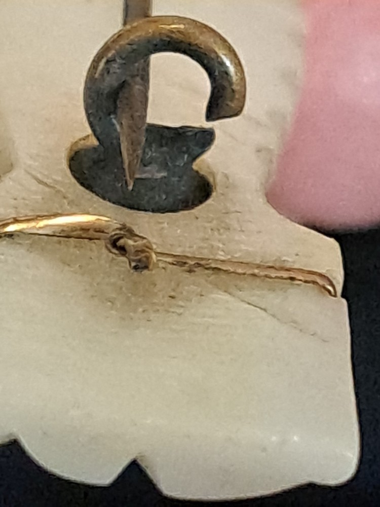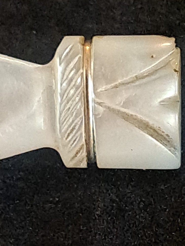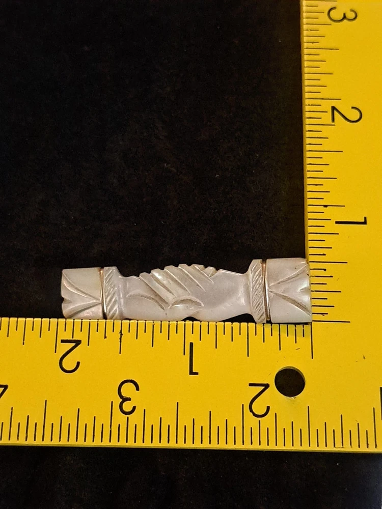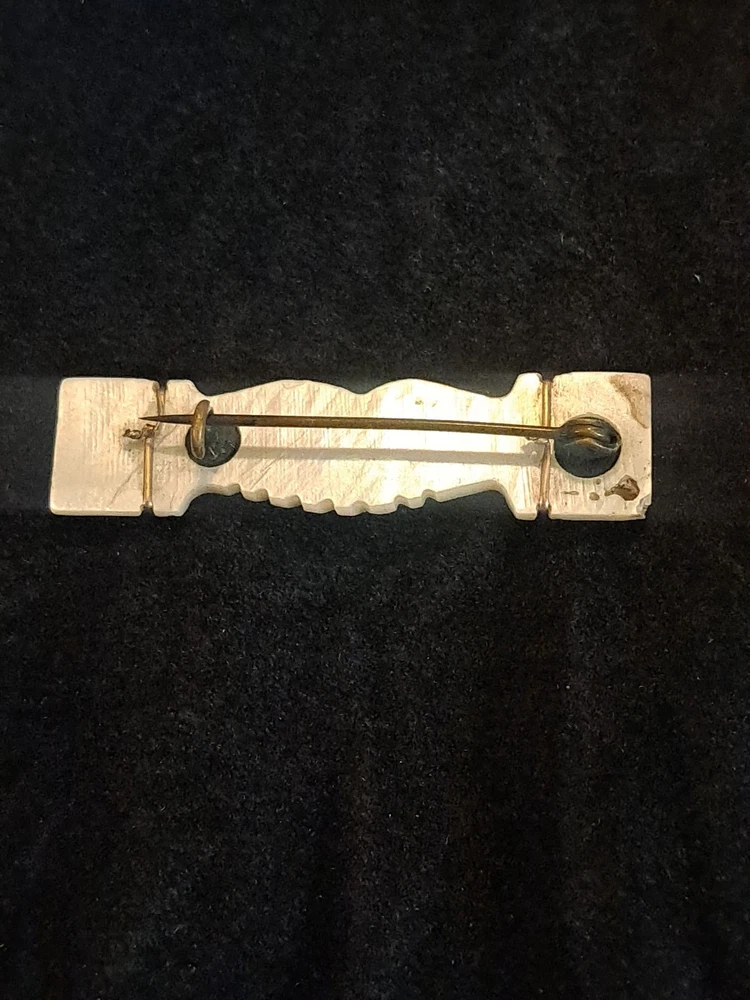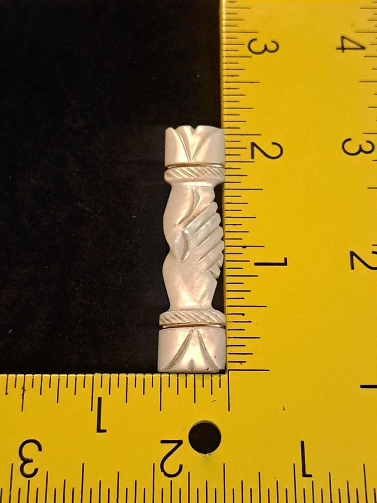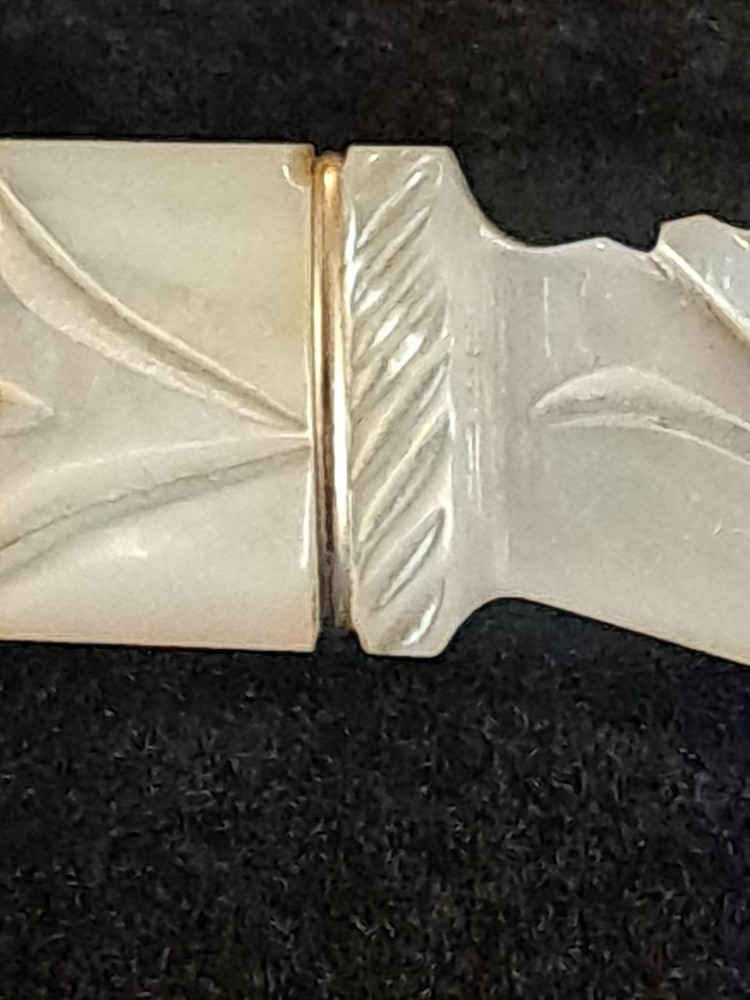 The Antique Victorian Carved Mother of Pearl Hand Clasp Brooch is a unique piece of vintage jewelry that features intricate carvings and a beautiful white mother of pearl design. The brooch is in the shape of a bar. This exquisite piece exudes elegance and charm, making it a perfect accessory for any formal occasion or to add a touch of vintage flair to a classic outfit.