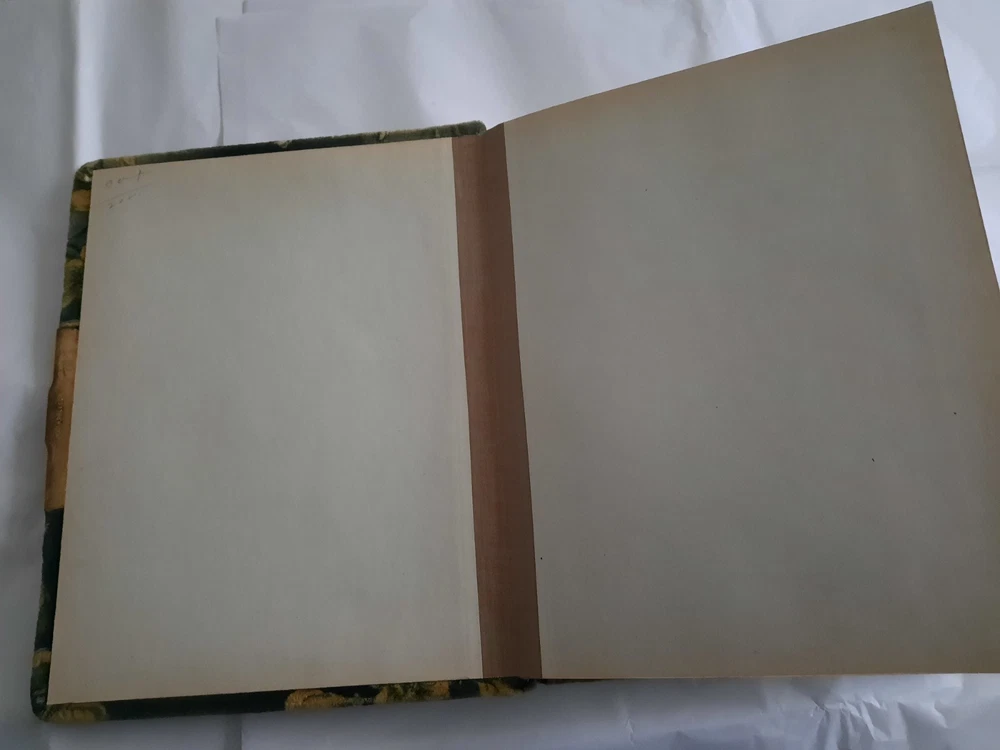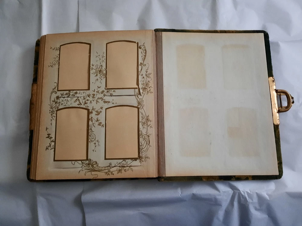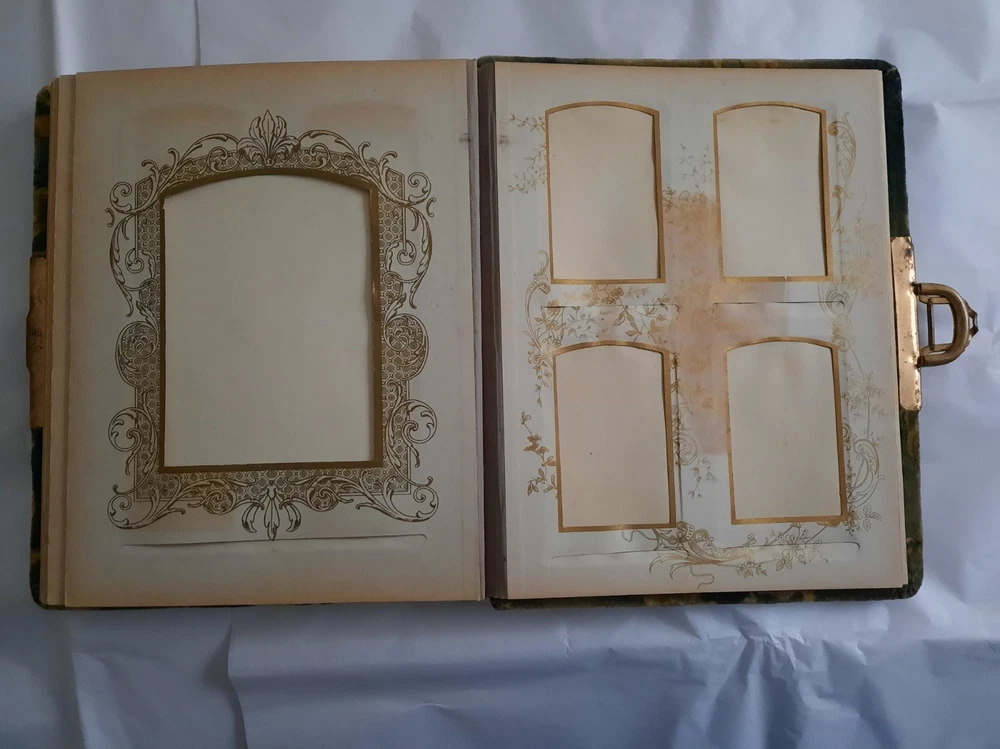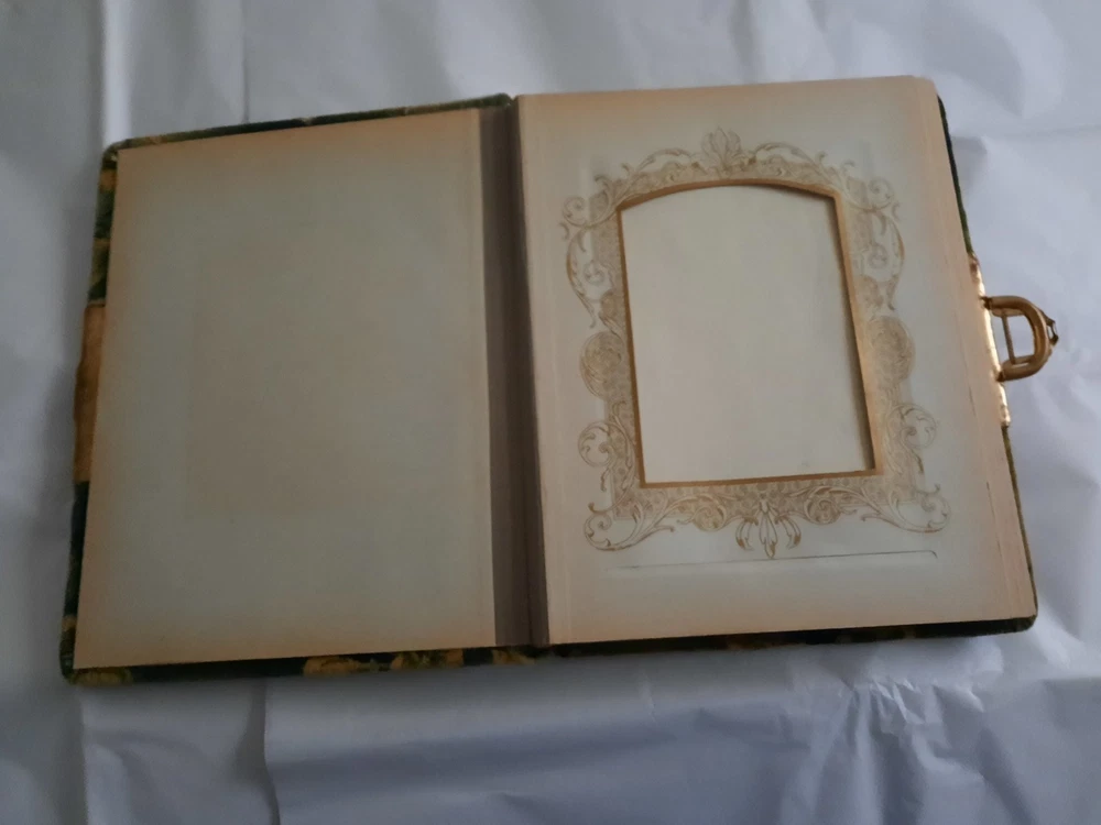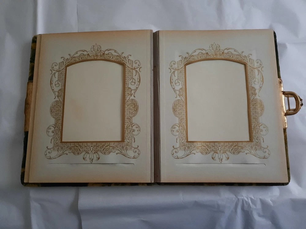 Stunning antique victorian celluloid velvet photo album in excellent vintage condition. This photo album is gorgeous externally displaying a well preserved celluloid cover with a beautiful picture of a woman holding a flower basket, wearing a stylish hat with a large fluffy bow on top. The velvet has a very ornate floral pattern in beautiful plush green colors. The velvet has little to no signs of wear, fading or tears. The golden clasp has no damage and works perfectly. The inside pages are also in excellent condition for the age of the photo album. As shown in the pictures there is some fading and toning to the pages. Measurements approximately 10 1/2" x 9" x 2". 'Check out my other listing for a similar item'
