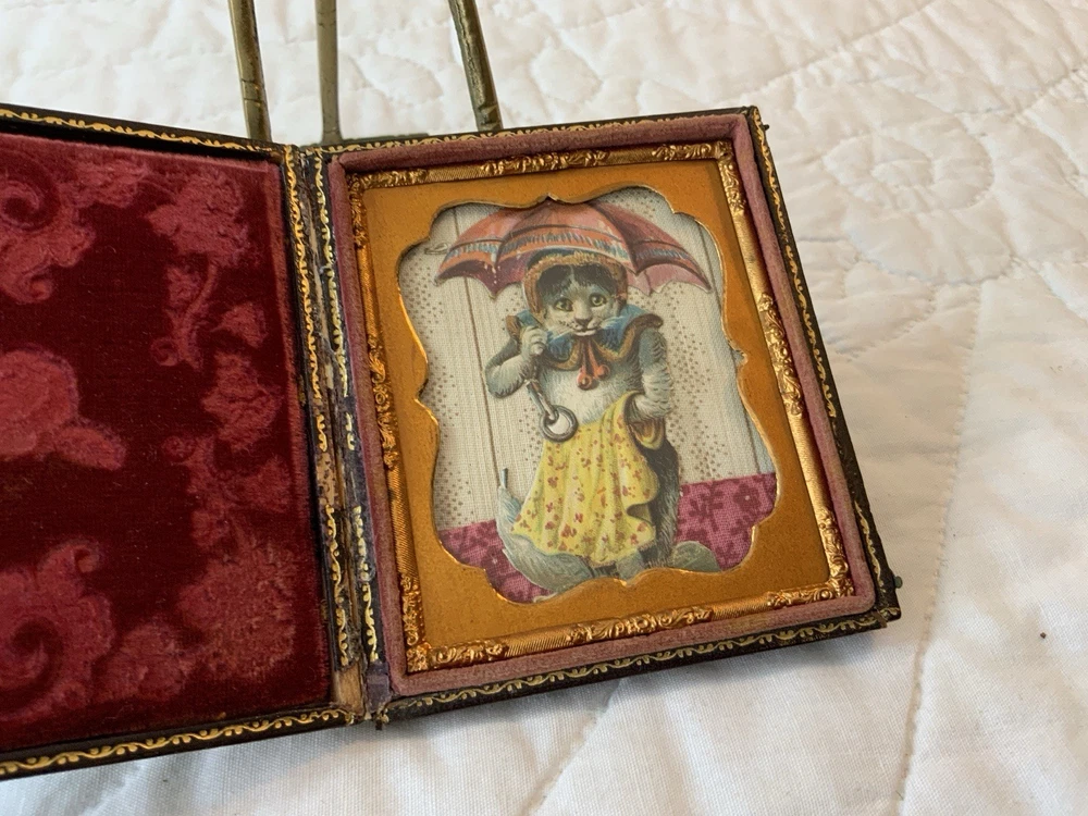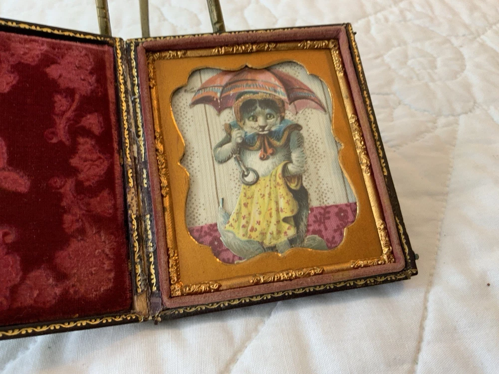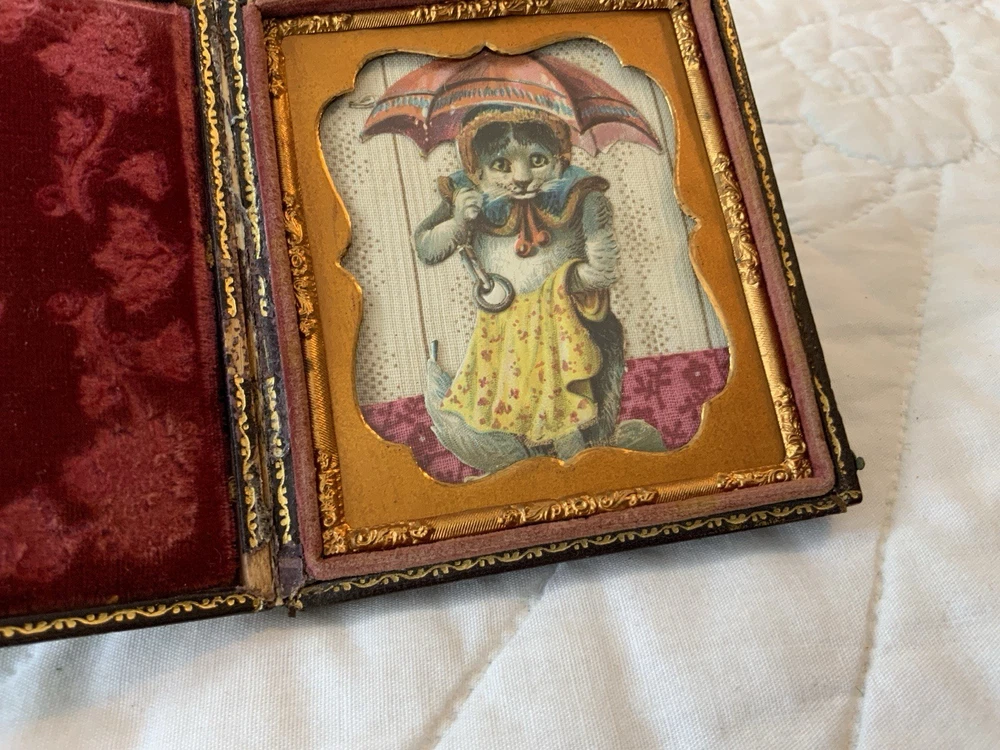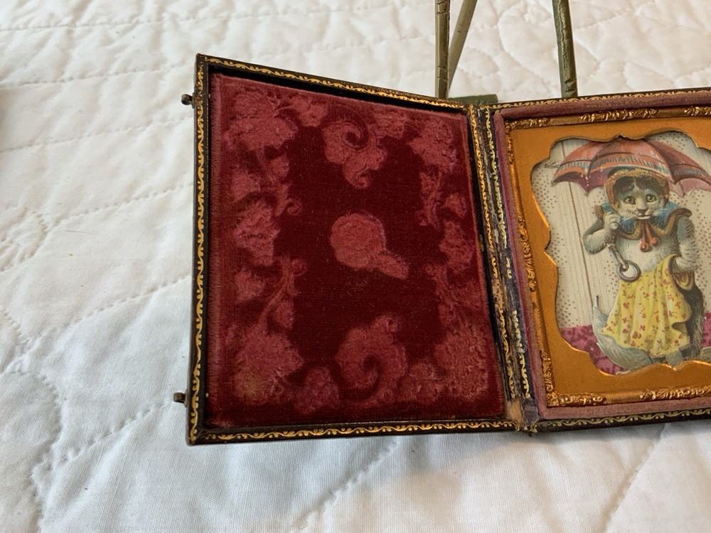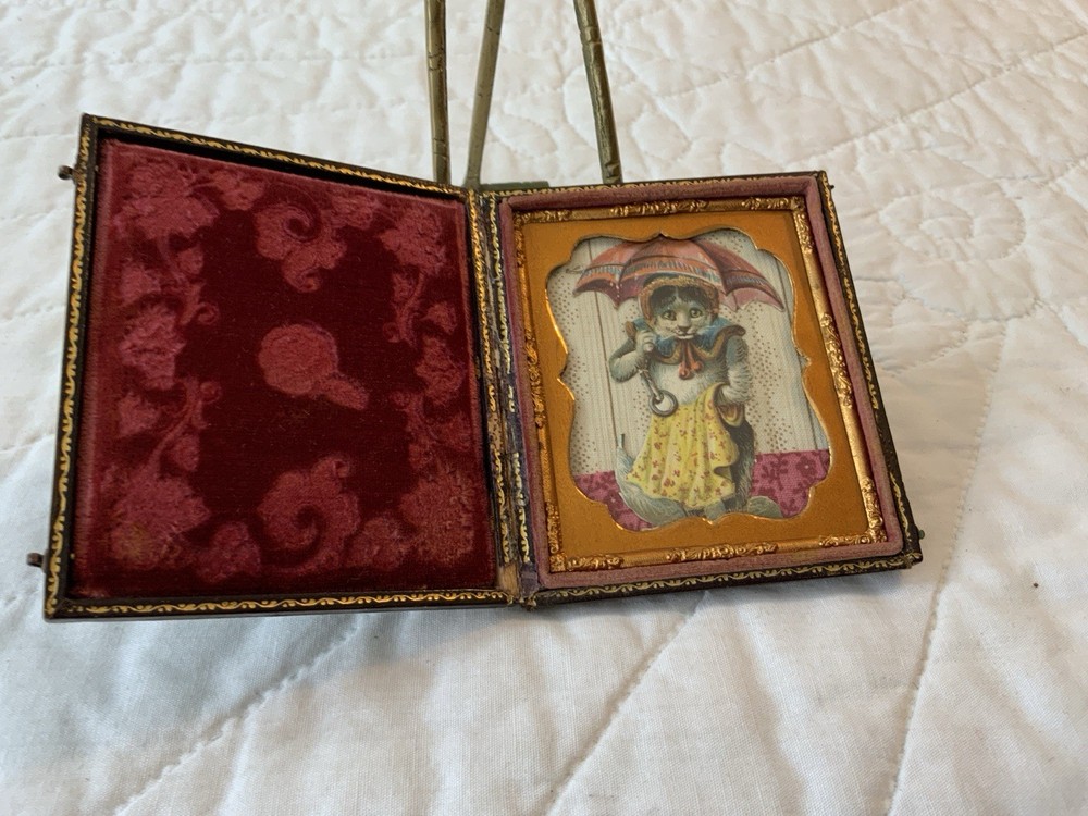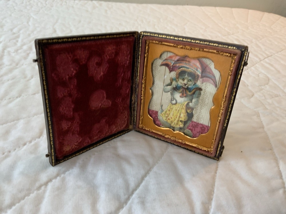 Up for sale is a vintage antique Victorian die cut ephemera framed. Full antique union case. 1/6 plate size. Blackish brown. The Victorian die cut ephemera is from the late 1800’s. The die cut ephemera is a kitty cat with a parasol, fancy dress. The colors are grey, mustard, black, white, beige, pink, yellow, multi. The background is antique early calico print, beige, white, pink, rosy red. This has been put together by me. The union case is from the mid 1800’s. Gold detailed frame and mat around the artwork. Under glass. Left side or top in this union case has deep rose velvet with flower design. Union case is in very good condition. This union case finish is a blackish brown and has been touched up by me. Original little hooks and clasps on the side are working. Measures 3 1/4” by 3 3/4” by 1/2” (When closed). Very, very good condition. Union case has been touched up by me. Spine has been reinforced with fine leather. Refer to all pictures. 🌼🦜🌺 Thanks and happy shopping. I will combine shipping. Payment due within three days. Please visit my ebay store: webbsamericancounry1 for over 2000 vintage and collectible items.