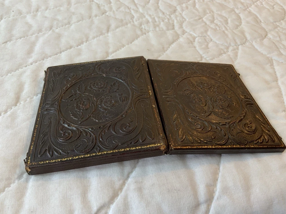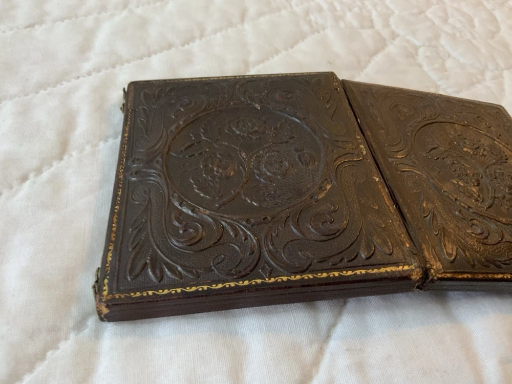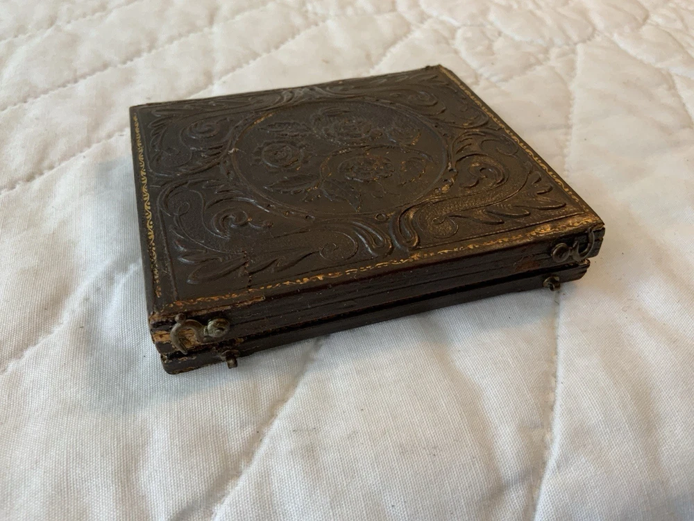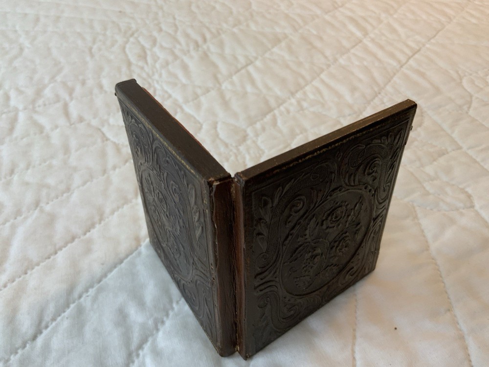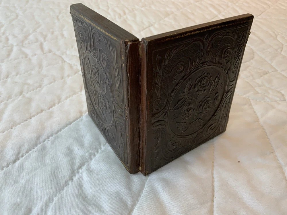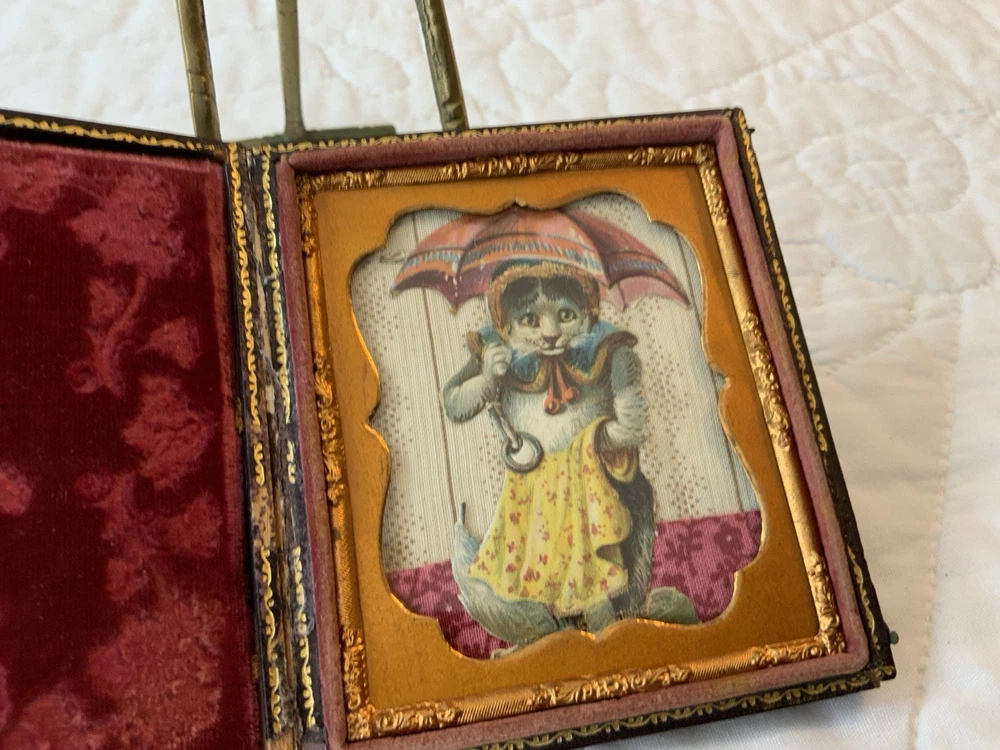 Up for sale is a vintage antique Victorian die cut ephemera framed. Full antique union case. 1/6 plate size. Blackish brown. The Victorian die cut ephemera is from the late 1800’s. The die cut ephemera is a kitty cat with a parasol, fancy dress. The colors are grey, mustard, black, white, beige, pink, yellow, multi. The background is antique early calico print, beige, white, pink, rosy red. This has been put together by me. The union case is from the mid 1800’s. Gold detailed frame and mat around the artwork. Under glass. Left side or top in this union case has deep rose velvet with flower design. Union case is in very good condition. This union case finish is a blackish brown and has been touched up by me. Original little hooks and clasps on the side are working. Measures 3 1/4” by 3 3/4” by 1/2” (When closed). Very, very good condition. Union case has been touched up by me. Spine has been reinforced with fine leather. Refer to all pictures. 🌼🦜🌺 Thanks and happy shopping. I will combine shipping. Payment due within three days. Please visit my ebay store: webbsamericancounry1 for over 2000 vintage and collectible items.