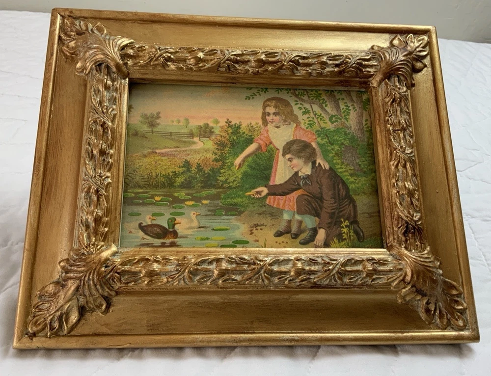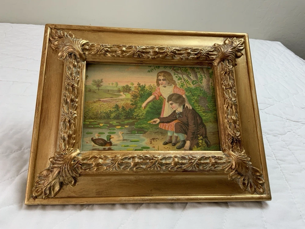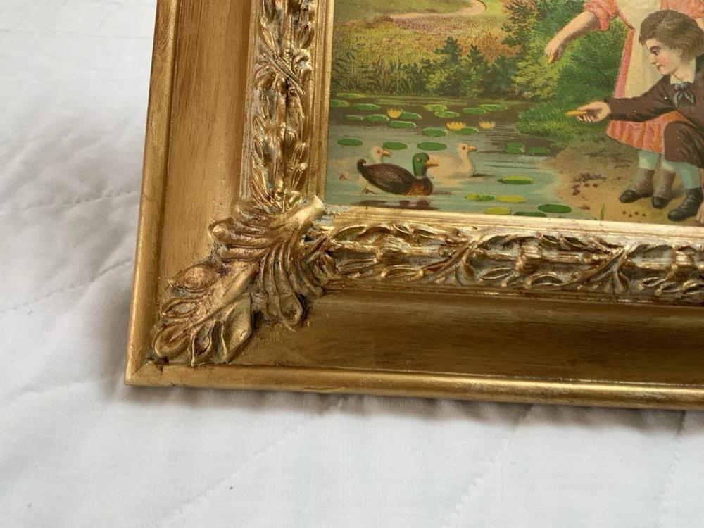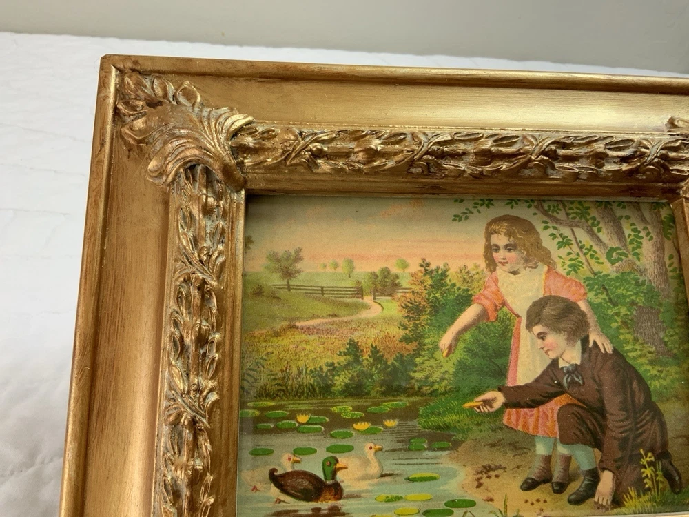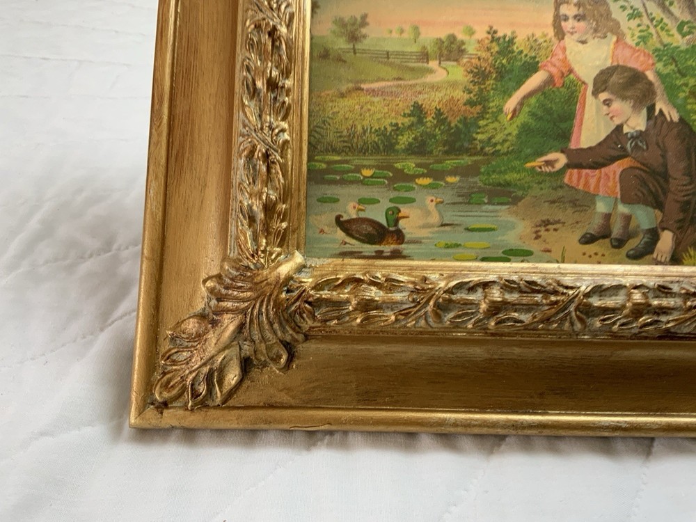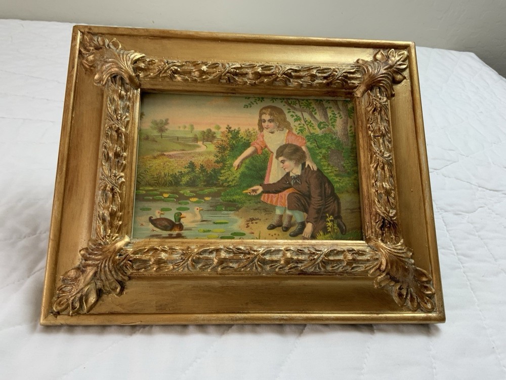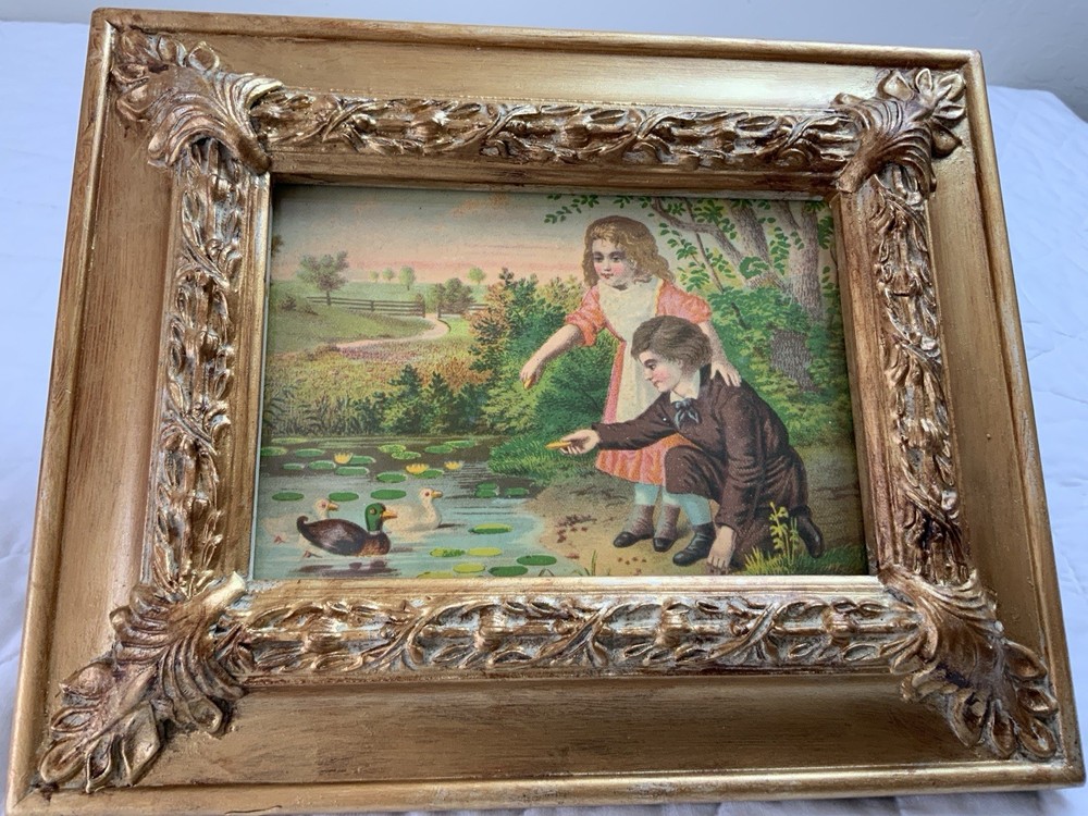 Up for sale is a vintage/antique framed Victorian ephemera. From the early 1900’s. Found in a Victorian scrapbook. The design is printed, girl and boy at a pond, ducks,, trees. The colors are pink, brown, blond, flesh, green, blue, gold, multi. The frame is distressed gold/brown tone. Under glass. Faux wood with intricate feather and leaf detailing. Measures 8 1/2” by 10 3/4”. Very, very nice Victorian art. Original Victorian art. Frame is not vintage. Under glass. Thanks and happy shopping. I will combine shipping. Please visit my ebay store: webbsamericancounry1 for over 2000 vintage and collectible items.