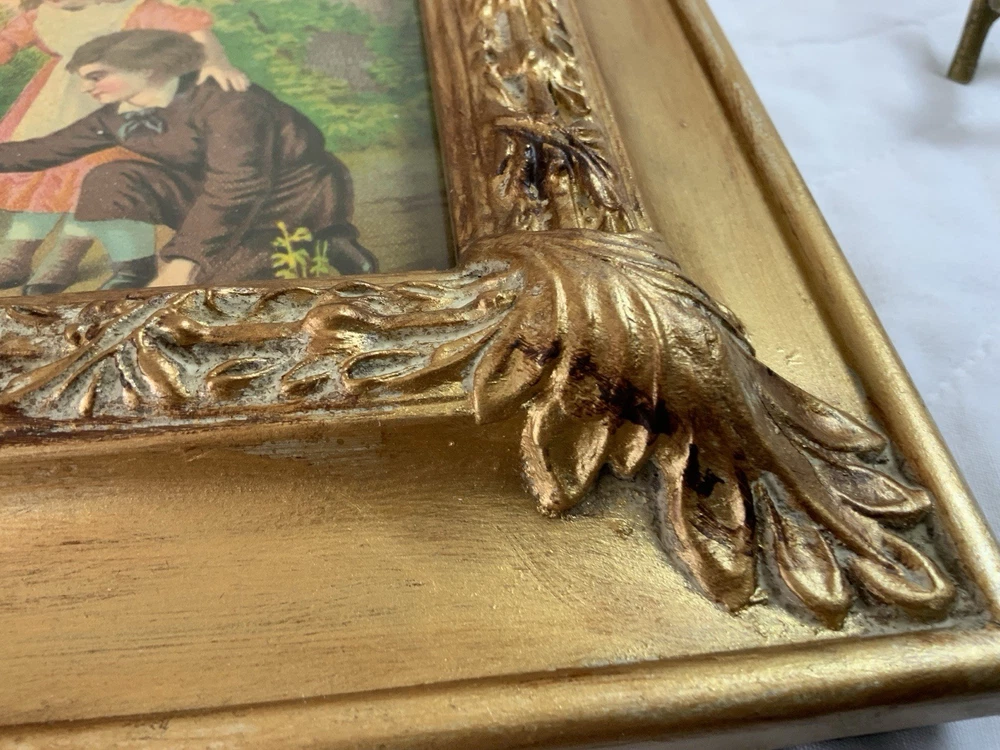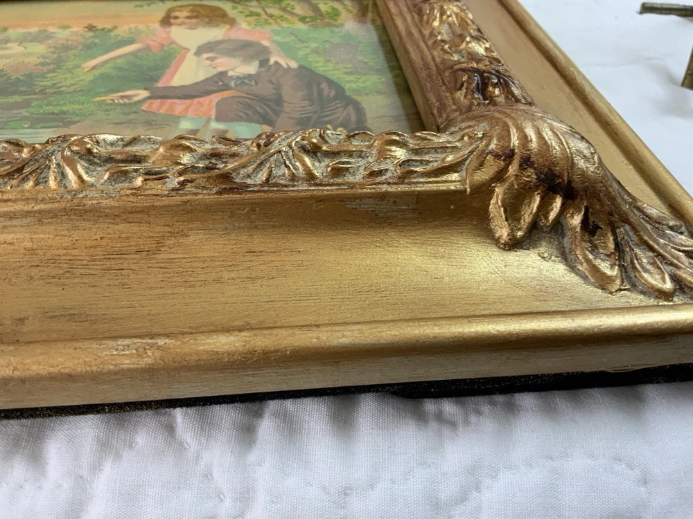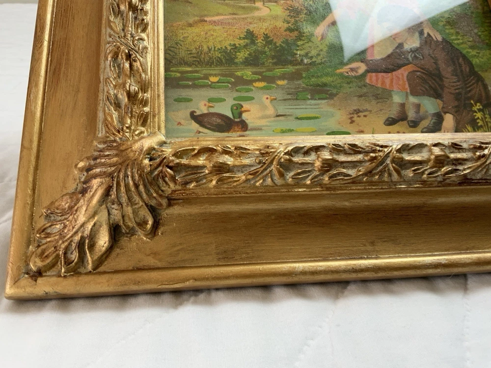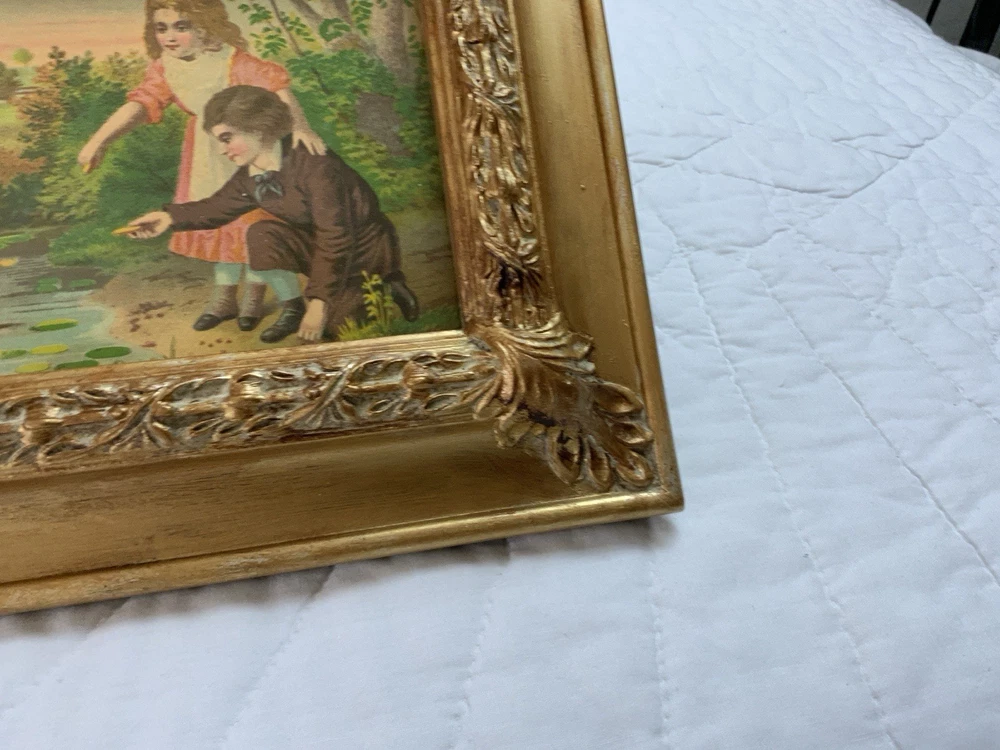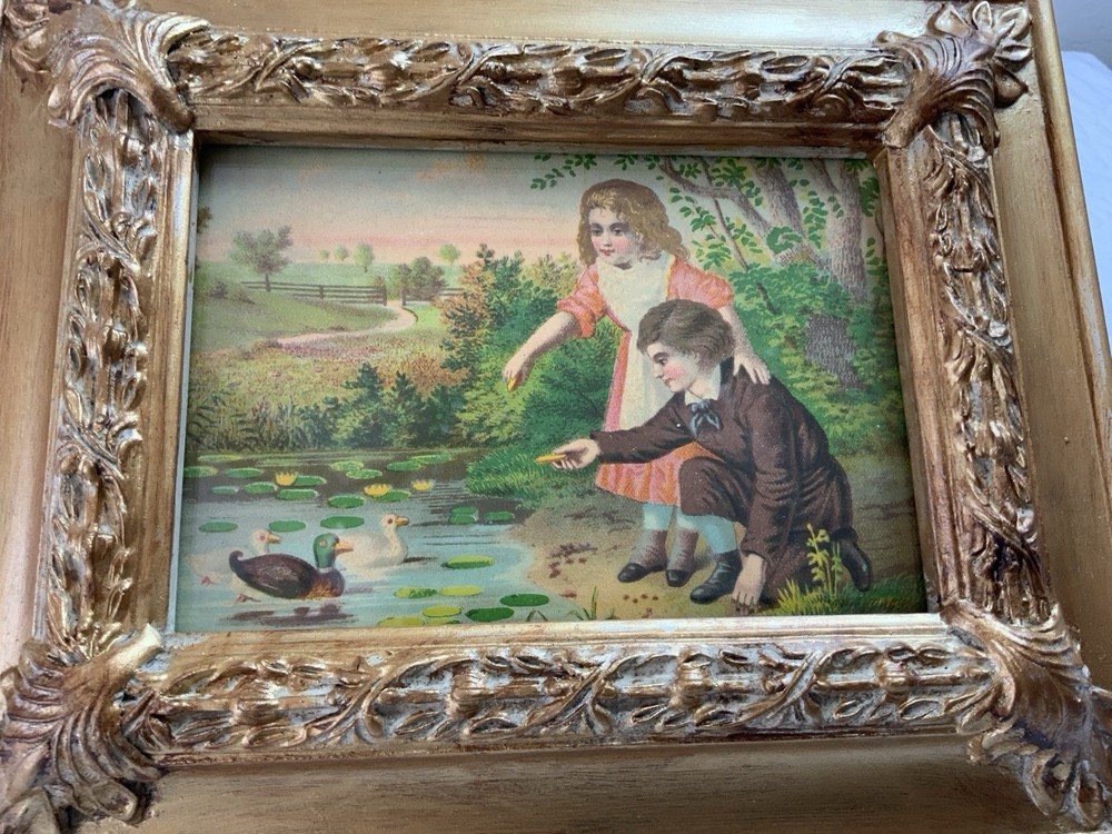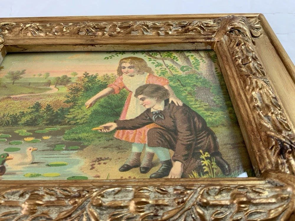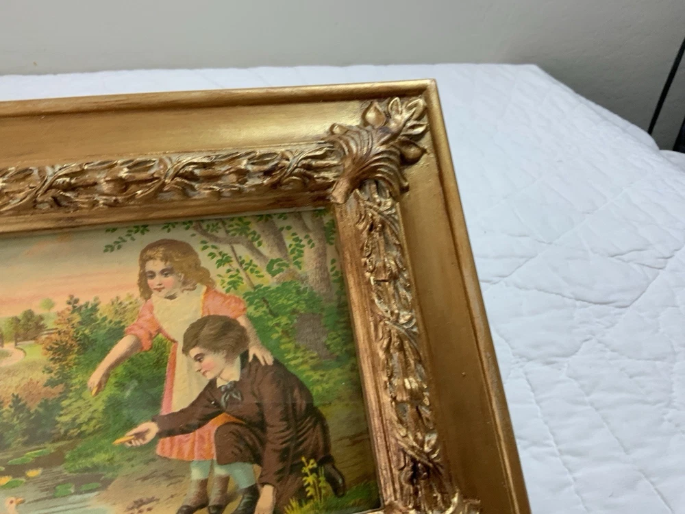 Up for sale is a vintage/antique framed Victorian ephemera. From the early 1900’s. Found in a Victorian scrapbook. The design is printed, girl and boy at a pond, ducks,, trees. The colors are pink, brown, blond, flesh, green, blue, gold, multi. The frame is distressed gold/brown tone. Under glass. Faux wood with intricate feather and leaf detailing. Measures 8 1/2” by 10 3/4”. Very, very nice Victorian art. Original Victorian art. Frame is not vintage. Under glass. Thanks and happy shopping. I will combine shipping. Please visit my ebay store: webbsamericancounry1 for over 2000 vintage and collectible items.