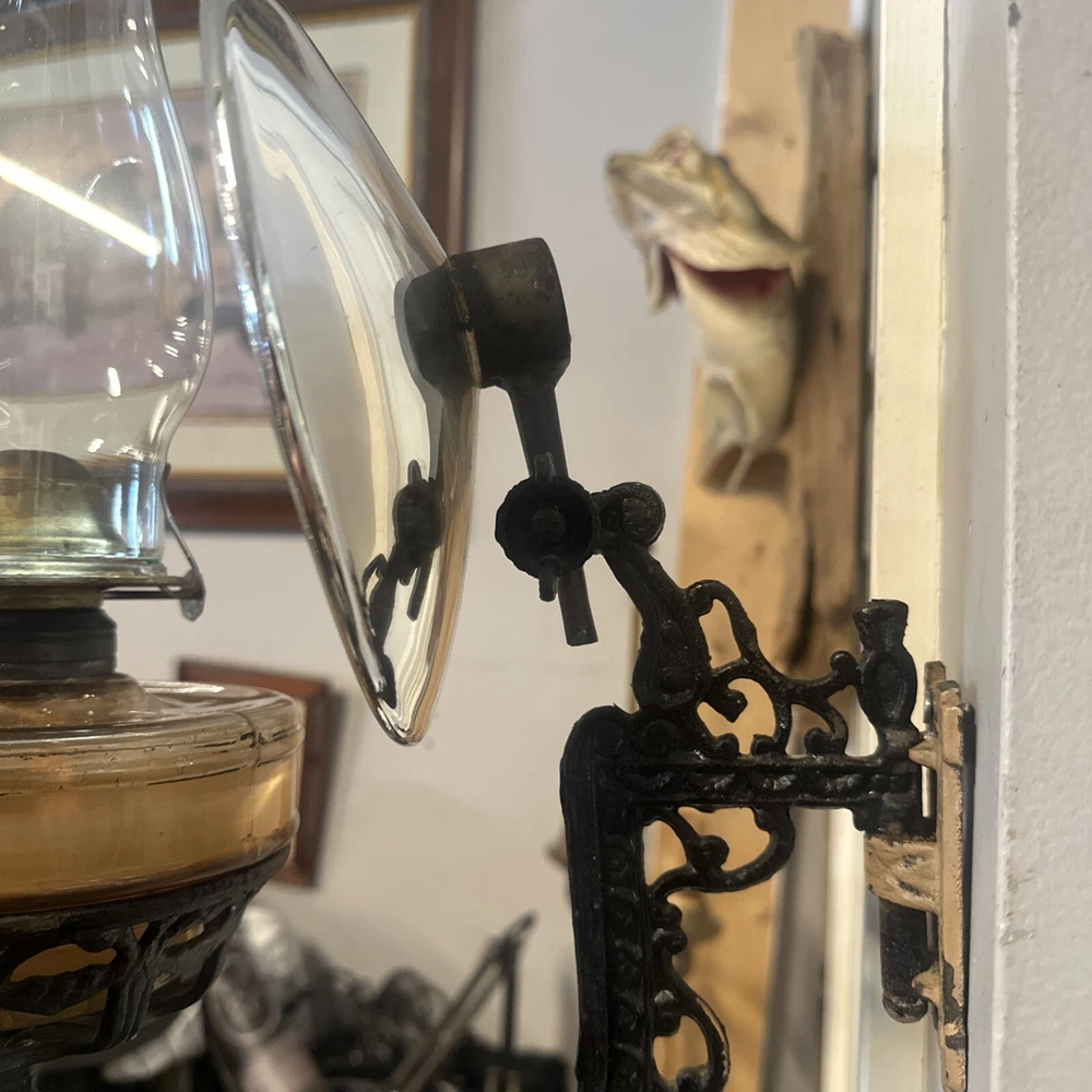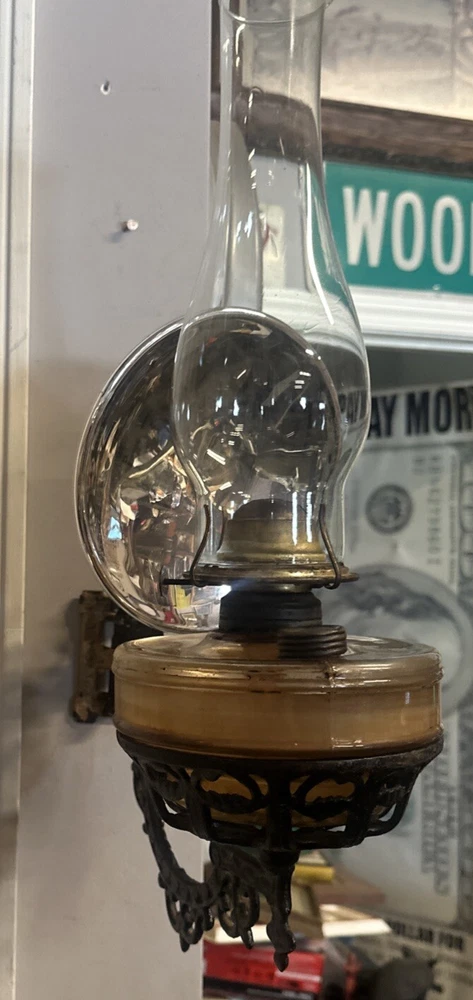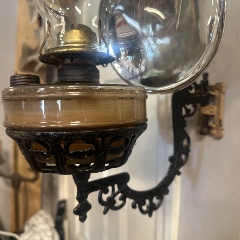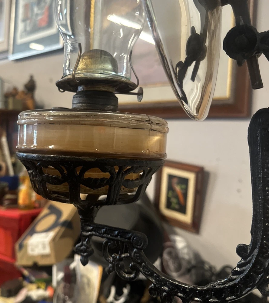 Antique Victorian Era Metal Wall Bracket Oil Lamp with Mercury Glass Reflector