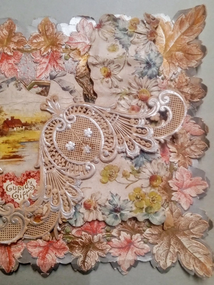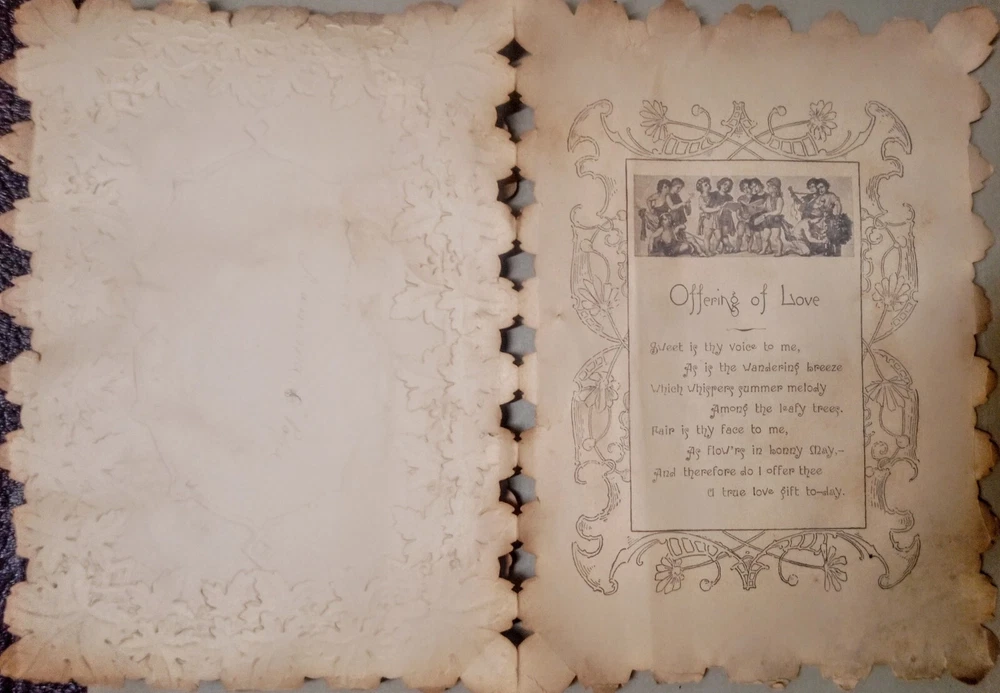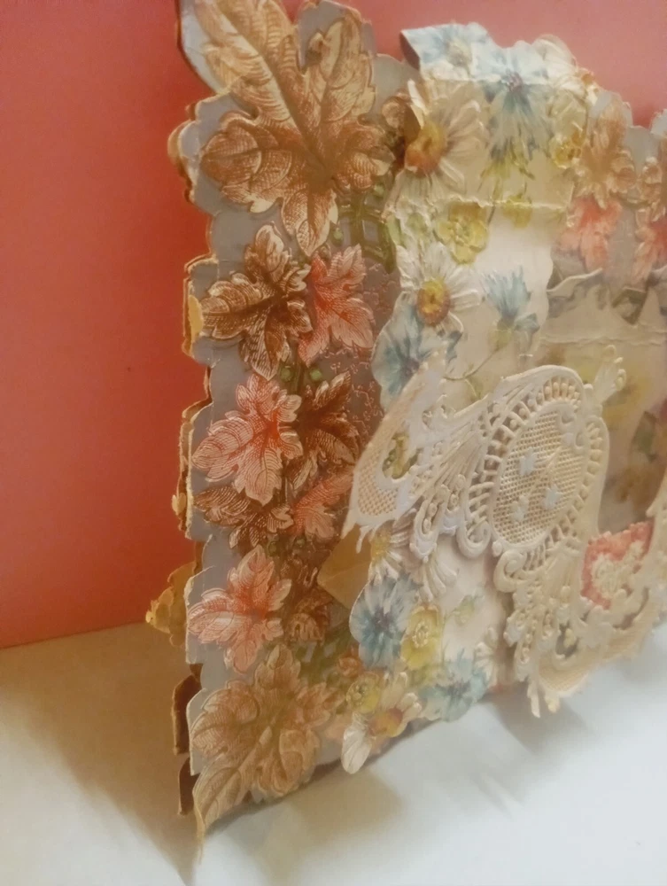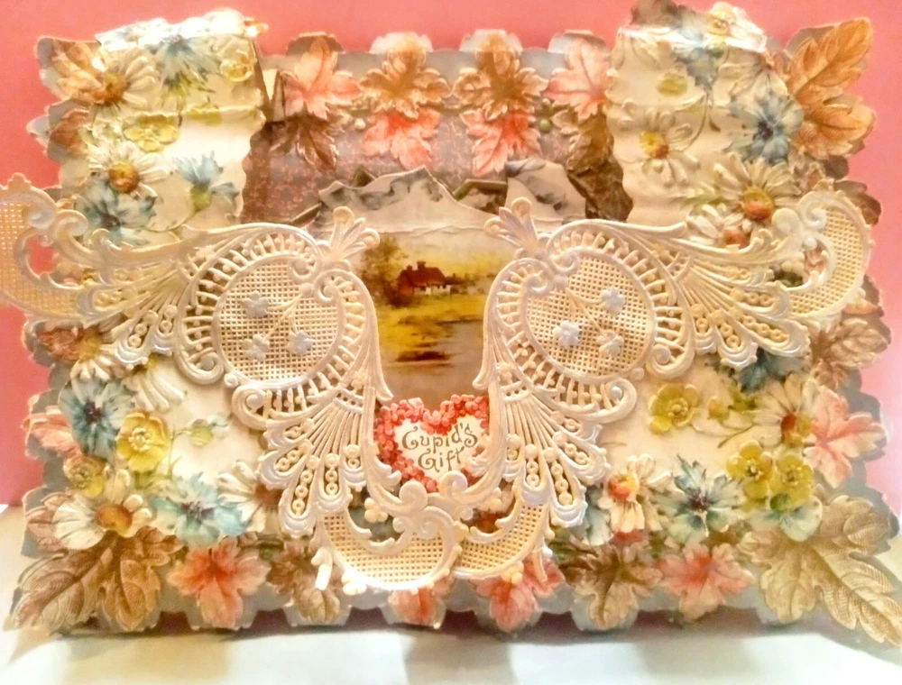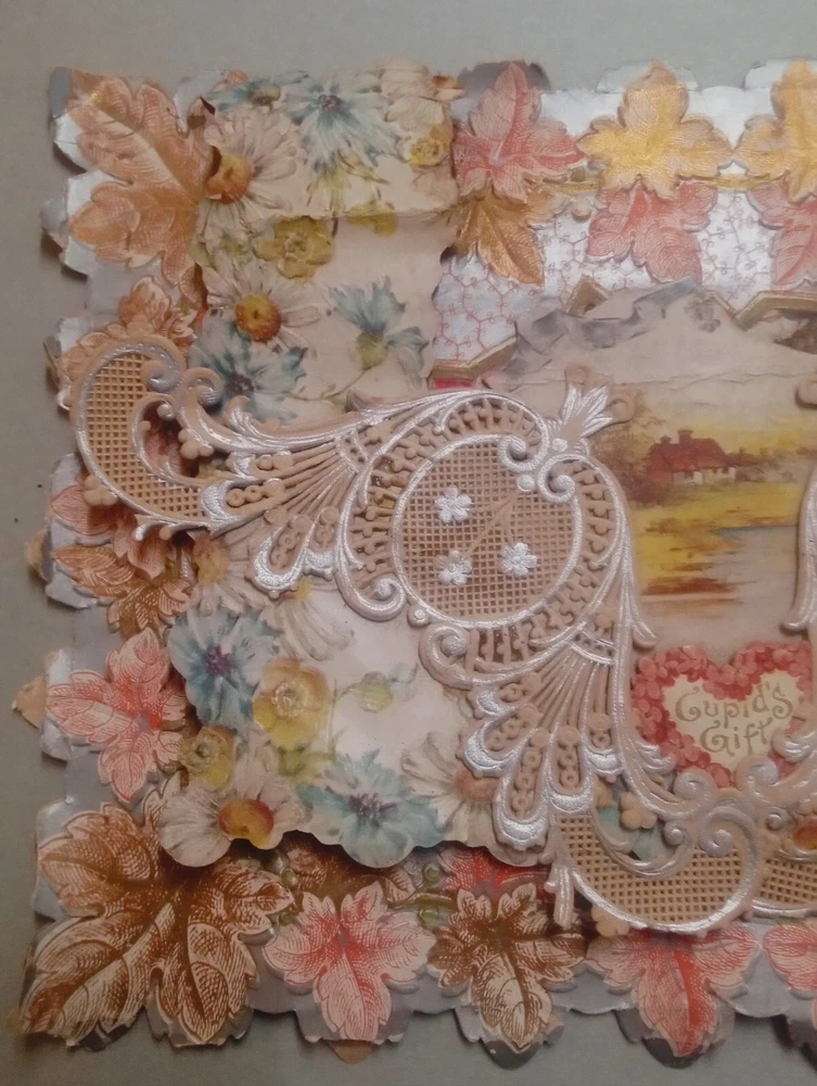 This antique Victorian Valentine's Day card features intricate paper lace and a die-cut design, dating back to the early 1900s. This beautiful card is dated 1908 to be specific. The card showcases a charming image of a Victorian home, adding a touch of elegance to this vintage piece. There is some bending and creasing but still a beautiful card none the less. Please see pictures for all details and up close pictures. The inside left panel has momma and Papa handwritten inside very lightly and the back is dated 1908 with Mr. Fritz signature. ❤️