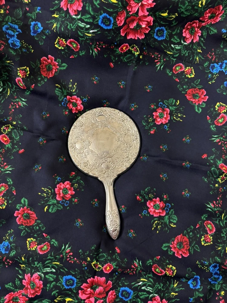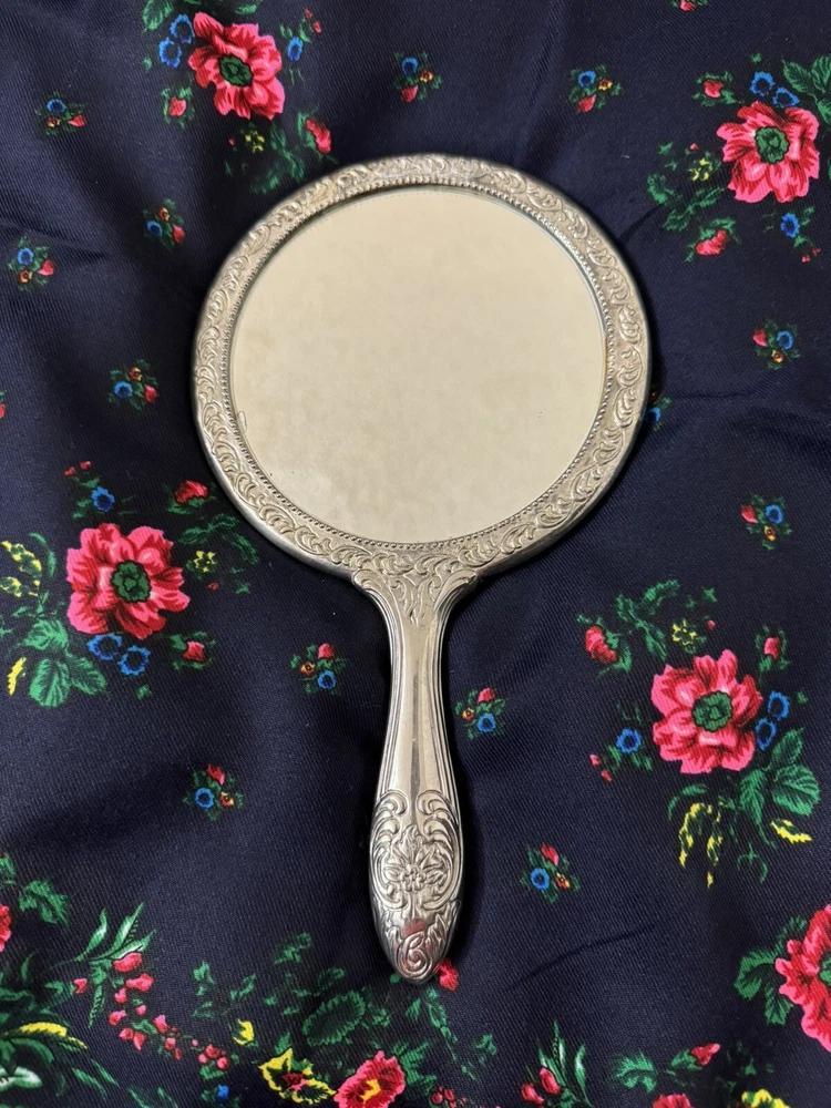 Antique Victorian Silver & Glass Hand Mirror Ornate Repousse Foliate. Good condition. No chips or cracks .