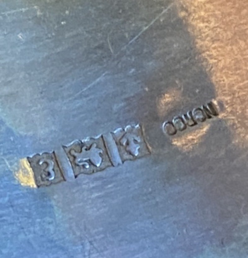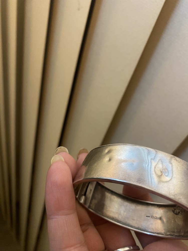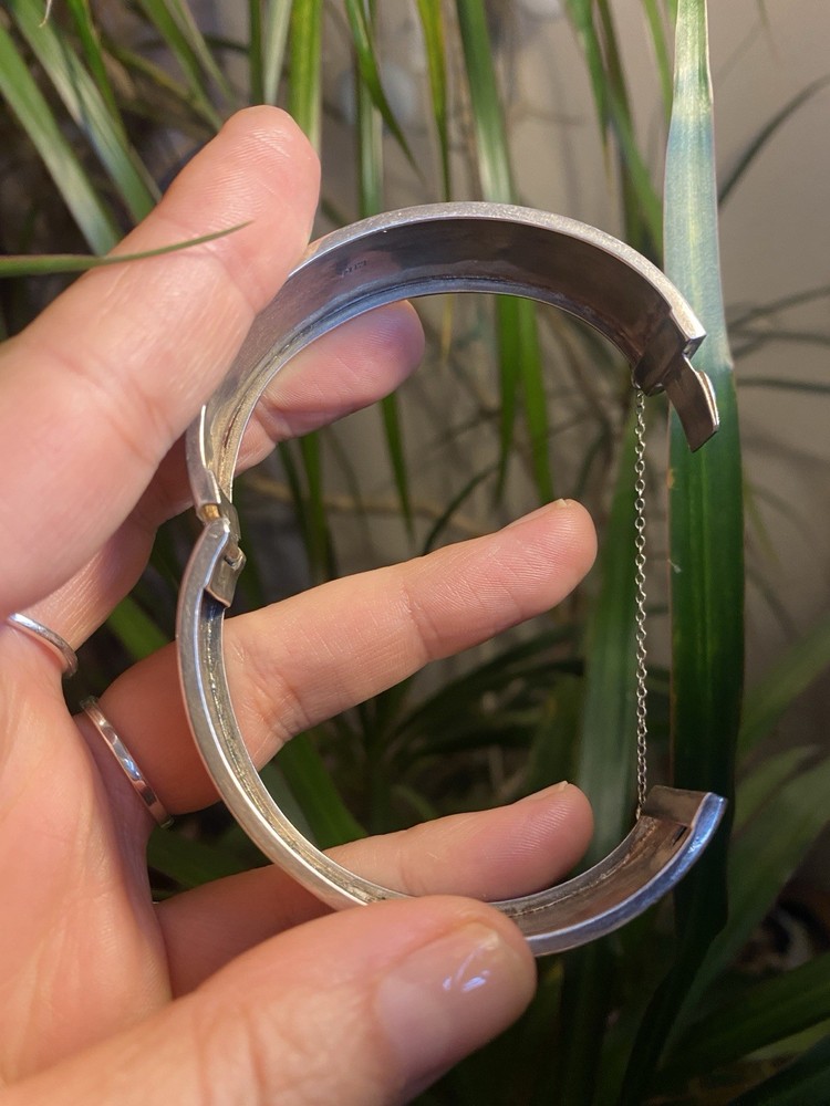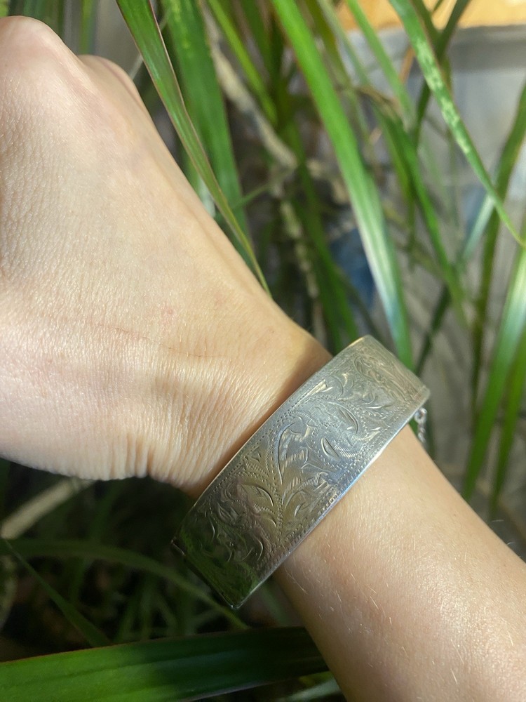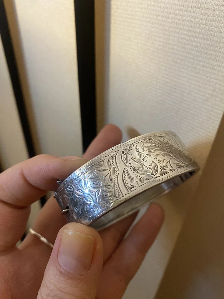 A beautiful antique sterling silver hinged bangle bracelet with traditional Victorian bright-cut engraving. The bracelet carries British hallmarks, including: • Lion Passant – indicating sterling silver (.925) • Anchor – mark of the Birmingham Assay Office • Date letter (stylised “E”, appears similar to a reversed 3) – Birmingham date cycle • Additional NORCO trade / retailer mark The anchor and lion passant combination confirms the piece was assayed in Birmingham, England as sterling silver. Based on the engraving style and hinged construction, the bracelet most likely dates to the late Victorian to early Edwardian period (circa 1880–1905). The front features delicate bright-cut floral engraving, a style commonly used on Victorian sentimental jewellery. ⸻ Details • Metal: Sterling Silver (.925) • Assay Office: Birmingham, England • Period: Victorian / Early Edwardian (approx. 1880–1905) • Weight: 23 grams • Type: Hinged bangle bracelet • Decoration: Hand engraved floral pattern • Closure: Hinged with clasp • Condition: Good antique condition with light wear consistent with age. ( some marks visible in pictures)