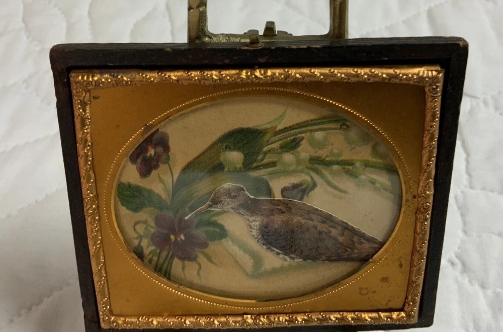 Up for sale is a vintage antique Victorian trade card ephemera framed. Half antique union case. Blackish brown. The Victorian ephemera trade card design is a flowers, leaves, bird. (Cut to size). The colors are off white, green, white, violet, brown, beige, multi. Original Victorian art. This has been put together by me. The union case and the Victorian trade card are antique/vintage. Gold detailed frame and mat around the die cut. Under glass. This union case finish is a blackish brown and has been touched up by me. Measures 3 5/8โ by 3 1/4โ by 1/4โ. Very, very good condition. ๐ผ๐ฆ๐บ Thanks and happy shopping. I will combine shipping. Payment due within three days. Please visit my ebay store: webbsamericancounry1 for over 2000 vintage and collectible items.