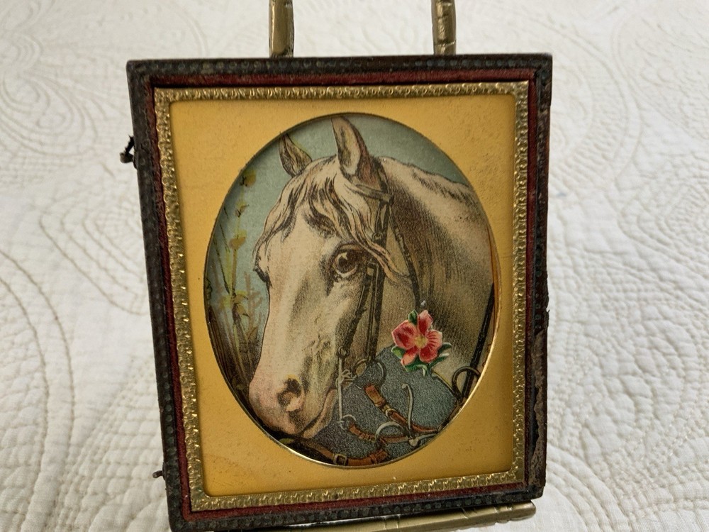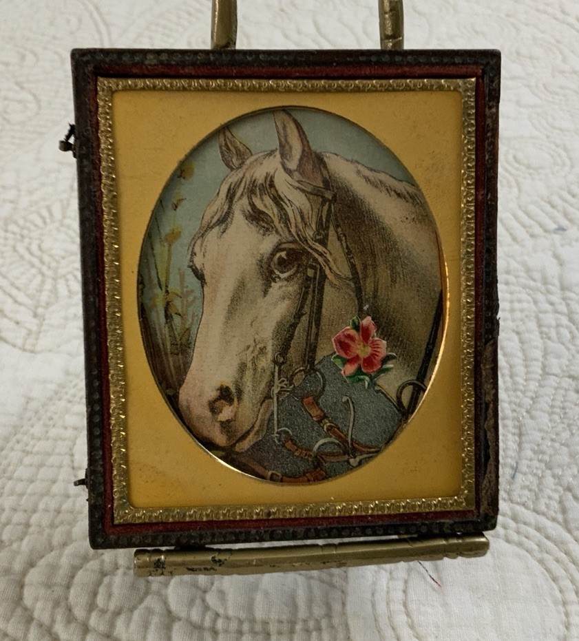 Up for sale is a vintage antique Victorian trade card ephemera framed. Half antique union case. Blackish brown. The Victorian ephemera trade card is a horse with flower. Cut to size. So adorable. The colors are off white, beige, pink, green, light blue, brown, multi. Original Victorian art from late 1800’s. This has been put together by me. The union case and the Victorian ephemera are antique/vintage. Gold detailed frame and mat around the die cut. Under glass. I have touched up this Union case. This union case finish is a blackish brown and has been touched up by me. Original little o’s on the side. This union case has almost no damage. Measures 3 3/4” by 3 1/8” by 3/8”. Very, very good condition. 🌼🦜🌺 Thanks and happy shopping. I will combine shipping. Payment due within three days. Please visit my ebay store: webbsamericancounry1 for over 2000 vintage and collectible items.