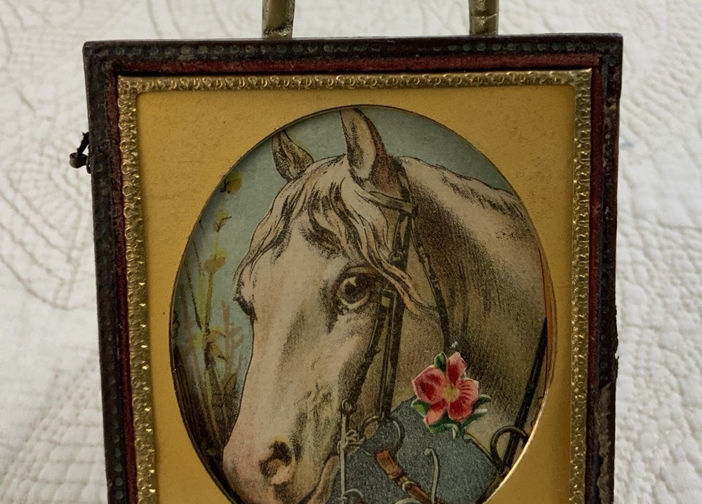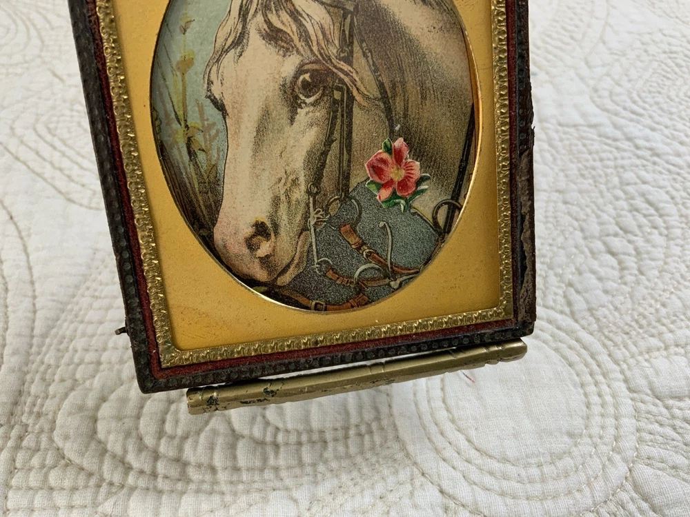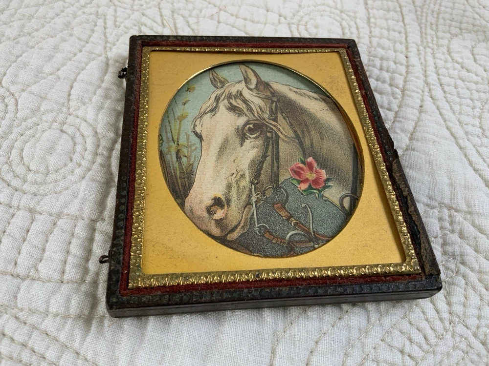 Antique Victorian Trade Card Ephemera Framed, Half Union Case, Horse With Flower