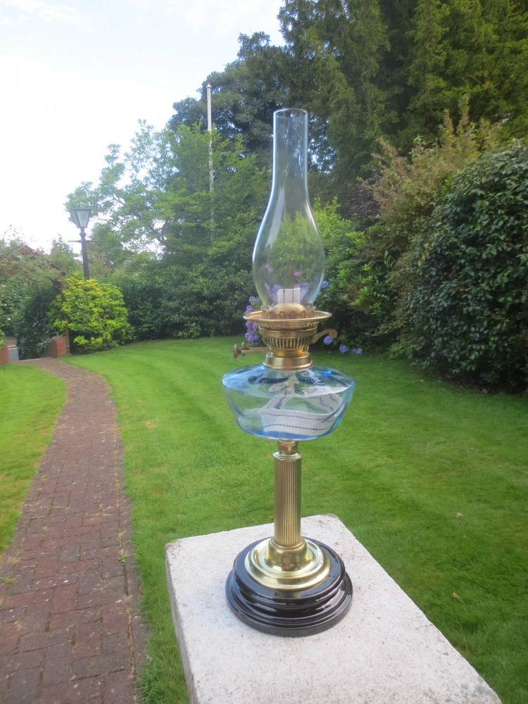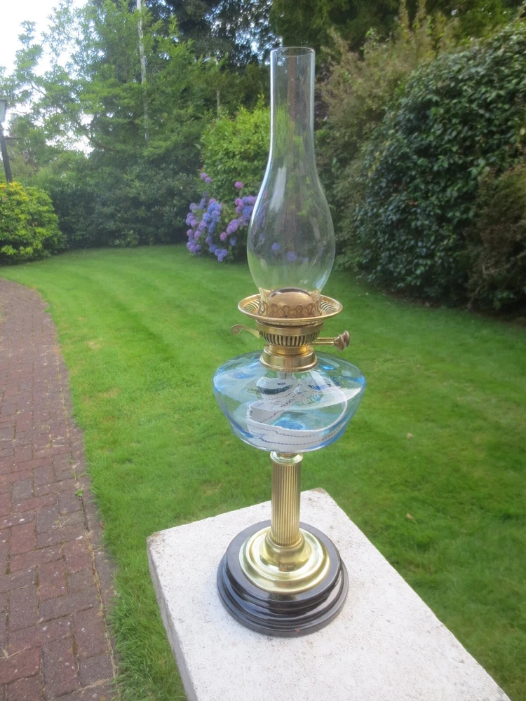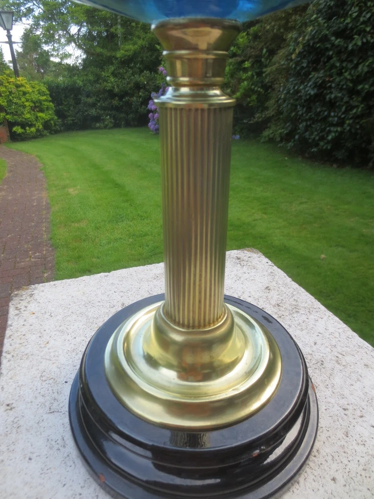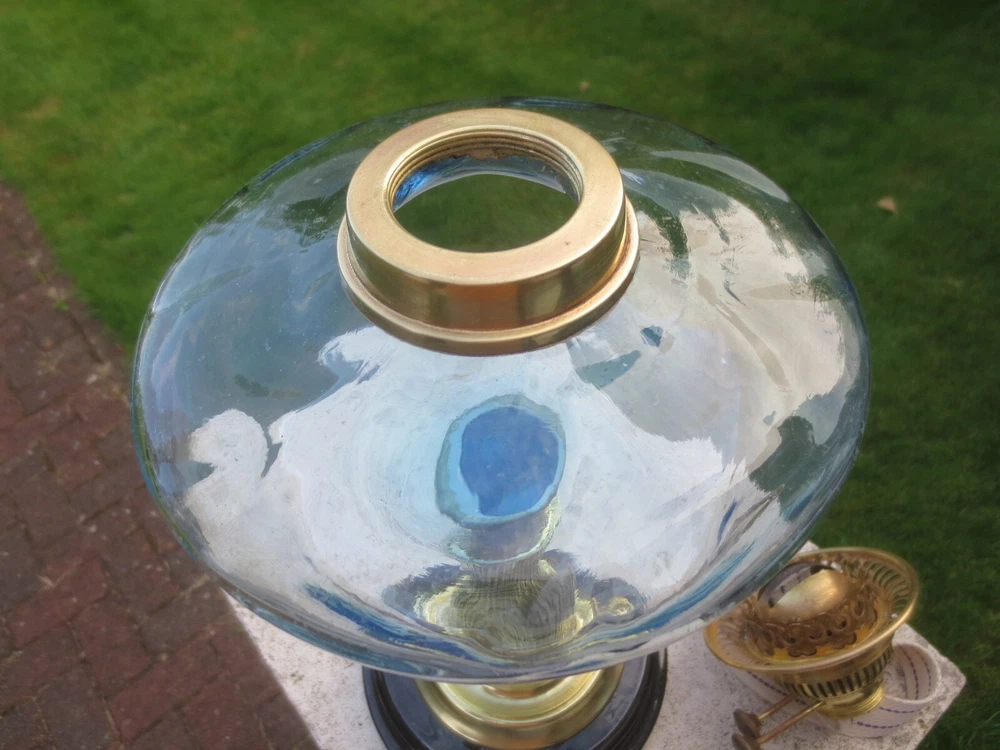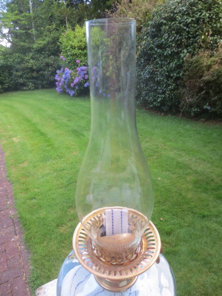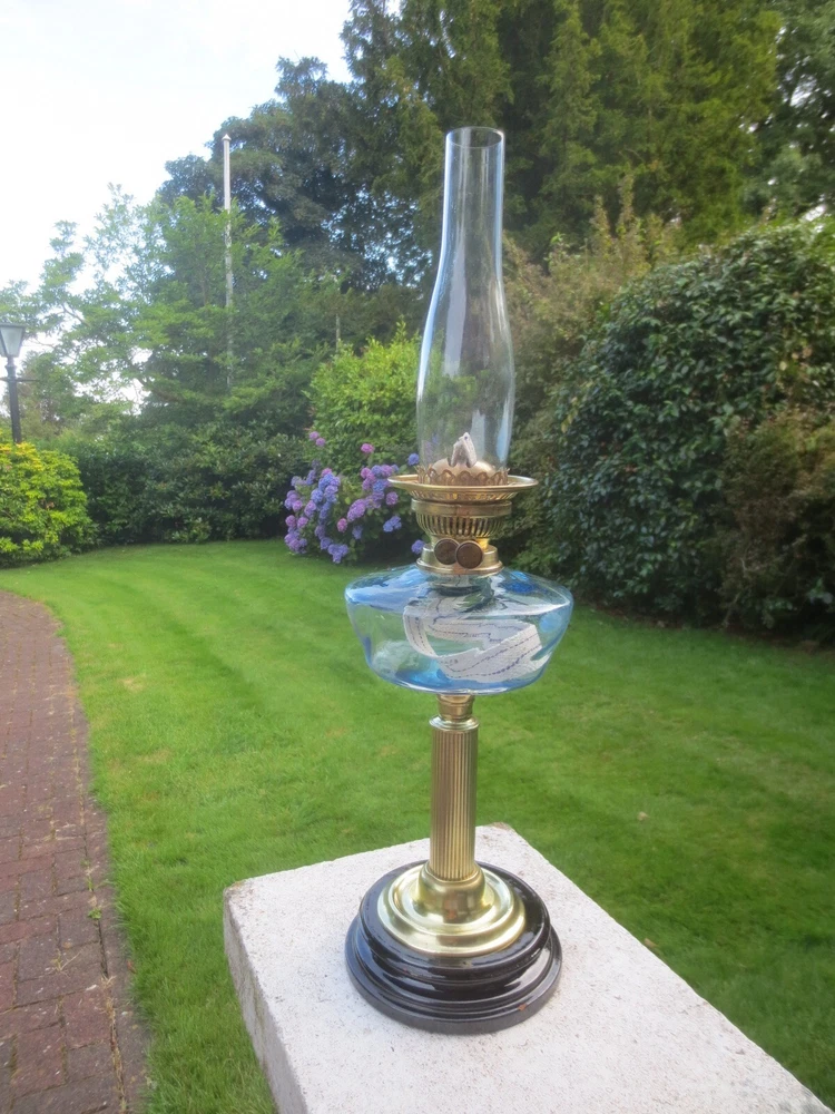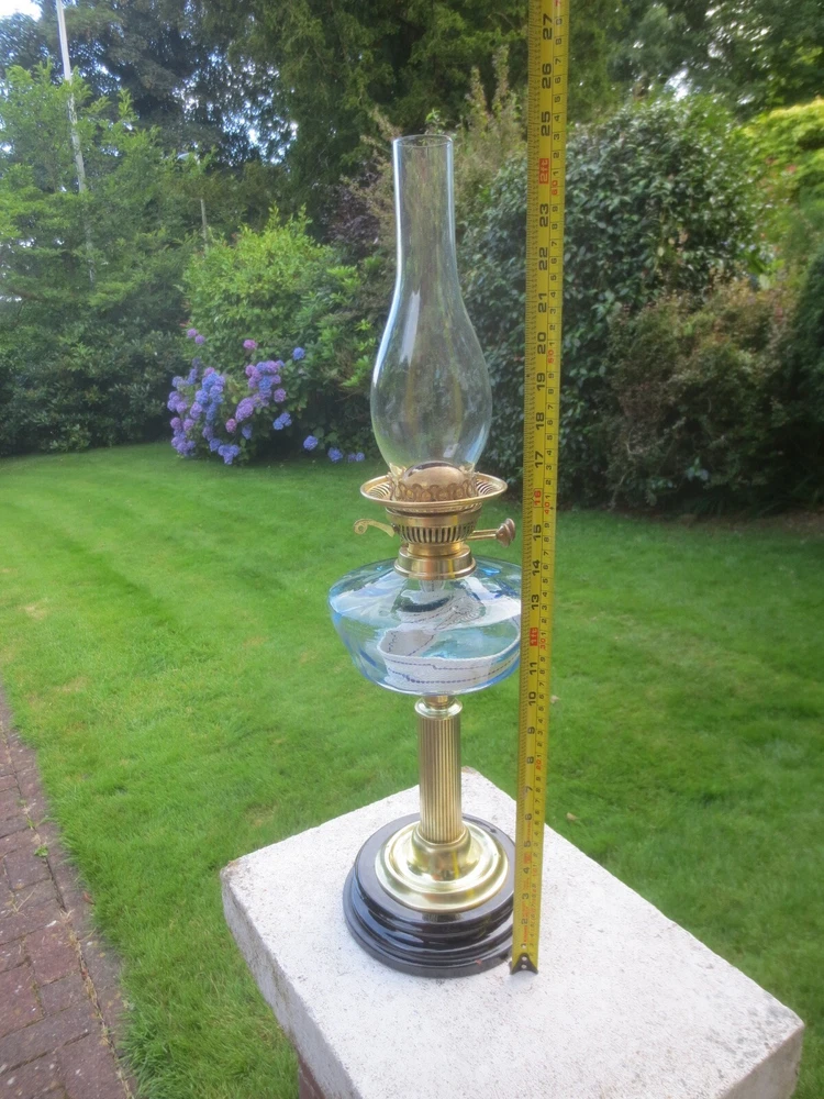 Total height of lamp is approx 25 1/2" UP FOR AUCTION IS THIS OLD BRASS TABLE OIL LAMP, COMPLETE WITH CHIMNEY. THE LAMP IS COMLETE AND FULLY WORKING. THE CHIMNEY HAS A LINE MANUFACTURING FLAW NEAR THE TOP AS SHOWN BRASS AND GLAZED TERRACOTTA BASE- THERE ARE SOME CHIPS AS SHOWN BLUE GLASS FONT ENGLISH MAKE TWIN DUPLEX BURNER, COMPLETE WITH FLAME EXTINGUSHER. IT HAS FULLY WORKING WICK WINDERS AND HAS BEEN FITTED WITH A NEW LENGTH OF COTTON WICK OVAL BULGE CHIMNEY THE LAMP WILL BE WELL PACKED AND EASCH PART BUBBLE WRAPPED SEPERATLY. International Buyers – Please Note: Import duties, taxes, and charges are not included in the item price or shipping cost. These charges are the buyer's responsibility. Please check with your country's customs office to determine what these additional costs will be prior to bidding or buying. FOR CORRECT OVERESEAS POSTAGE PLEASE CONTACT ME. FOR MORE PHOTO'S OR INFORMATION PLEASE EMAIL THERE ARE AGE RELATED MARKS, DENTS, SPLITS AND IMPERFECTIONS ASSOCIATED WITH ANTIQUE PARTS. PLEASE NOTE, ANTIQUES WHICH ARE MANY YEARS OLD WILL NOT BE IN BRAND NEW AND UNTOUCHED CONDITION. ANY MAJOR DAMAGE OR FAULTS I WILL TRY AND POINT OUT. EVEN WHEN THEY ARE IN GREAT CONDITION, THEY WILL HAVE SOME WEAR COMMENSURATE WITH THEIR AGE AND USE. PLEASE TAKE THIS INTO ACCOUNT. . FOR THE CORRECT OVERSEAS POSTAGE PLEASE CONTACT ME AS ALL DESTINATION PRICES VARY THERE IS WICK WITH THE LAMP.