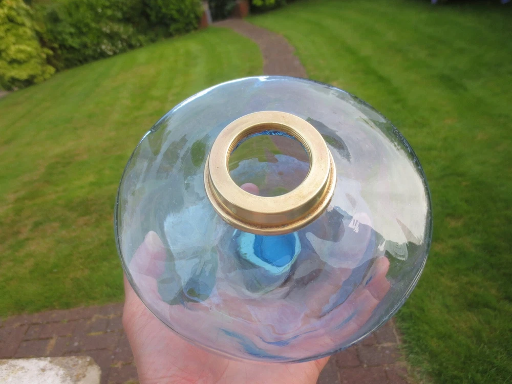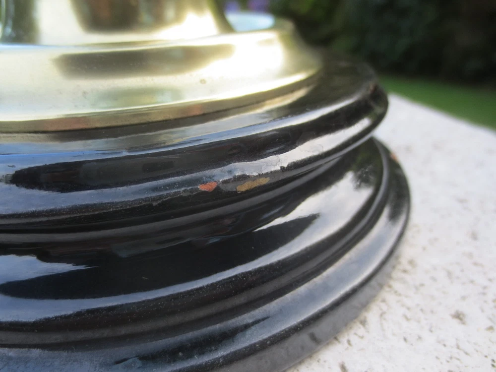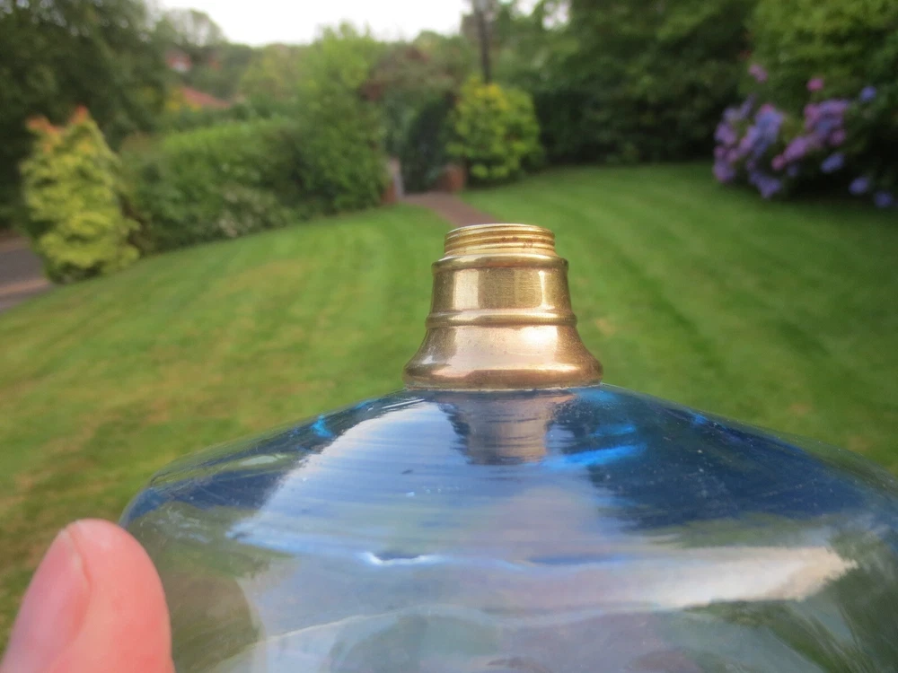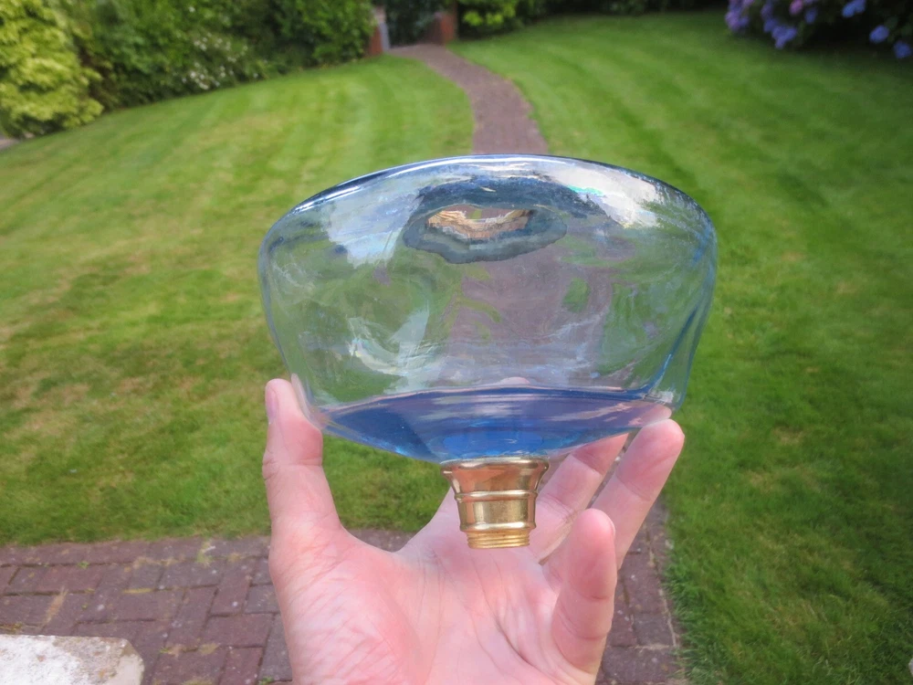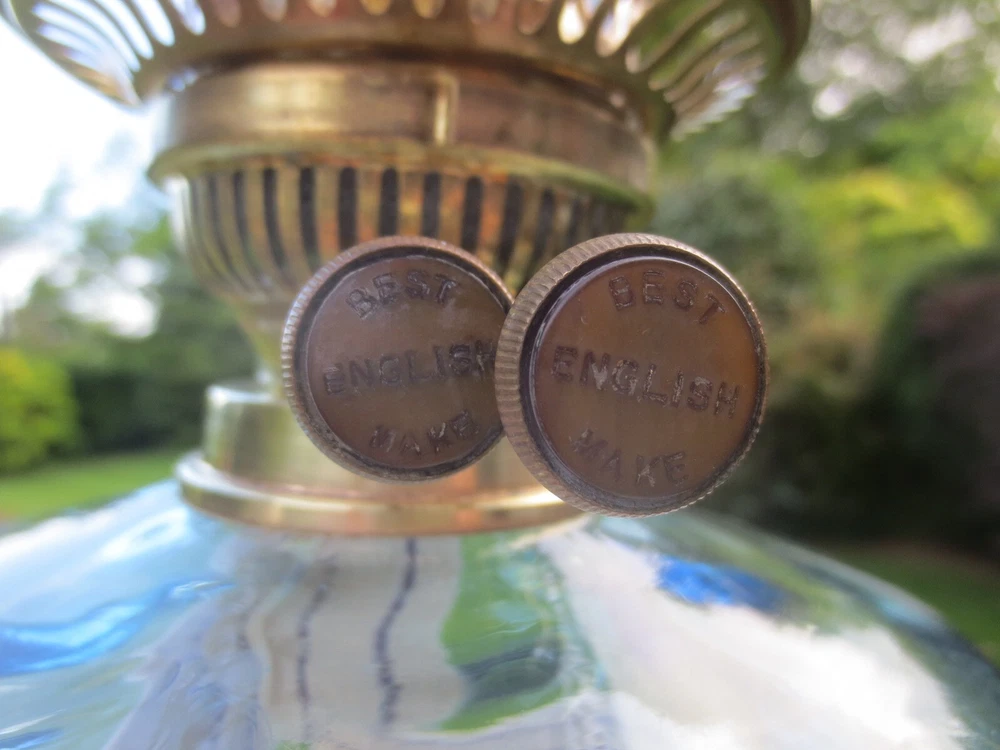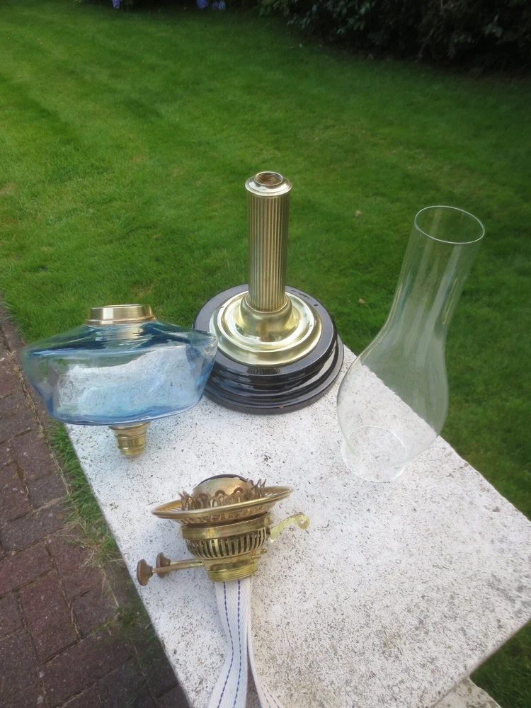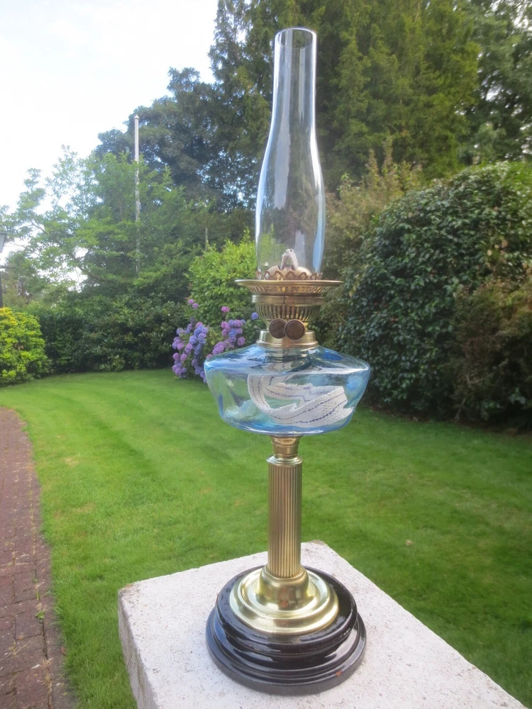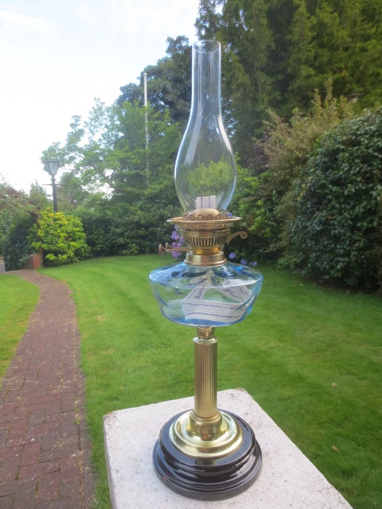 Total height of lamp is approx 25 1/2" UP FOR AUCTION IS THIS OLD BRASS TABLE OIL LAMP, COMPLETE WITH CHIMNEY. THE LAMP IS COMLETE AND FULLY WORKING. THE CHIMNEY HAS A LINE MANUFACTURING FLAW NEAR THE TOP AS SHOWN BRASS AND GLAZED TERRACOTTA BASE- THERE ARE SOME CHIPS AS SHOWN BLUE GLASS FONT ENGLISH MAKE TWIN DUPLEX BURNER, COMPLETE WITH FLAME EXTINGUSHER. IT HAS FULLY WORKING WICK WINDERS AND HAS BEEN FITTED WITH A NEW LENGTH OF COTTON WICK OVAL BULGE CHIMNEY THE LAMP WILL BE WELL PACKED AND EASCH PART BUBBLE WRAPPED SEPERATLY. International Buyers – Please Note: Import duties, taxes, and charges are not included in the item price or shipping cost. These charges are the buyer's responsibility. Please check with your country's customs office to determine what these additional costs will be prior to bidding or buying. FOR CORRECT OVERESEAS POSTAGE PLEASE CONTACT ME. FOR MORE PHOTO'S OR INFORMATION PLEASE EMAIL THERE ARE AGE RELATED MARKS, DENTS, SPLITS AND IMPERFECTIONS ASSOCIATED WITH ANTIQUE PARTS. PLEASE NOTE, ANTIQUES WHICH ARE MANY YEARS OLD WILL NOT BE IN BRAND NEW AND UNTOUCHED CONDITION. ANY MAJOR DAMAGE OR FAULTS I WILL TRY AND POINT OUT. EVEN WHEN THEY ARE IN GREAT CONDITION, THEY WILL HAVE SOME WEAR COMMENSURATE WITH THEIR AGE AND USE. PLEASE TAKE THIS INTO ACCOUNT. . FOR THE CORRECT OVERSEAS POSTAGE PLEASE CONTACT ME AS ALL DESTINATION PRICES VARY THERE IS WICK WITH THE LAMP.