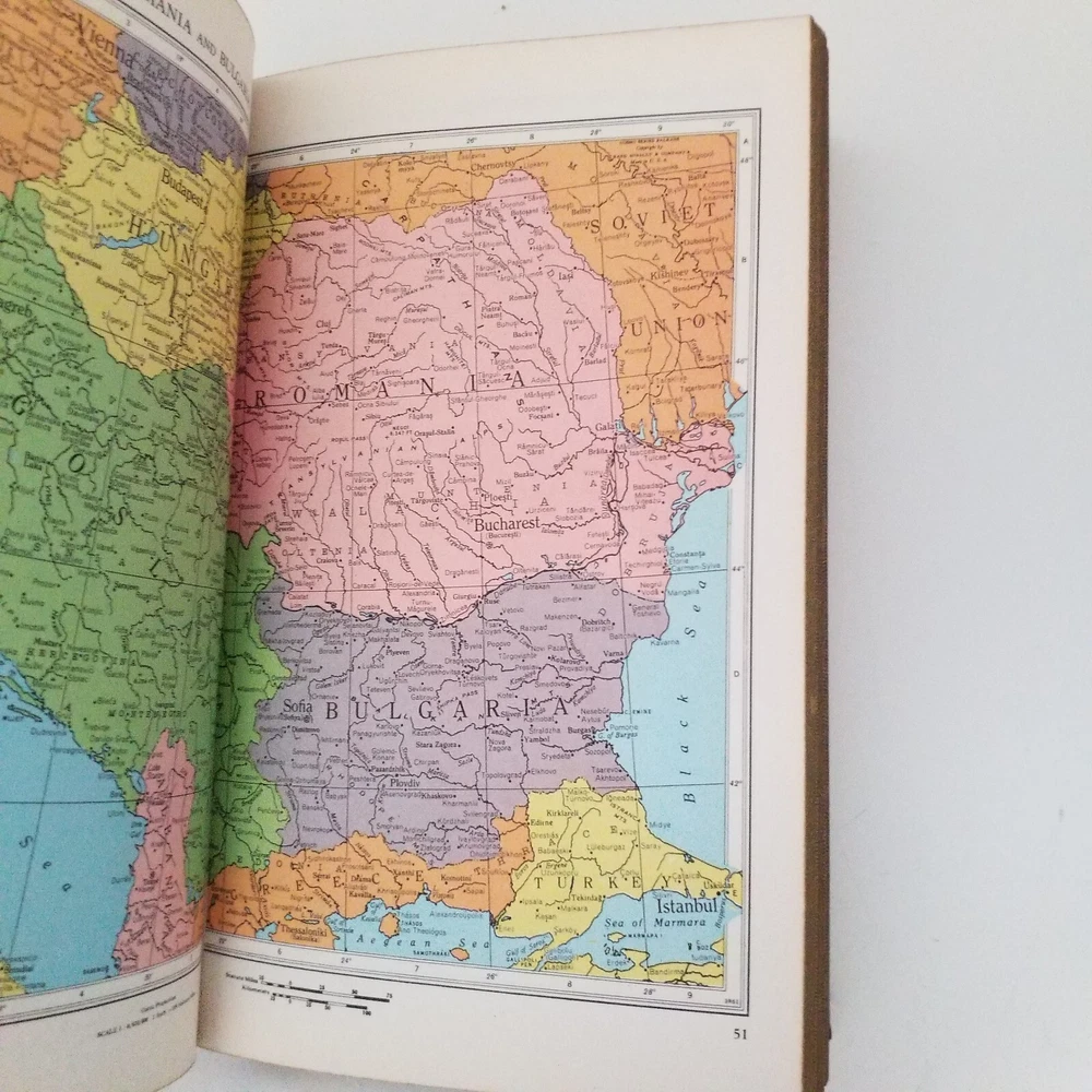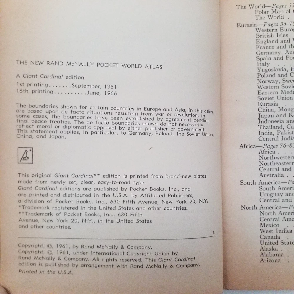 This antique vintage Rand McNally Pocket World Atlas Book, published in 1961, is a must-have for collectors and enthusiasts of antique maps and atlases. This book is a great reference piece for anyone interested in the world's geography, with detailed maps of various countries accompanied with informative text. Color world maps. The book's publisher, Rand McNally, is well-known for producing high-quality maps and atlases, and this pocket world atlas is no exception. It is perfect for those interested in collecting antique maps and atlases or for anyone who wants to add a unique piece to their collection. Shipped via USPS media mail Tags: collection collector book library travelers student scholastic