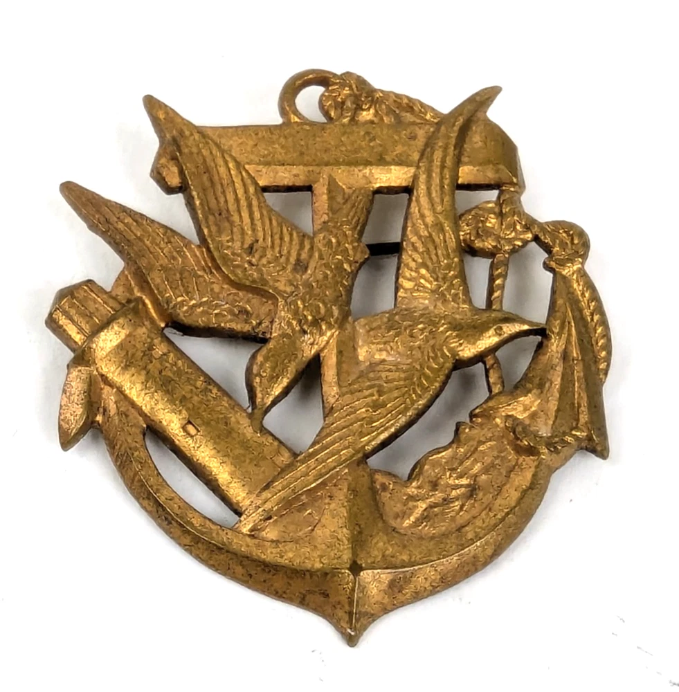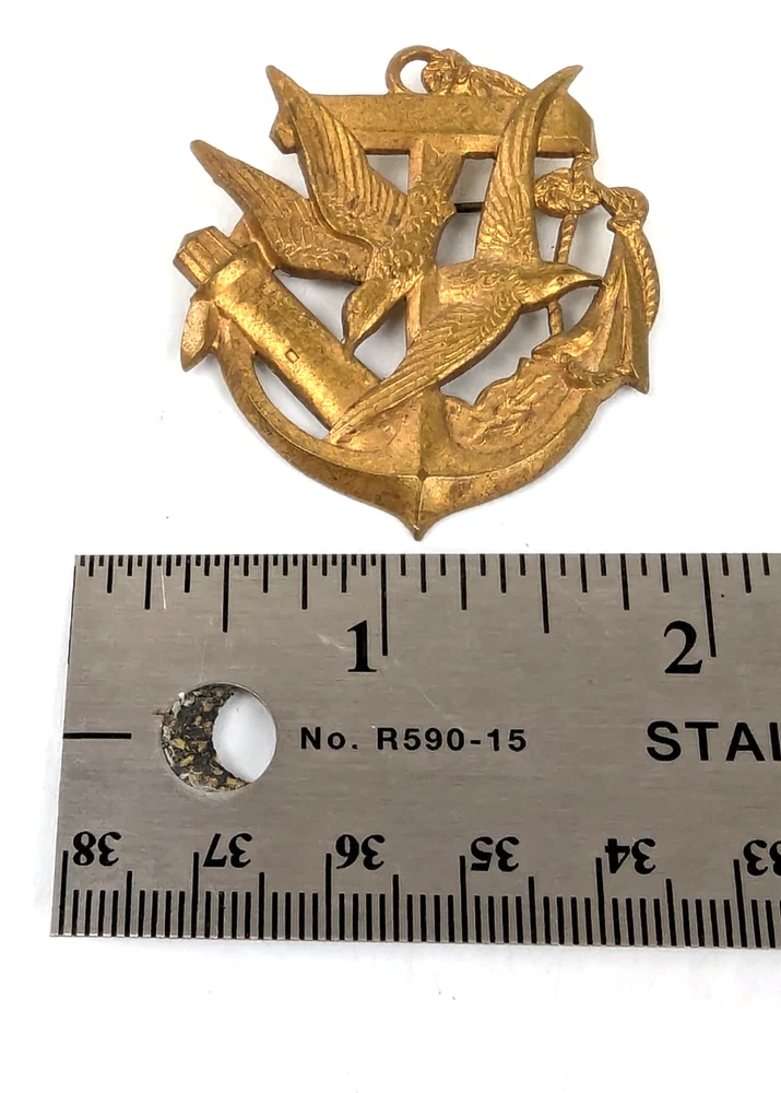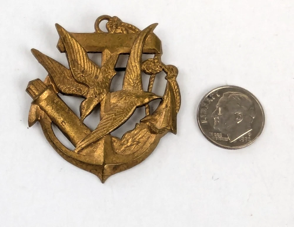 Antique World War II Era Navy Brooch Pin Cap Badge. Features two Swallows and Anchor. Measures 1 7/8" by 1 3/4" Closes with a C clasp. 5105