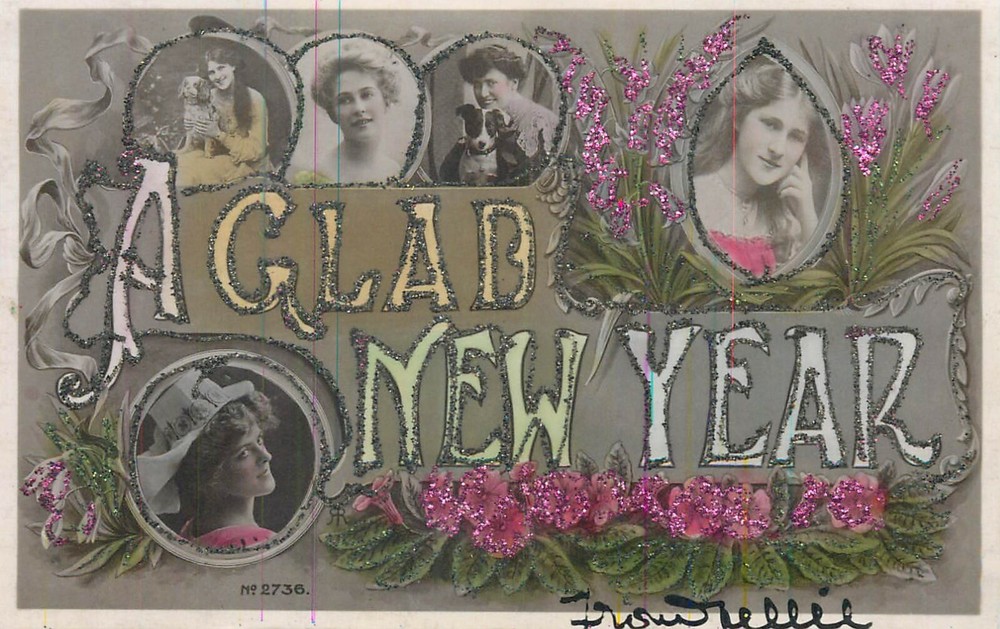 Antique silver print postcards set of 2 vintage new year good luck ladies greetings
