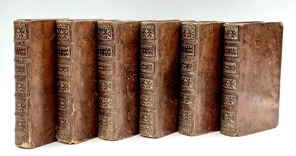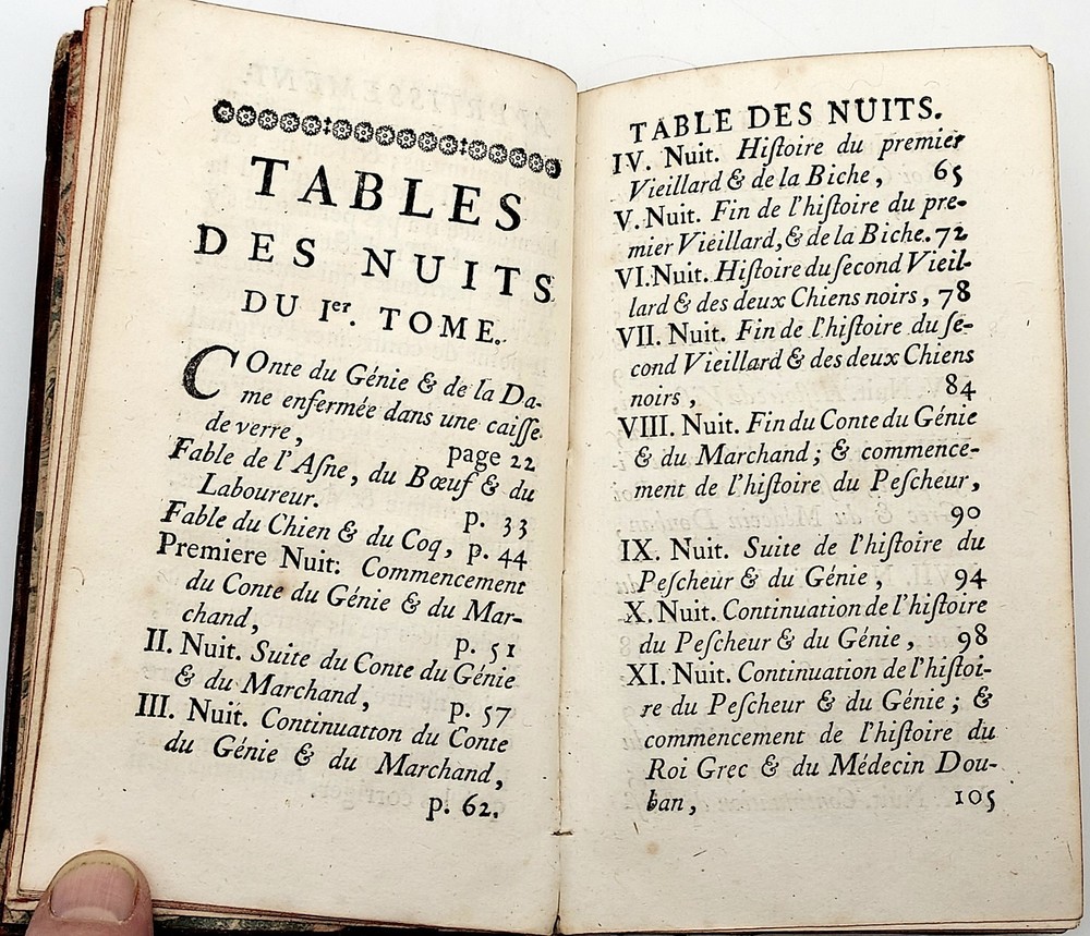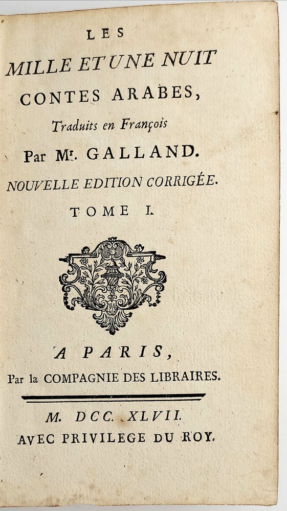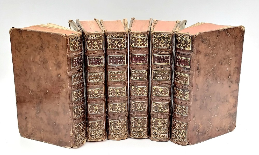 Nouvelle édition corrigée _____________________________ A Paris , par la Compagnie des Libraires , 1747 Six volumes in 12°, reliure d'époque plein veau marbré, tranches rouges. (18) 461, (14) 464, (12) 557, 501 (1), (1) 552 et (1) 548 (3) pages. Une des premières éditions collectives en six volumes, avec la faute à "NUIT" sans "S" au titre (l'originale en 12 volumes fut édité entre 1704 et 1717). C'est à la fin du XVIIe qu'un diplomate en poste à Constantinople demande à son secrétaire Antoine Galland de collecter des informations sur l'empire Ottoman. En 1701 des amis d'Alep envoient à Galland un épais manuscrit pour le distraire, il s'agit du premier tome des Mille et une nuits que celui-ci traduira brillamment. Le recueil dont dispose Galland s'arrête à la 282e nuit et pour compléter l'ensemble, Galland se rend soir après soir chez un de ses amis Syrien à Paris pour recueillir de sa bouche les contes manquants (ces contes se révèleront très proches des originaux, dont beaucoup ne figurent pas dans l'oeuvre originale des Mille et une nuits ). L'oeuvre eut en France un grand retentissement et donnera naissance à une grande vague d'orientalisme en France, dans les spectacles et la littérature ; ses personnages, tel Sinbad, acquereront rapidement une notoriété universelle. On sait depuis la fin du XIXe que ces contes ont une origine indienne, depuis qu'une étudiante américaine avait découvert un mystérieux manuscrit évoquant Shéhérazade et les Mille et une nuits et qui remontait à 878. Reliures usagées : coiffes arasées avec un petit manque en queue du premier volume, coins souvent émoussés, certains mors partiellement fendus (tomes I, II et VI). Ex libris moderne répété dans les contreplats des six volumes. St.Bib6 Listing and template services provided by inkFrog