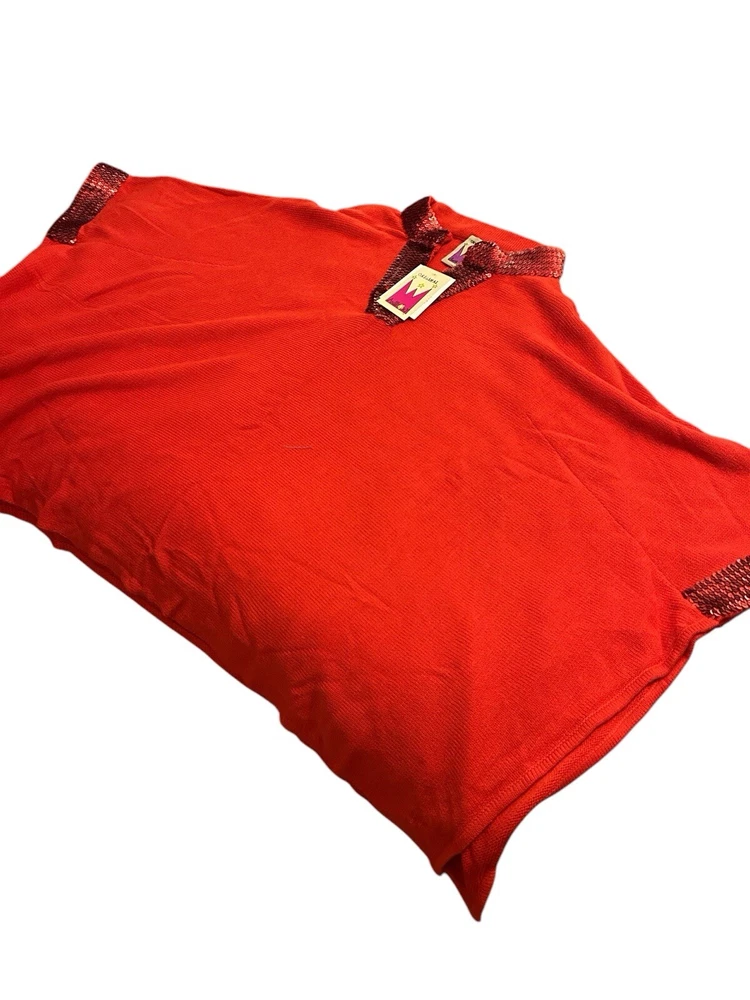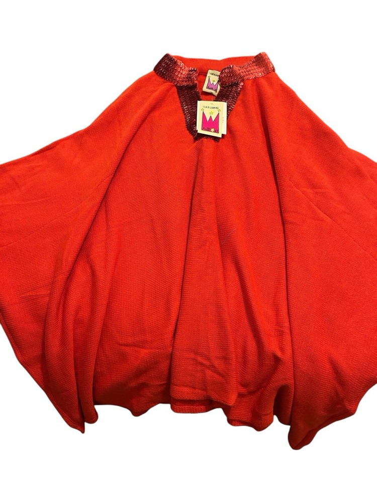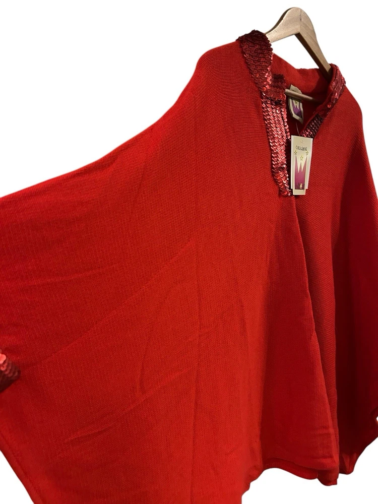 This is a vintage Anttony Design Originals pullover poncho for women, featuring a V-neckline, long sleeves, and a solid red color. Made of breathable acrylic material with sequin accents, this woven poncho has a sparkly look and a lagenlook style. It is brand new with tags and is designed in a regular size for women.