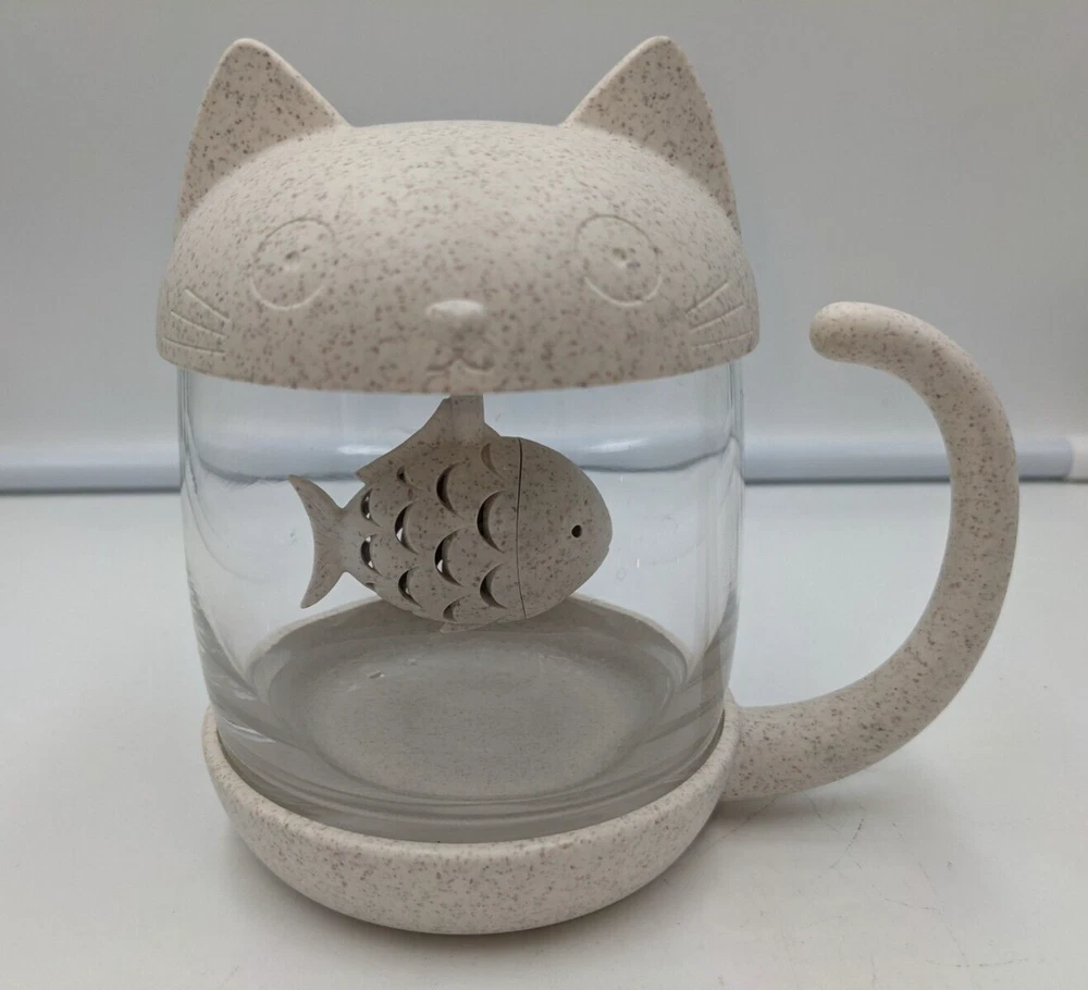 This is a cute glass cat mug (his head is the lid to the cup and the tail is the handle) with an infuser for tea in the shape of a fish. It is a beige color and clear glass and will hold about 8 ounces. I am a careful and thorough packer, but for some of the items I sell, I’m not able to use combined shipping because of their size or propensity to break if put into a box with other items. If you purchase more than one item from my store and ask for combined shipping, I will do my best to accommodate your request. I will accept any reasonable offer so please feel free to send your offer. T hank you for visiting my store. I hope to see you again soon!