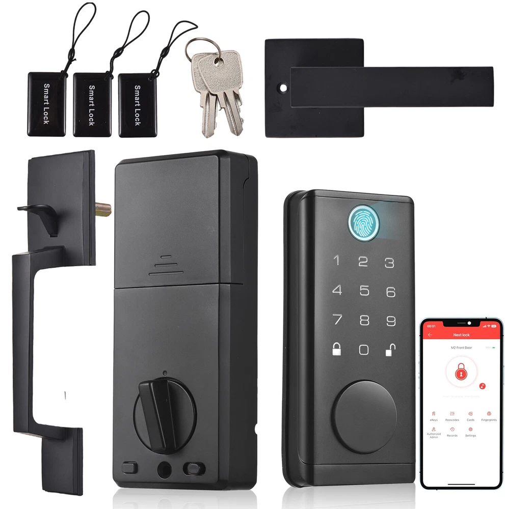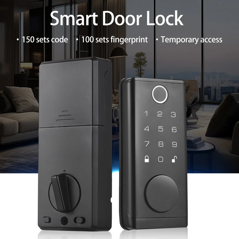 Keyless entry door lock with built-in Wi-Fi allows fingerprint, smartphone APP, digital code, IC card and keys to enter. Allows to create and manage up to 150 access codes and 100 access fingerprints, and temporary access for visitors. Built-in alarm technology low battery warning. Zinc alloy anti-pry lock body, suitable for door thickness from 1-3/8 inch (35 mm) to 1-31/32 inch (50 mm). Features: 【Smart Lock with 5 Entry Method】 Keyless entry door lock with built-in Wi-Fi allows fingerprint, smartphone APP, digital code, IC card and keys to enter. Convenient APP remote control and more secure biometric fingerprint recognition. 【Support Temporary, Multi-person and Multi-scenario Use】 Smart door lock allows to create and manage up to 150 access codes and 100 access fingerprints, and temporary access for visitors. Widely used for home entry door, hotel, office, ect. 【Safety Alarm】 Electronic door lock built-in alarm technology. It will alarm if anyboby enter the wrong password multiple times. Support Battery operated and USB emergency charging, while the low battery indicator offers advanced warning for battery replacement. 【Anti-theft Security Deadbolt Lock】 Security door locks with strengthened and thickened zinc alloy anti-pry lock body, no fear of violent lock collision and lock picking, anti-peeping user code protection, locked automatically when close the door, effective home protection and anti-theft. 【Easy to Install with Complete Accessories】 Keypad door lock with handle set are easy to install with full accessories,you just need to prepare a screwdriver and 4*AA batteries(package not include). Suitable for door thickness from 1-3/8 inch (35 mm) to 1-31/32 inch (50 mm). Specifications: Material: ABS + zinc alloy Product color: Black Waterproof: IP67 Fingerprint recognition: ≤0.5s False recognition rate: ≤0.001% True rejection rate: ≤0.01% Fingerprint storage: 100 sets Code storage: 150 sets Unlock method: Fingerprint, code, BT, card, key Charging method: 4*AA battery(not include) Package Size: 39 * 26.3 * 9cm / 15.3 * 10.3 * 3.5in Package Weight: 2.06kg / 4.5lbs Packing List: 1 * Front lock 1 * Rear lock 1 * Front door handle 1 * Rear door handle 2 * keys 3 * Cards 1 * Installation tool set 1 * Instructions 1 * Installation size card