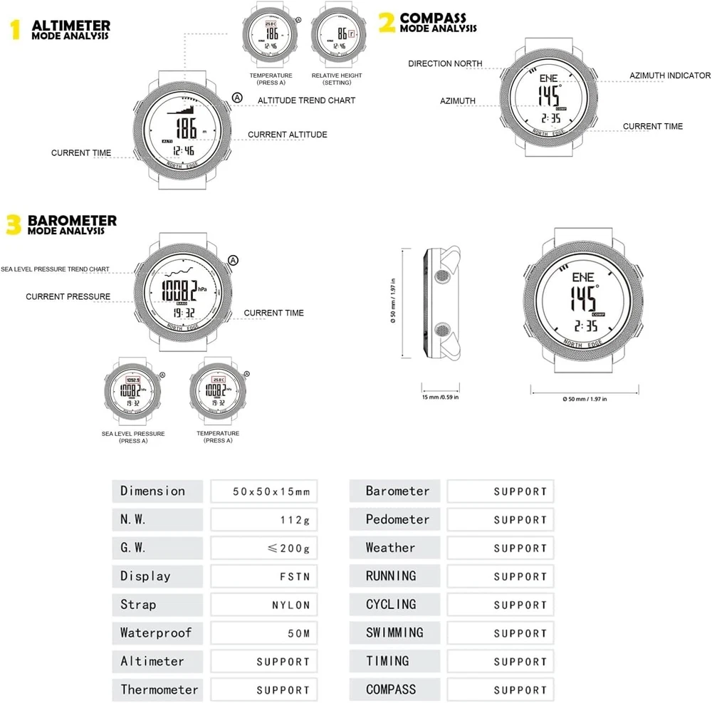 Apache Tactical Sports Watches for Men , Outdoor Survival Military Compass Rock Solid Digital Watches with Durable Band, Steps Tracker Pedometer Calories Green… ++Battery life :18 s +Function Brief:Compass, Altimeter,Barometer , Thermometer,Weather Forecast, World Time,Dual Time,Pedometer, calorie, distance record,2 sets alarm,Countdown timer ,Stopwatch, EL Backlight. Materials: Solid metal case with durable and breathable nylon band(1set extra silicone band for exchange ) ,Japenese battery. (CR2032 18s life). Watch Size: Diameter: 50mm/; thickness: 16mm/; width of band: 24mm/; net weight: 117g/(since it is a little big and heavy ,please kindly check if it meet your needs) Waterproof: 50M waterproof, means you could wearing it for swimming (not diving), don't push the button when it is under water, also do not wearing it for hot water bath, it will reduce its life span. Package Include: Watch X1; manual X1, extra silicone band X1, packed in a black square gift box. FUNCTION 1, Altimeter (altitude trend chart and climb rate) 2, Barometer ( air pressure trend chart) 3, Compass 4, Thermometer 5, Weather Forecast, World Time 6, Pedometer, step counter, calorie, distance record 7, Time functions: hour, minute, second, (2000-2099), , date, weekday, 8, Alarm clock (2 sets alarm clock, ) 9, Countdown timer (99:59:59~0) 10, Stopwatch (0~:59:59), 12, Worldtime functions 13, Corporates digital compass, altimeter, barometer, Thermometer, air pressure trend and altitude trend and altitude trend 14, Button tone on or off 15, Battery life remind 16, EL Backlight