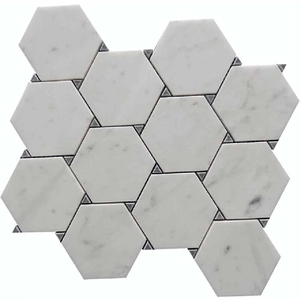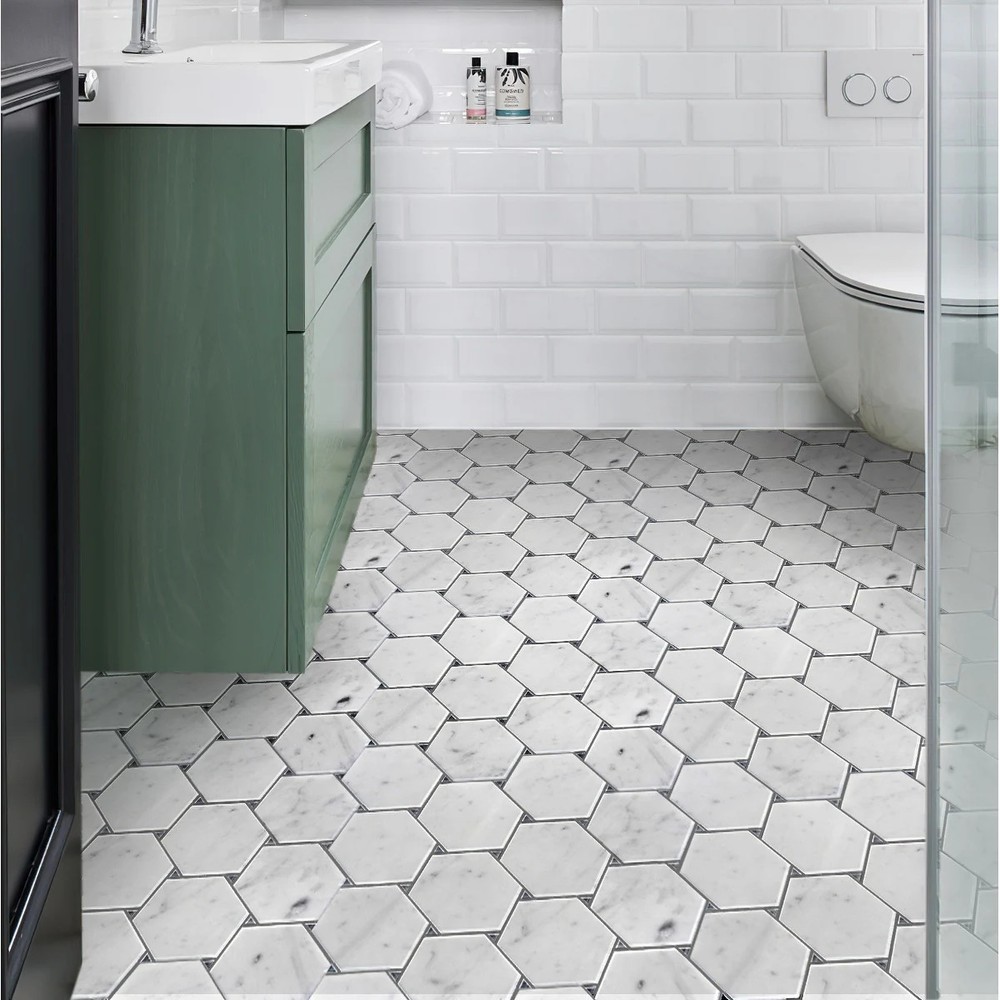 Love how these hex tiles instantly elevate my bathroom with a luxe yet timeless look! The polished Bianco Carrara and Bardiglio marble blend beautifully, adding subtle Art Deco flair. The honeycomb pattern feels fresh but classic, and the slight 3D effect makes the floor pop. Perfect for anyone wanting vintage charm with modern sophistication—durable, stylish, and totally worth it!