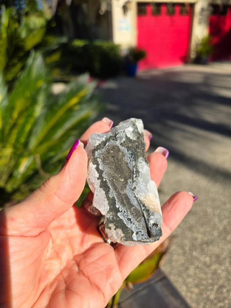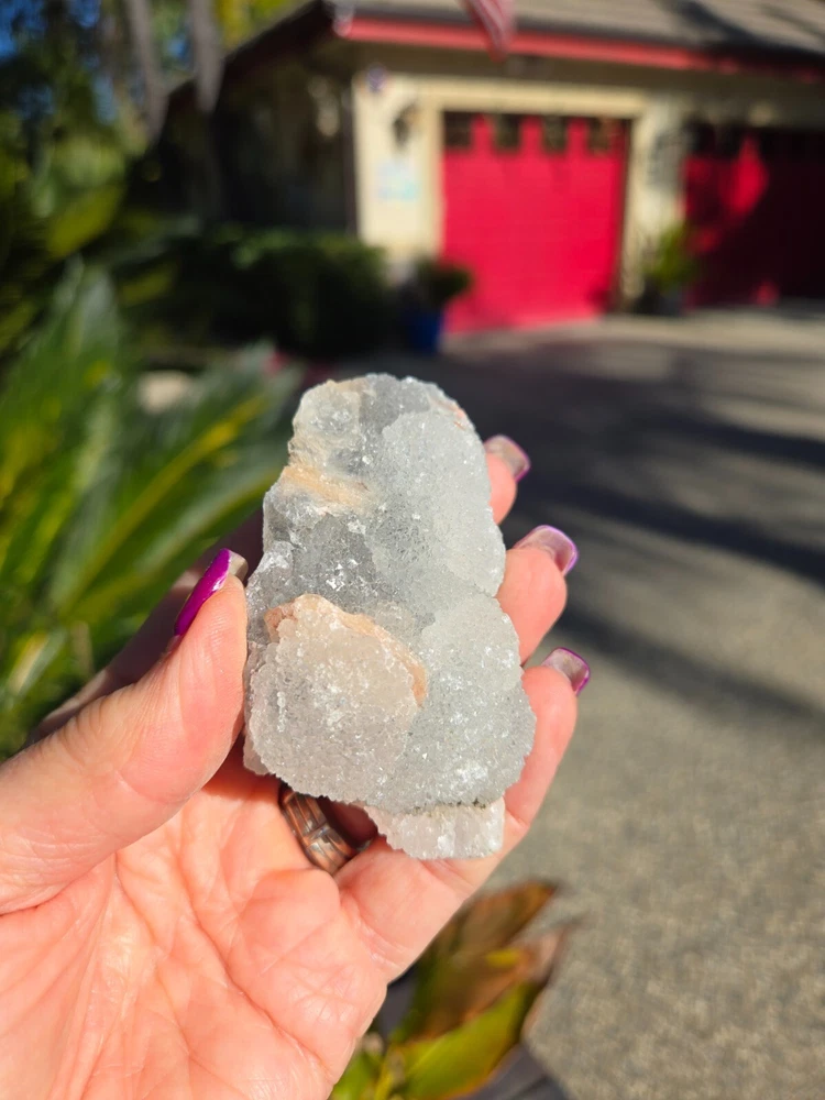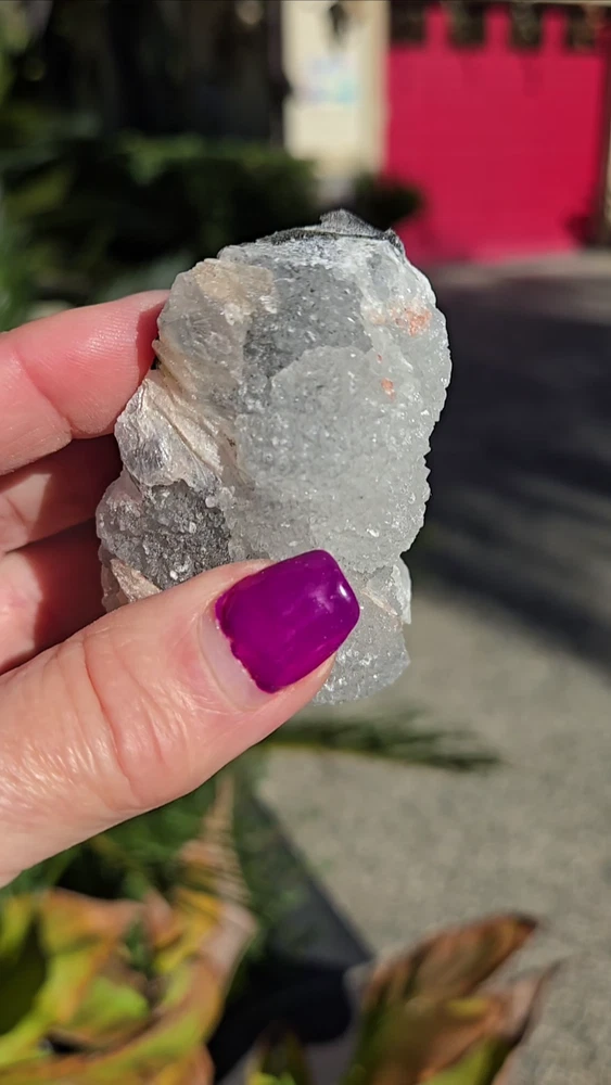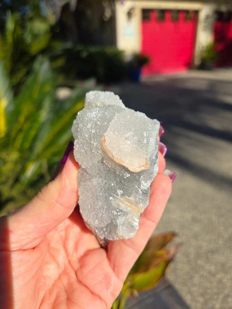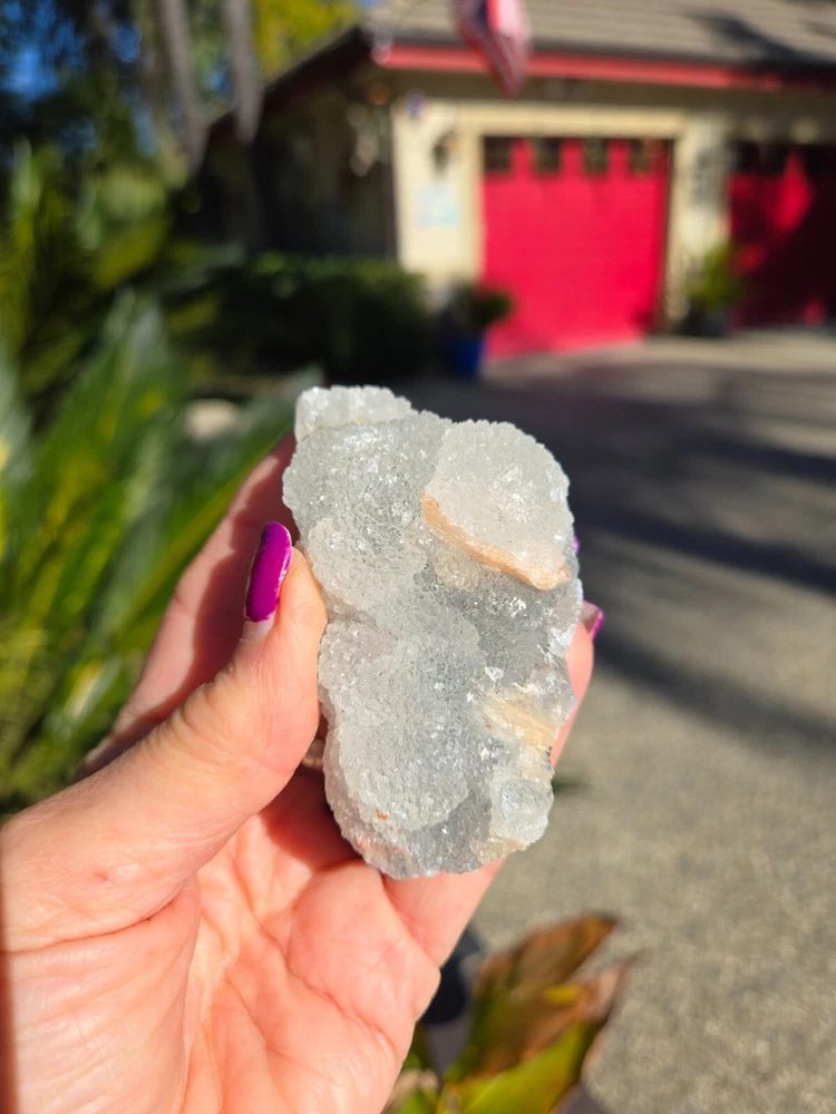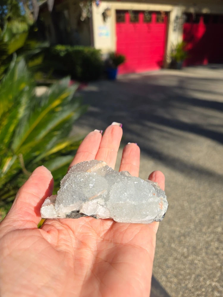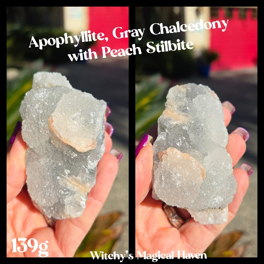 This unique combination of Apophyllite, Grey Chalcedony, and Peach Stilbite Zeolite forms a powerful triad of spiritual energies, harmonizing the mind, heart, and spirit. Together, they create an energy of serenity, intuition, and deep emotional healing, making this mineral specimen a beacon of tranquility and spiritual growth. Apophyllite is a crystal that’s usually clear, white, yellow, pink, green, brown or violet in color. It can also be transparent or opaque. Although this crystal is not widely known, it is, in fact, widespread in all parts around the world. It can be found in various formations, often in volcanic sites around other minerals. Zeolite is a complex mineral which forms in the contact of volcanic lava and water. This process can take thousands or even millions of years; scientists estimate that the first zeolite minerals formed over 300 million years ago. Stilbite is a sodium calcium hydrous aluminum silicate that is a member of the family. This mineral crystallizes in the form of thin flattened plates, tabular crystals, as well as aggregates. Its commonly found in association with Apophyllite and Heulandite within basalt and other volcanic rock. From India. 100% genuine gemstone, variations of size, shape and color are expected. Approx. 139g 3 x 1.5 x 1.25 Metaphysical Properties Apophyllite (Clarity and Spiritual Connection) Apophyllite is known for its high vibrational energy, promoting clarity of thought, intuition, and spiritual awakening. It acts as a conduit between the physical and spiritual realms, enhancing meditation and deepening your connection to higher consciousness. This crystal radiates calming energies, clearing away mental fog and encouraging a state of peace and balance. Grey Chalcedony (Calm and Inner Stability) Grey Chalcedony carries a soothing energy that promotes emotional balance and inner harmony. Known for its nurturing qualities, it helps release self-doubt and encourages resilience in times of emotional turmoil. This stone’s grounding properties pair beautifully with Apophyllite's spiritual energy, creating a bridge between the higher realms and the Earth. Peach Stilbite (Gentle Emotional Healing and Joy) Peach Stilbite is a stone of love, compassion, and gentle emotional release. It helps heal emotional wounds and fosters an uplifting sense of joy and self-acceptance. Its energy is warm and supportive, promoting relaxation and a deeper understanding of your inner self. Combined Energies of the Specimen Emotional Healing : The Peach Stilbite gently soothes emotional distress, while Grey Chalcedony stabilizes and grounds your emotions. Spiritual Clarity : Apophyllite enhances your intuitive abilities, encouraging spiritual insights and connection to the divine. Stress Relief : The calming combination of these crystals creates a serene energy field, helping to reduce stress and foster inner peace. Balanced Energy : Together, these minerals harmonize the mind, body, and spirit, promoting a holistic sense of well-being. Why Add This Specimen to Your Collection? Meditative Support : Perfect for use during meditation to enhance focus, spiritual connection, and relaxation. Emotional Balance : A beautiful tool for navigating life’s challenges with grace and resilience. Decorative and Energetic Uplift : Its natural beauty brings both aesthetic value and high vibrations to your sacred space. This Apophyllite and Grey Chalcedony with Peach Stilbite Zeolite specimen is more than a mineral; it’s a harmonious blend of energies that invites calm, spiritual growth, and emotional healing into your life.