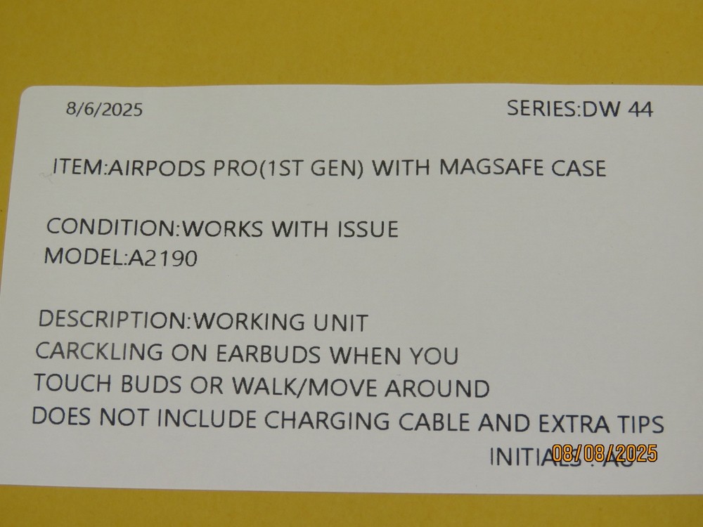 Apple AirPods Pro (1 GEN) with Wireless Charging Case - White [DW44] Functional Condition: Tested and Functional. ISSUE: CRACKLING SOUND WHEN YOU TOUCH BUDS OR WALK/MOVE AROUND Cosmetic Condition: This is a Used Item and Normal Wear (Scuffs & Scratches) is Expected. Items included in this listing: AIRPODS Items NOT included in this listing: CHARGER EXTRA EAR TIPS Thank you for Shopping with Us! ENJOY Free Shipping in USA & Low Cost Shipping to CANADA! Terms of Sale NOTE: Our Listings only include items as pictured - Please do not assume any item is included if its not pictured. We will try our best to picture all items included in this listing as well as its cosmetic condition. We Guarantee & Stand Behind our product and commitment to provide you with o nly Original, Branded, OEM & Genuine Products Shipping A complete and correct shipping address is essential. We cannot guarantee the shipping address can be changed after checkout. Sales Tax will be charged to all Canadian & USA Buyers. Combined shipping is not guaranteed. We are unable to change any content of your order based on the eBay checkout note or PayPal message. Customers with shipping addresses outside of the U.S.A and Canada are responsible for all duties and import taxes. Please contact your customs for information Bidding All items are accurately described and pictured. Please ensure you are consciously bidding on the items as described. Payment Payments are expected at the time of purchase or in case of Auctions, at the end of auctions. Payments are managed via eBay Managed Payments Contact Us Your positive feedbacks are extremely valuable to us. If you have any concerns about your order, please contact us through eBay message to resolve any issues before leaving a negative feedback or opening a dispute. We will reply within 24 Hours Return Policy All items are in used condition unless specified.