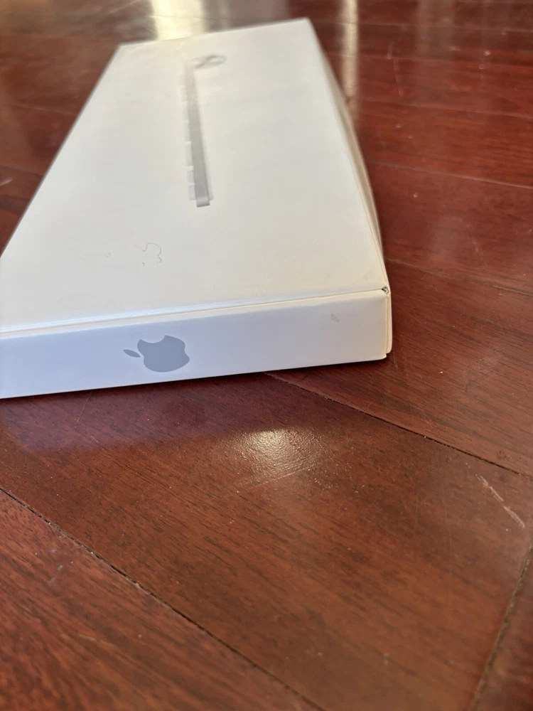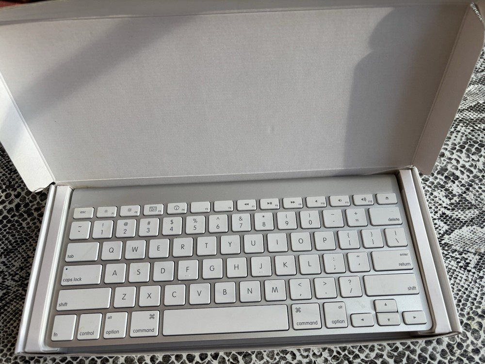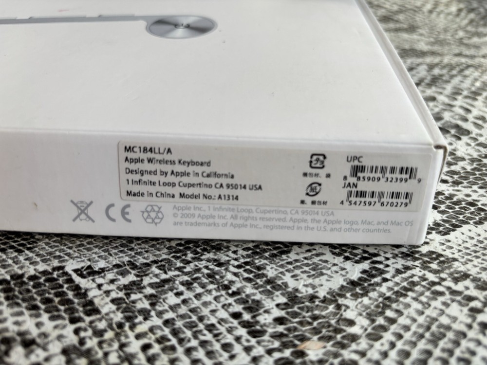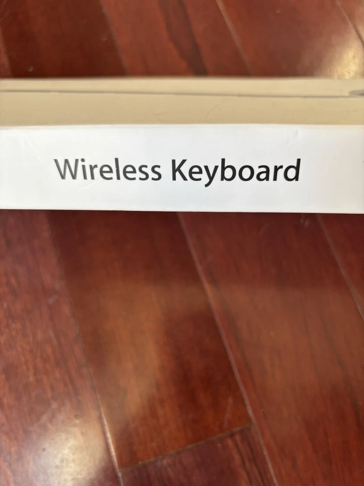 MC184LL/A Apple Wireless keyboard in box, computer laptop accessory Ergonomic and ultra sleek, this keyboard clicks with a creamy feel and quiet sound everyone loves, As is , as pictured, Any flaws are pointed out in pics, Flaw is only noticeable at certain angles, We think flaw is from a factory sticker adhesive but are unable to know the environment items were kept in, If you are meticulous take this under strict consideration, All sales final thanks, no returns