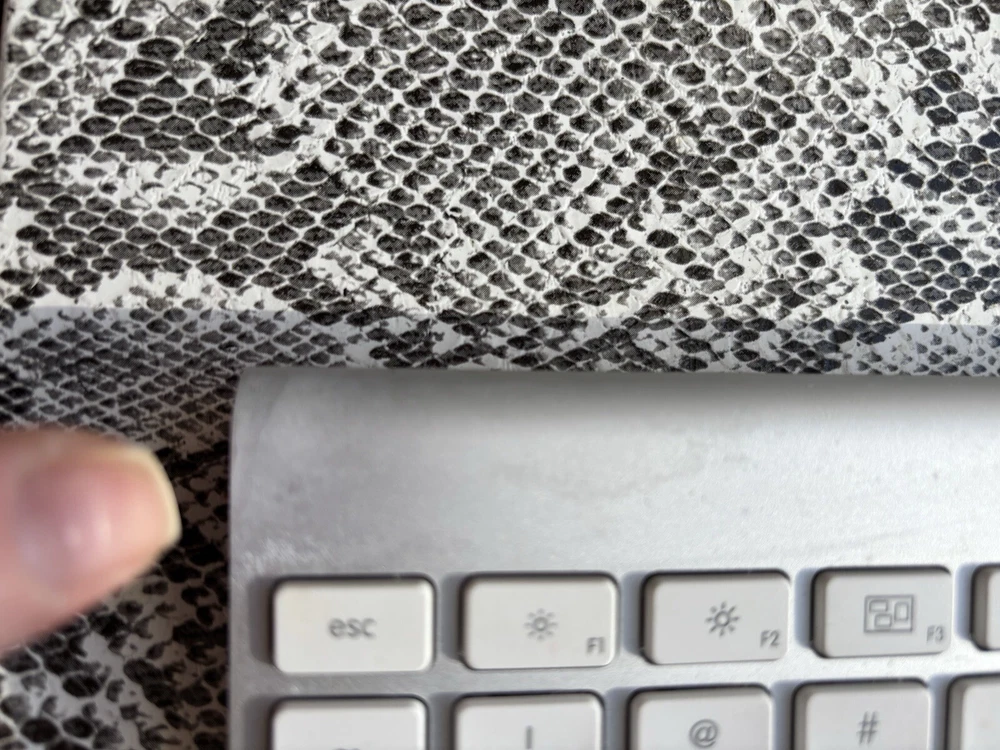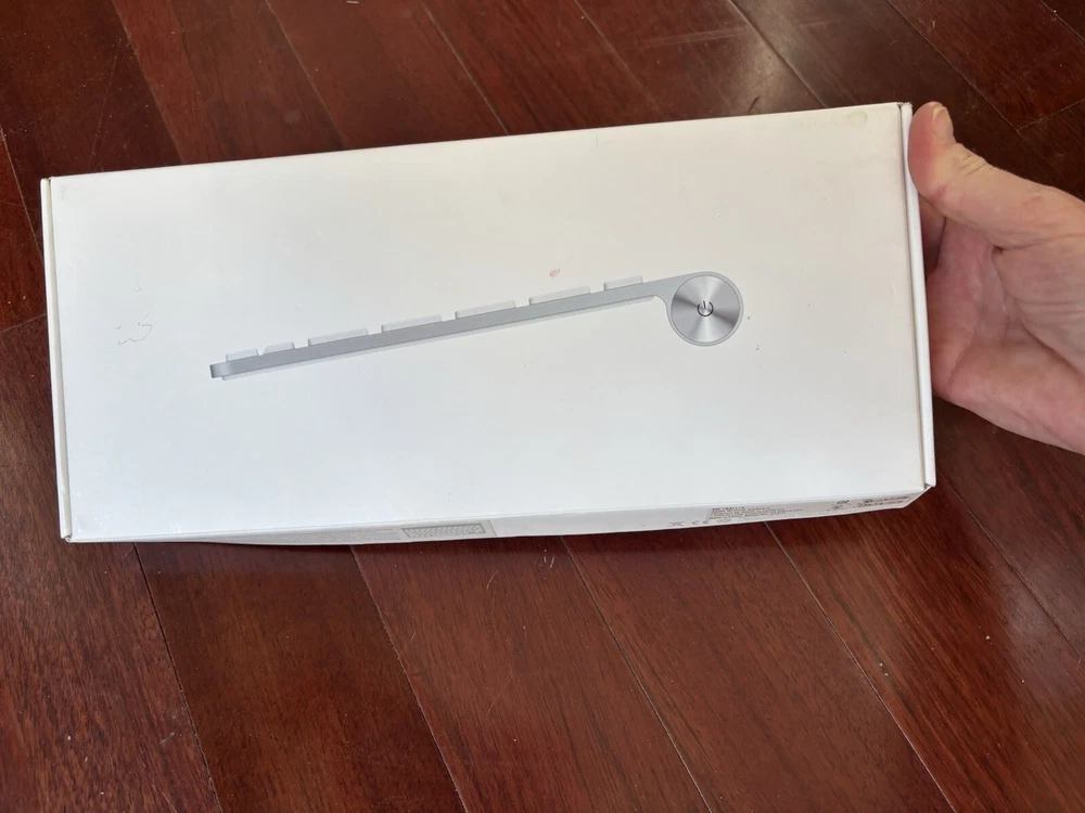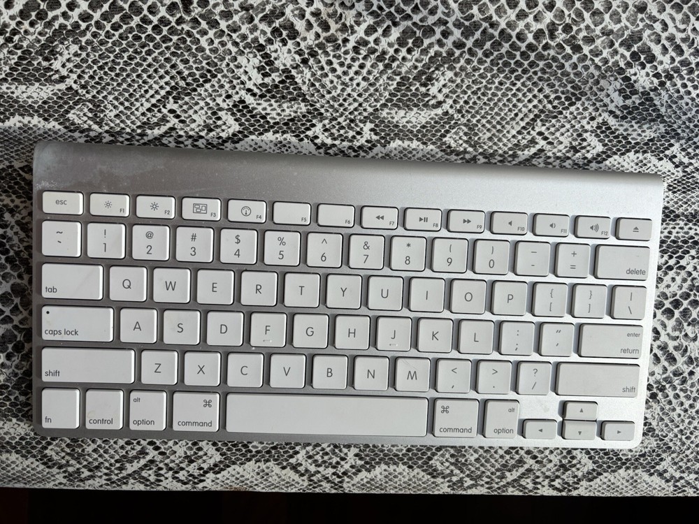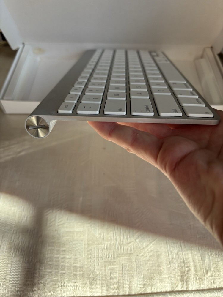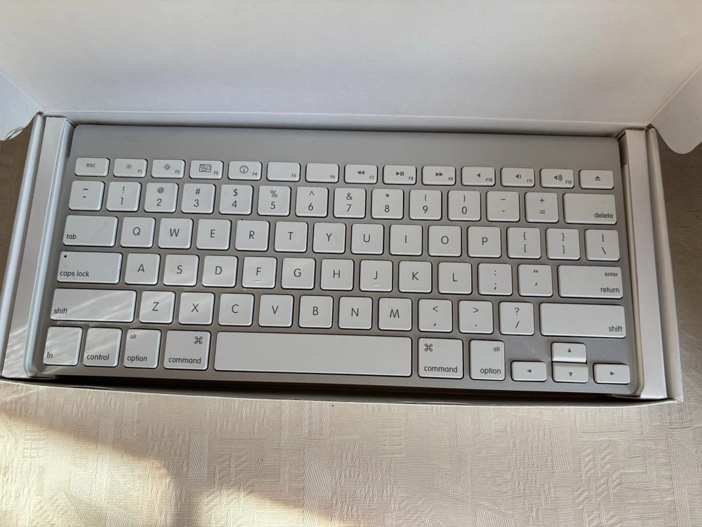 MC184LL/A Apple Wireless keyboard in box, computer laptop accessory Ergonomic and ultra sleek, this keyboard clicks with a creamy feel and quiet sound everyone loves, As is , as pictured, Any flaws are pointed out in pics, Flaw is only noticeable at certain angles, We think flaw is from a factory sticker adhesive but are unable to know the environment items were kept in, If you are meticulous take this under strict consideration, All sales final thanks, no returns