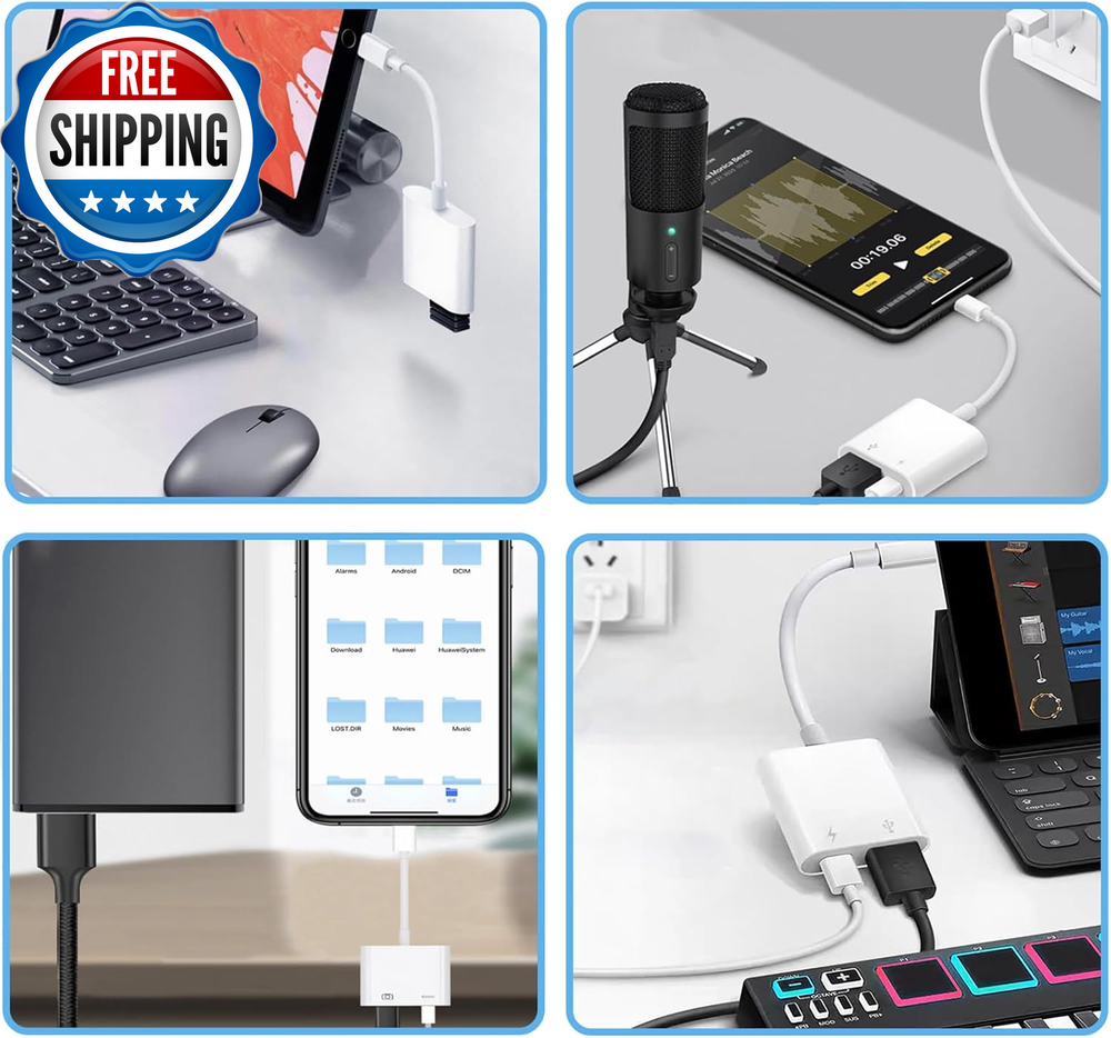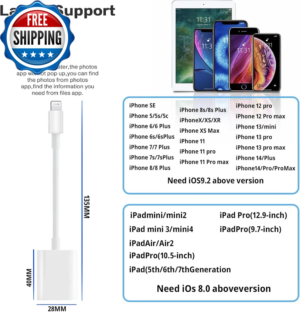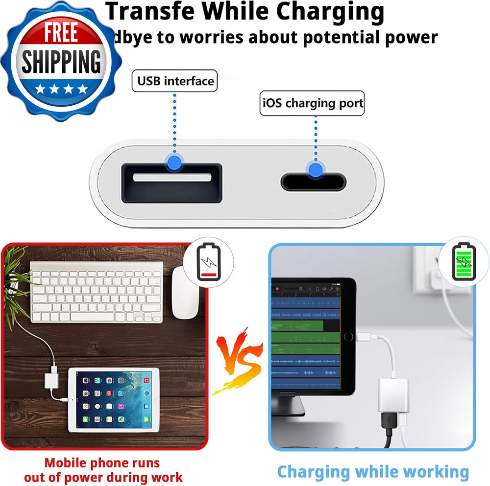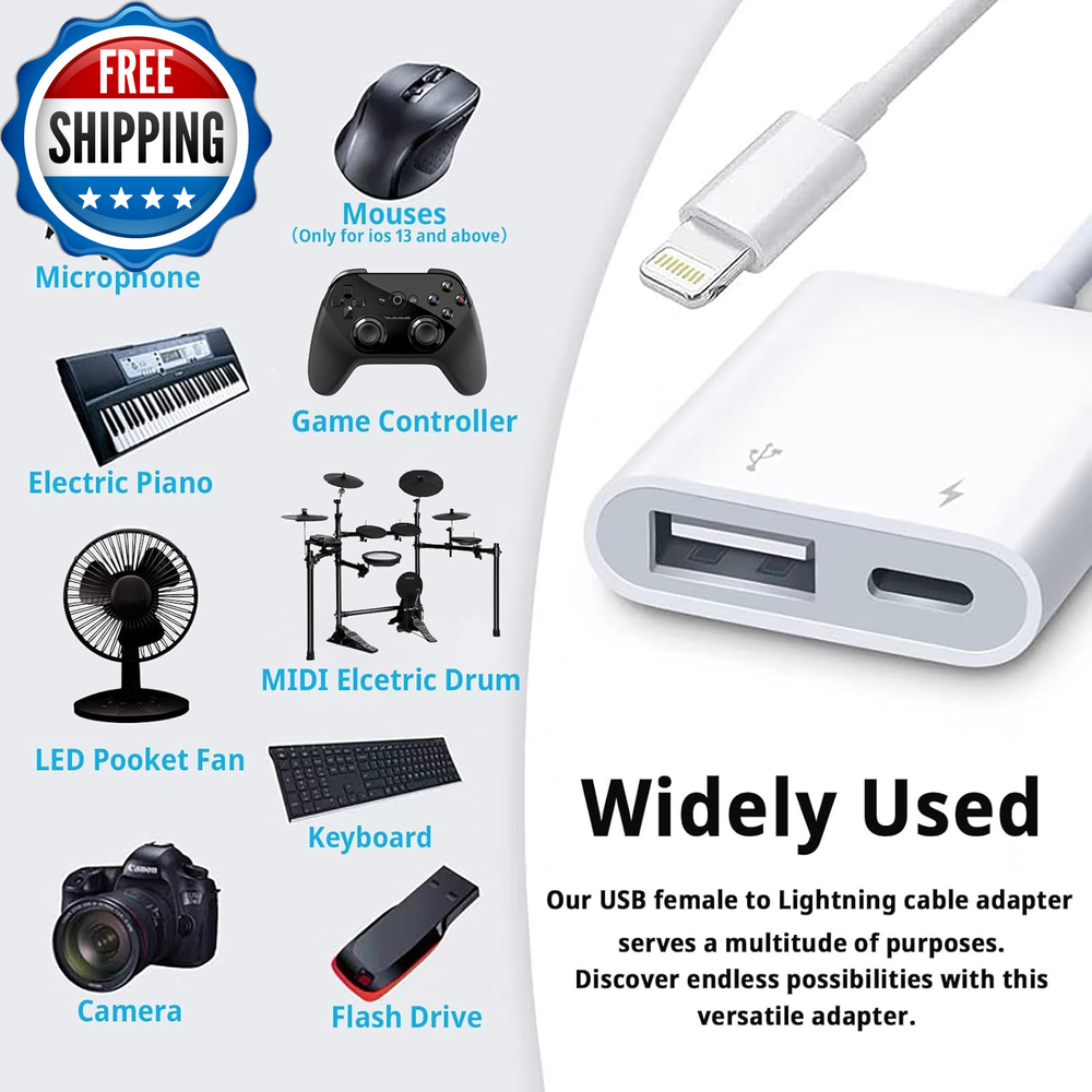 [Apple Mfi Certified] Lightning to USB Camera Adapter with Charging Port, Portable USB 3.0 Female OTG Cable for Ipad to Connect Card Reader USB Flash Drive, Compatible for Iphone Ipad 【Widely Compatible】 Our usb adapter supports standard photo formats,including JPER and RAW,and SD or HD video formats,including H.264 and MPEG-4.It is compatible with a wide range of Apple devices, including iPhone 14/14 Plus/14 Pro/14 Pro Max/13/13 mini/13 Pro/13 Pro Max/12/12 mini/12 Pro/12 Pro Max/11/11 Pro/X/XS/XS Max/XR and iPad Air/Mini/Pro. It supports All iOS system , ensuring broad compatibility across Apple devices 【Plug and Play】The Lightning to usb camera adapter does not require an application, and there is no need to remove the camera's memory card.Using the iphone to usb adapter,Effortlessly transfer high-resolution photos and videos directly from your digital camera to your iPhone and iPad. this is an excellent choice for copying photos or videos from the camera in a short time 【With Charging Port】 Our usb adapter adds a charging port, charging,view photos or videos can be operated at the same time.Say goodbye to worries about potential power failures 【Widely Used】Our USB female to Lightning cable adapter serves a multitude of purposes. It can be widely used with various USB 3.0 devices, including digital cameras, card readers, USB flash drives, MIDI keyboards, mice, U disks, hubs, electronic pianos, drums, audio interfaces, mixers, USB microphones, and more. Discover endless possibilities with this versatile adapter 【Quality Service】You can get 1 Pack Lightning to USB Camera Adapter.We are committed to providing satisfactory service to all our customers,For any questions about our products, please feel free to contact us, we will provide you with a satisfactory solution within 24 hours Product Description Plug and Play With Charging Port Lightweight Design Extensive Compatibility User Guide Shipping Fast shipping is very important for us. Our standard US shipping service is FREE. Your order will be shipped within 2-3 business days upon full payment received. Your order will be delivered within 2-3 business days after the handling time. We only ship to the confirmed PayPal address. We reserve the right to cancel any order for any reason at any time. We are not responsible for undeliverable addresses. Returns and payment We offer a 30 days return policy from checkout winning date. We allow only PayPal as payment method FeedBack Your feedback very important to us, after you get your package and you are satisfied with our service please leave us positive feedback If you have any problem with your order / any questions please before leave any type of feedback For any questions, using eBay contact system Please visit our eBay store to check out other items for sale! Thank you for shopping at our store.
