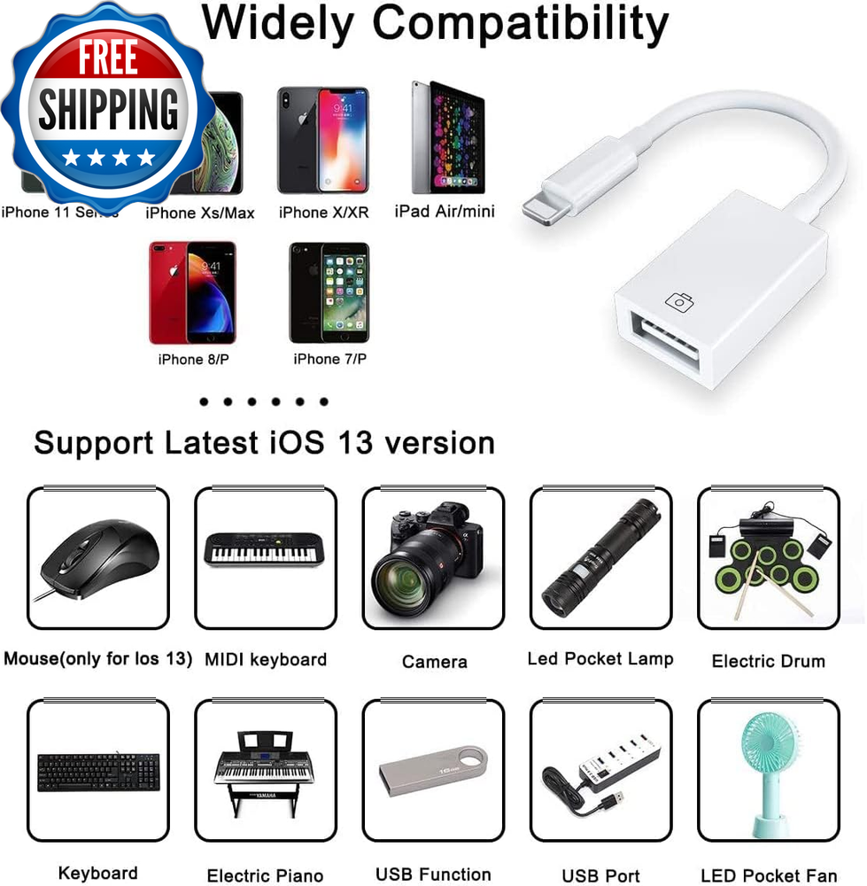 【Apple Mfi Certified】 Lightning to USB Camera Adapter for Iphone/Ipad, Female USB 3.0 OTG Cable Adapter Support Connect Camera,Usb Flash Drive,Card Reader,Midi Keyboard, Mouse 【Easy to Share】 No APP required, Plug and play, you can easily share your photos to social media; or you can transfer file from U disk or memory card to your iPhone/iPad. Supports photos in JPEG and RAW formats, SD and HD videos in H.264 and MPEG-4 formats. 【Stunning Features】 Supports connection of USB flash drive, USB mouse, keyboard, MIDI keyboard, electric piano, drums, mixer and other devices. This iPhone USB adapter is the best choice to extend more functions to your phone or tablet. 【Easy Data Import and Export】 Supports two-way data transfer for iOS, you can import pictures, videos, MP3 files, MP4 files, Excel, Word, PPT, PDF import and export "files" or "photo" app from the plug camera to phone, pad. and Play, no app. Compact, portable, convenient to use. 【Strong Compatibility】 The USB to iPhone adapter is compatible with iPhone 14/ 14Pro/ 14Pro Max/ 13/ 12/ 11/ 11 Pro/ 11 Pro Max/ Xs/ Xs Max/ X/ 8/ 8 Plus/ 7/ 7Plus/ SE and iPad Air / Mini /Pro. 【Small Size & Portable:】This Lightning to USB adapter is with short cable, It is Lightweight and durable, Only 10g weight and 4.7inch length. Good to carry in your bag to travel and work. Product Description Shipping Fast shipping is very important for us. Our standard US shipping service is FREE. Your order will be shipped within 2-3 business days upon full payment received. Your order will be delivered within 2-3 business days after the handling time. We only ship to the confirmed PayPal address. We reserve the right to cancel any order for any reason at any time. We are not responsible for undeliverable addresses. Returns and payment We offer a 30 days return policy from checkout winning date. We allow only PayPal as payment method FeedBack Your feedback very important to us, after you get your package and you are satisfied with our service please leave us positive feedback If you have any problem with your order / any questions please before leave any type of feedback For any questions, using eBay contact system Please visit our eBay store to check out other items for sale! Thank you for shopping at our store.