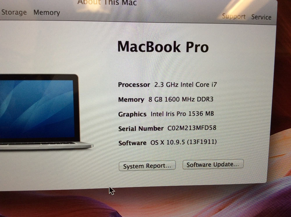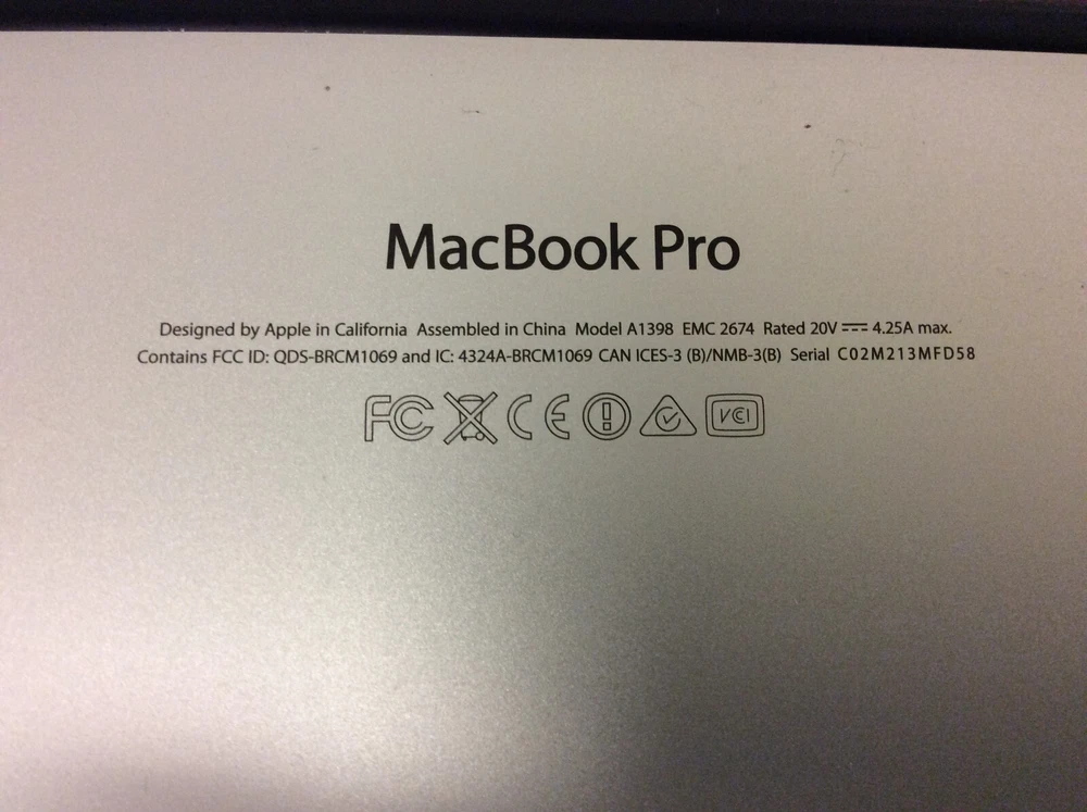 Apple Macbook Pro A1398 i7-4850HQ@2.3GHZ 8GB RAM 256GB SSD MAC OS X 31998XD SERIAL#C02M213MFD58 Password amd123 Battery Condition Normal Battery Cycle Count 173 Light Scratches On Top and Bottom Small Dent On Top Cover AC Adapter Not Included Please Examine Pictures