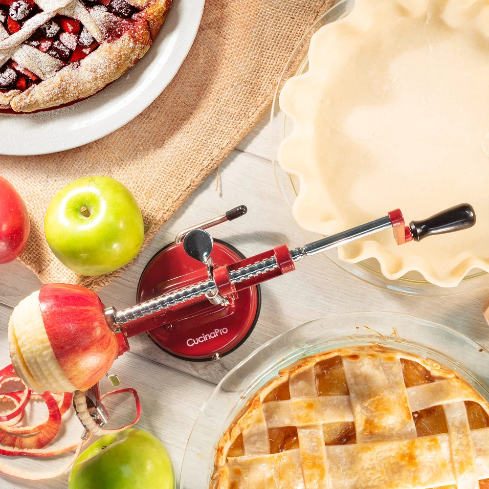 The Apple Peeler does it all. It peels, cores and slices your apple with the turn of a handle. It features a suction mount base, so you can use it on any countertop. This saves you half the time and labor of peeling your apples. Suction cup adheres to counter top with a strong hold Red enamel coating gives this peeler a retro look. Fun holiday essential for Thanksgiving or Christmas apple pie making! Chrome cast iron construction for years of service Peels, slices and cores in one simple motion. Great for peeling apples, potatoes, fruits and veggies! The handle of your apple peeler might appear like it's on backwards when you receive it - this is to keep the product safe during transportation. You should remove the handle and put it back on correctly upon receipt