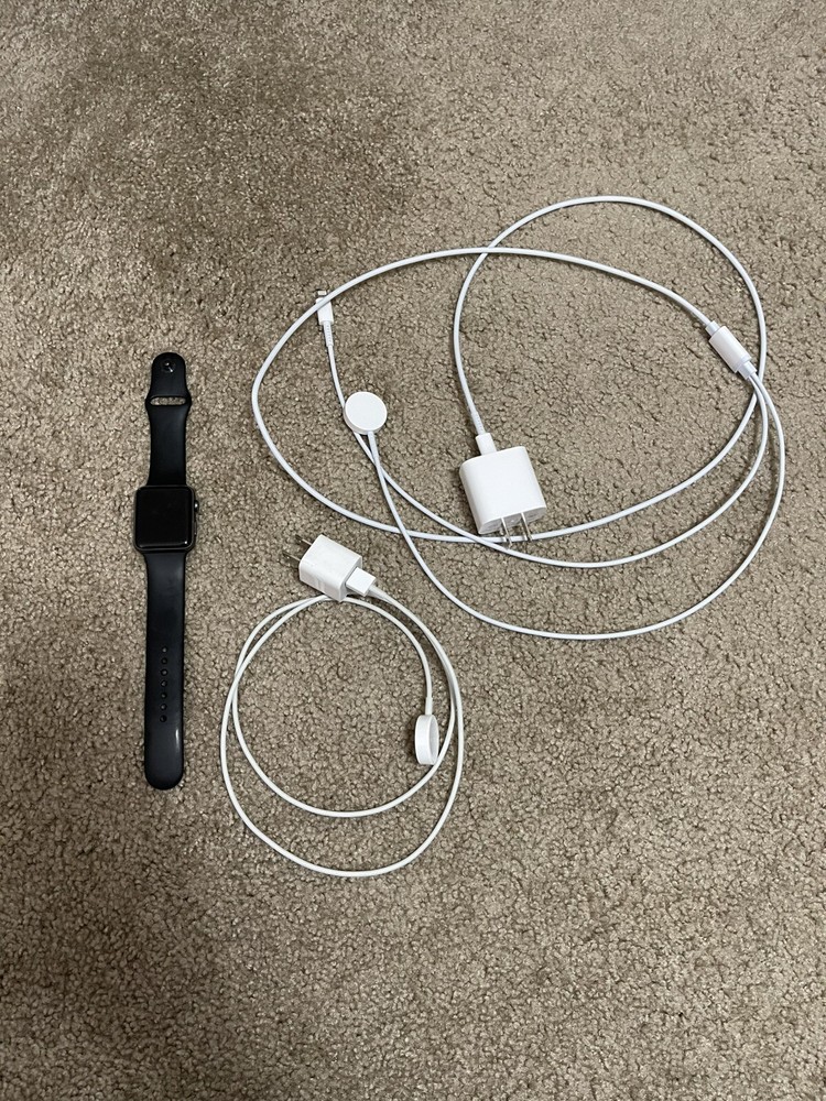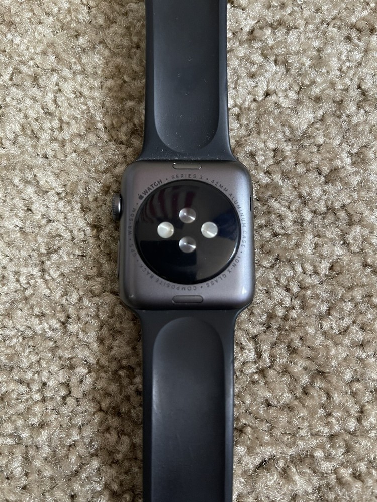 Apple Watch Series 3 in Space Gray with a 42mm black sport band. This cellular model is unlocked and features a fitness tracker, Bluetooth, altimeter, accelerometer, and 4G data capability. The smartwatch has 16GB storage and runs on Apple Watch OS, compatible with iOS. The case is made of aluminum, and the band is also black aluminum.