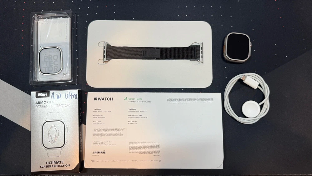 Includes: ~ Apple Watch Ultra Natural Titanium 49mm UNLOCKED (Excellent Condition) ~ Apple Original Watch Charger (Excellent Condition) ~ Apple Blue/Black Trail Loop Band M/L (Excellent Condition) ~ ESR Tempered Glass Screen Protector and application kit* *One screen protector is on the watch currently and another included (Frame of the screen protector matches the color of the watch . Doesn't add a bulky feel to the watch, its barley noticeable and provides extra protection) *See last picture for the listing for everything mentioned above DONT PASS ON THIS DEAL. MAJORITY OF APPLE WATCH SELLERS ON EBAY WILL SEND 3RD PARTY WATCH BANDS AND CHARGERS. I'M SELLING MINE WITH EVRYTHING APPLE OFFICIAL. ALL IN EXCELLENT CONDITION. THIS IS MY PERSONAL APPLE WATCH AND VERY WELL KEPT. **DOES NOT COME WITH ORGINAL APPLE WATCH PACKAGING