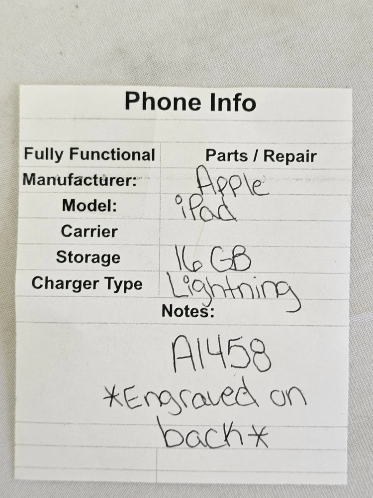 Apple iPad A1458 Storage: 16GB Engraved on back - Tested and Works! Tablet has been cleared and ready for use. See pictures. Tablet is sold as laptop only with no accessories or chargers included. SHIPPING: We will ship your item in 1-3 Business days. Most items are ship within one day but I work full time and cant always get all orders shipped. Your item will be packaged nicely to ensure safe arrival. We will always use the most cost effective shipping method. TERMS: Please pay for your item within 3 business days or we will be forced to open an unpaid item case after a week. No Returns accepted on items for Parts THANK YOU AND HAVE A GREAT DAY!!!!!