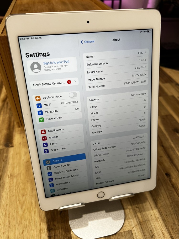 Apple iPad Air 16GB • Wi‑Fi + Cellular White / Silver • Good condition • All sales final Condition Good Storage 16 GB Connectivity Wi‑Fi + Cellular Color White / Silver Overview This iPad Air 16GB Wi‑Fi + Cellular is in good condition with normal signs of use but no major damage. It works great for browsing, streaming, light apps, and general everyday use. Key details • Model: iPad Air (Wi‑Fi + Cellular) • Storage: 16 GB • Display: 9.7" Retina (2048 × 1536) • Color: White front / Silver back • Connectivity: Wi‑Fi + Cellular (nano‑SIM) • Cameras: 5MP rear, 1.2MP front • Lightning connector, stereo speakers • Great for media, web, and basic apps Condition Fully functional: touchscreen, buttons, Wi‑Fi, cellular, cameras, speakers, and ports all work properly. Expect typical cosmetic wear from regular use (light scratches or marks), but no cracks or major damage. What’s included Apple iPad Air 16GB Wi‑Fi + Cellular tablet No charger, cable, SIM card, or original box included (tablet only) Terms & conditions Cellular compatibility depends on your carrier and bands in your region; please verify before purchase. All sales are final. No returns for compatibility issues or buyer’s remorse. Shipped securely with tracking; signature may be required for higher value orders. Fast shipping • Professional seller • Buy with confidence