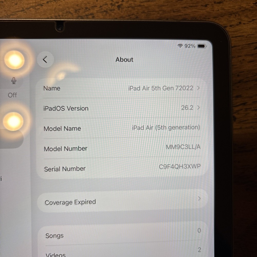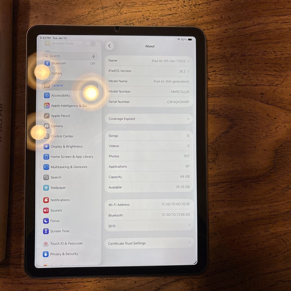 For sale is a used but in excellent condition iPad Air 5th gen. 64GB Running the latest version of iOS 26.2. It has been in a case all of its life and has a screen protector on it as well. One corner of the screen protector is starting to peel. See photo. There are no scratches or cracks on the screen or anywhere else on the device. There is one very small nick on the right side by the volume buttons. See photos. All buttons and features work as they should. This iPad has been factory reset and there are no accounts tied to it. Comes with the original box, USB C charge cable and 20W charge brick. Also comes with Apple Pencil 2nd Generation and the original box for it. iPad case is NOT included. You won’t find a better used iPad than this one!