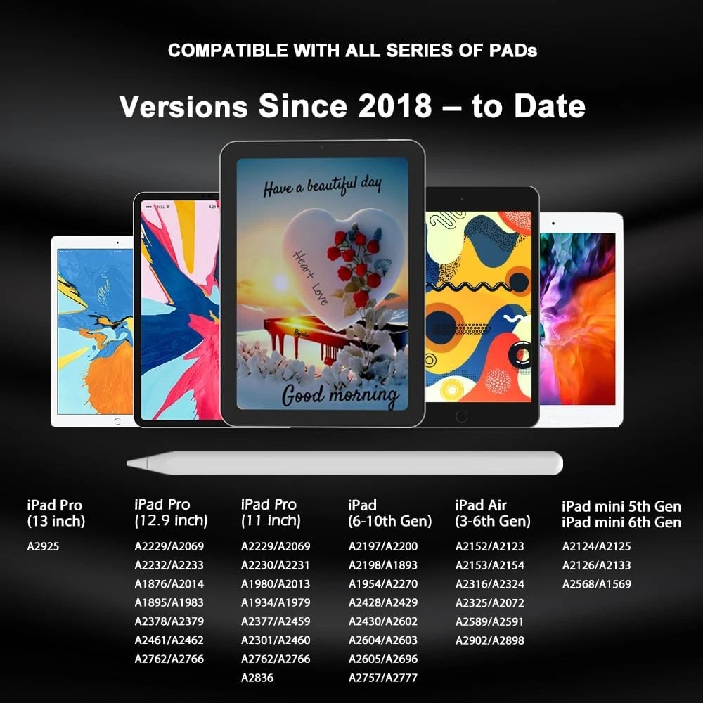 Stylus Pencil with Palm Rejection,for Full Apple (2018-to-Date) iPad White Specifications and Descriptions: Item: Stylus pencil (color: White ) 1.Compatibility : Exclusive for all series of Apple Pads 2018-to-Date models and its coming versions 2.Turn on: Sensitive touch on the top by DOUBLE TOUCH 3.Turn off: Sensitive touch on the top by LONG TIME TOUCH 4.Tips:1.5mm POM---- exchangeable / by Aluminum alloy / Baking varnish 5.Working time:12 Hours(non-stop use) 6.Battery:65400-130mAh 5v/0.2A 0.45Wh 7.Charging time: 40 minutes to be charged full (20 minutes in fast charge and 20 minutes in normal ) 8.Charging: Type-C charging cable included with length=30cm 9.Smart Power saving :sleeping mode automatically if not in use. 10.Standby:12 months(left not in use) Rejection: YES Sensitivity: YES 13.Magnetic Attachment: YES 14. Net Weight : 14g 15.Pencil size: 16.3x0.89x0.89cm Tips and Attention pleaseοΌ 1.If the stylus pencil or finger touch cannot write, please set your iPad or iPad Pro as follows: Settings--->Apple Pencil--->Turn off the Apple pencil. Settings---> Notes--->Turn off "Only Draw with Apple Pencil" NOT COMPATIBLE with iPad models which launched before 2018: 1.iPad Pro 9.7": A1673/A1674/A1675i 2.iPad Pro 10.5": A1701/A1709/A1852i 3.iPad Air 1-2 Gen: A1474/A1475/A1476/A1566/A1567i 4.iPad Pro 12.9" 1-2 Gen: A1584/A1652/A1670/A1671/A1821i 5.iPad mini 1-4 Gen: A1432/A1454/A1455/A1489/A1490/A1491/A1599/A1560/A1538/A1550i 6.iPad 1-5 Gen: A1219/A1337/A1395/A1396/A1397/A1416/A1430/A1403/A1458/A1459/A1460/A1822/A1823 π Product Features β¨ 1.Compatibility:This stylus pencil/pen works with iPad series and models of 2018-to-Date: iPad10th/9th/8th/7th/6th Gen, iPad Air 3rd/4th/5th /6th Gen, iPad Pro11" /12.9"/13" ,iPad Mini 5/6/7th Gen, also new coming models and versions of above kinds β¨ 2.Palm Rejection : with palm rejection technology, this stylus pencil provides a natural writing feeling and quick,effective interaction with your screen, giving you more accuracy on control against the screen. We commend you to use this pen on the iPad with a glass screen protector. β¨ 3.Tilting Detection : This stylus pencil can be tilted at different angles to draw strokes of various thickness and depth, perfect for drawing. Precise point control on writing, no scratches to the screen, no lag/offset/break. Extremely smooth, no resistance and more comfortable in use. β¨ 4.Tip replaceable : 1.5mm pencil nib can replace your finger to execute finer instructions. It`s easy to install and tear off the tips on your stylus pencil without any tool. Compared with the ordinary stylus pen, it has higher sensitivity, more accurate signal, more comfortable in hand, and there are extra nibs in the package. β¨ 5.Magnetical Attach:the function of Magnetic attraction makes your management and storage more convenient, reducing the posibility of loss and scratching to the stylus pencil . π¦ Shipping: Shipping is complimentary within the lower 48 US States. π π« We Do Not Ship to PO/APO Boxes, HI or Alaska π We Do Not Ship Outside of the Continental US β± All items ship within 24-72 hours of Payment π For large items that require Freight shipping, a valid phone number is required to call and schedule your delivery π Terms of Sale and Feedback: β Feedback is extremely important to us and eBay π If you are satisfied with our transaction, please take a moment to leave Positive Feedback. YOUR Satisfaction is our #1 Priority! β If there are any issues, PLEASE contact us BEFORE leaving a neutral or negative rating so that we may resolve any concerns. π We PROMISE we can make you happy if you give us a fair chance. π Returns / Concerns: π All items qualify for returns within 14 - 30 days of receipt. Buyer is responsible for return shipping on any item that is not damaged. π Please be sure this is an item you want before making your purchase. Customer Satisfaction is our TOP priority! π¦ All items are IN STOCK at time of listing. π Inventory on eBay changes constantly and it is impossible to maintain a perfectly accurate count of all items. πβοΈ Please do not penalize us if we have to issue you a refund! π Thank You For Your Business!