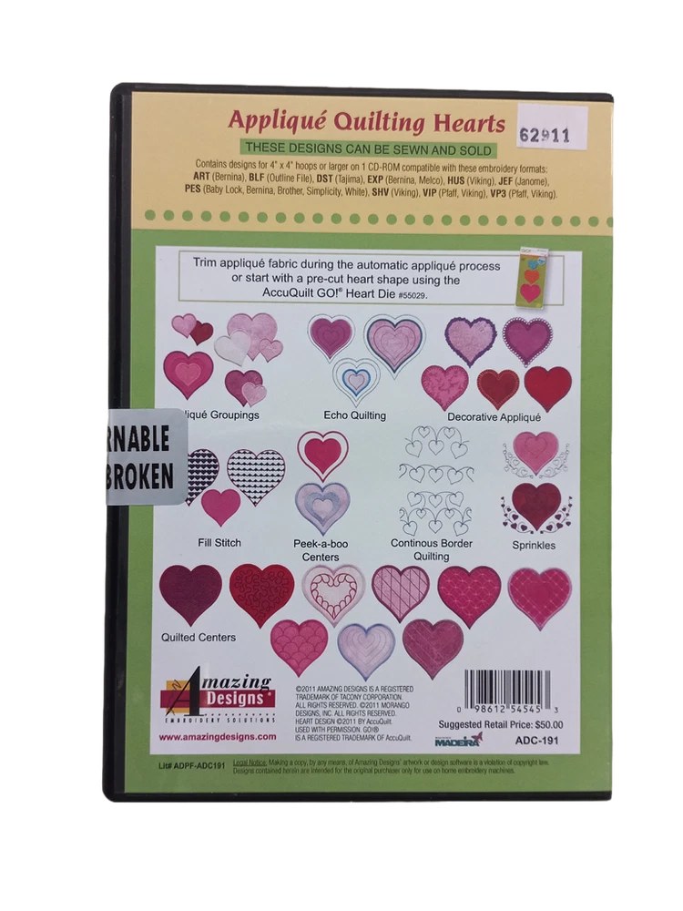 Appliqué Quilting Hearts - Amazing Designs - Machine Embroidery - 76 Classic Designs - CD # ADC-191 CD # ADC-191 - New, Sealed, Original Packaging 76 professionally digitized designs -Includes easy to follow color run information 30 Designs For 4" x 4" Hoop sizes & 46 Designs For 5" x 7" Hoop sizes Compatible with : ART BKF DST EMD EXP HUS JEF PES SHV VIP XXX NCT Thrift Store New Creation Trades, Inc (NCT) is the 501(c3) all-volunteer non-profit that sponsors OxCart MarketPlace and the artisans that list their hand/machine crafted products on OxCart MarketPlace. Artisans receive the full net-proceeds from the sale of their individually listed products. Donated repurposed textile materials are incorporated into these products at no charge to the artisan. Items Donated to NCT that are not directly useful for training purposes or product creation are offered by New Creation Trades for sale through the NCT Thrift Store. Proceeds from these sales support the overhead expenses of OxCart MarketPlace, Thank you for supporting OxCart Artisans with your purchases through NCT Thrift Store!