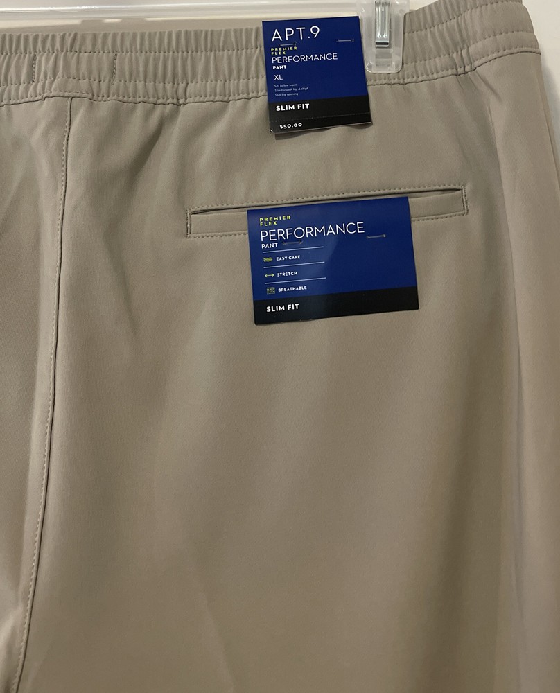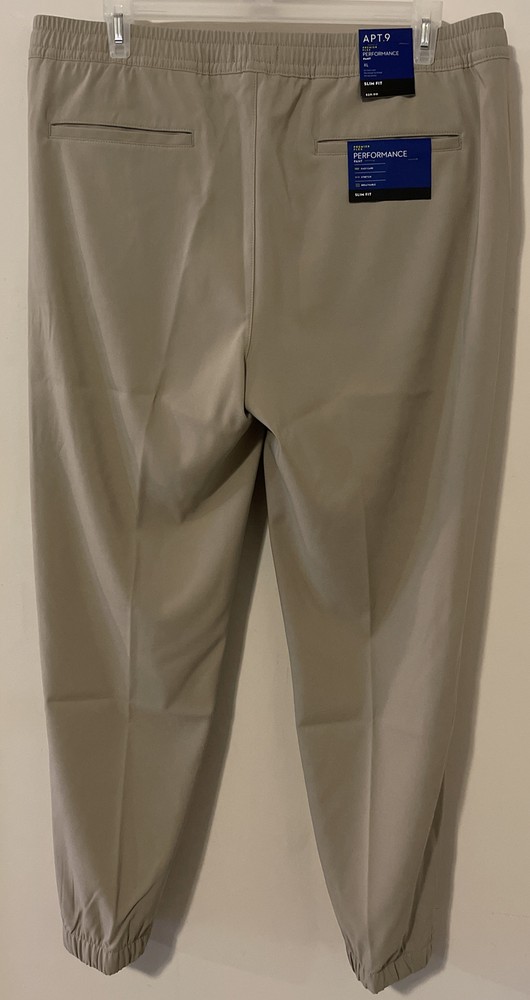 Apt 9 Mens Premier Flex Performance Jogger Style Pants NWT! A4563. This is a super nice stylish pair of slim fit joggers in perfect brand new condition. The inseam measures 30 inches. The material is a polyester spandex blend. The material is an easy flex stretchy material.