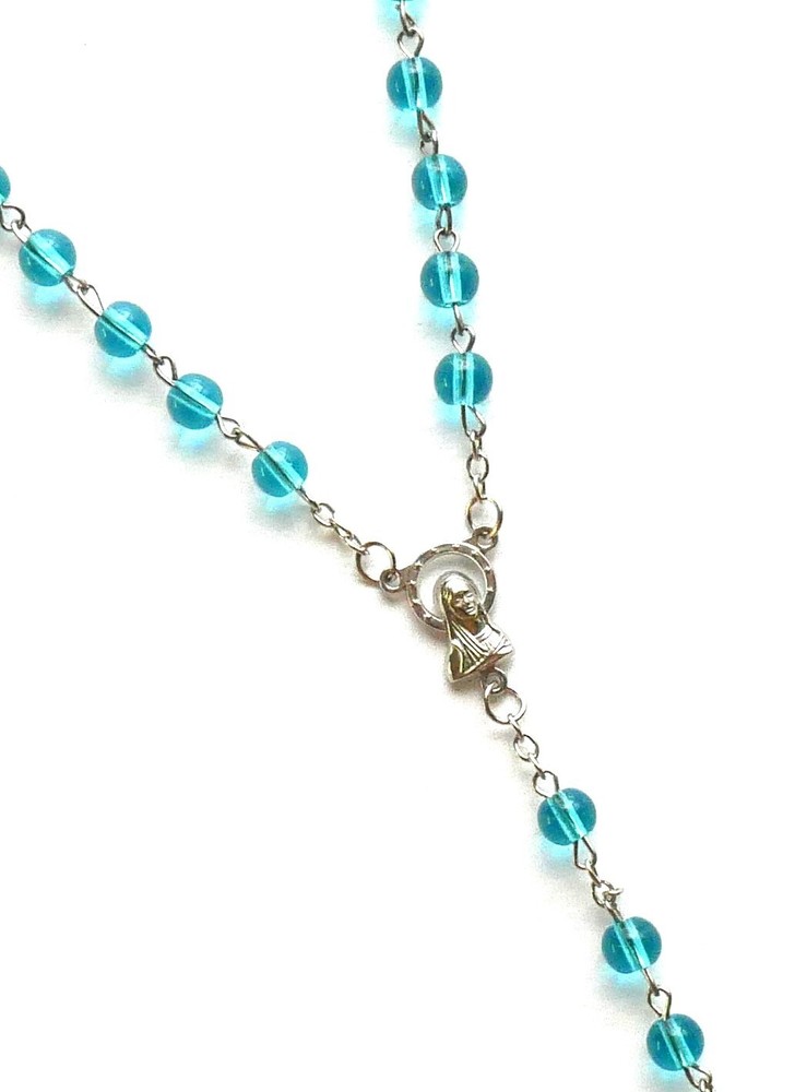 Aqua Beads Pressed Glass Rosary with Pouch Included This is one of the best rosaries you can buy...all glass...heavier than other rosaries. PLEASE NOTE THAT THIS ROSARY IS NOT INTENDED TO BE USED AS A NECKLACE ROSARY AND WE DON'T RECOMMEND TO USE IT AS SUCH. This listing includes (1) rosary. SIZE/LENGTH: Total length is 19" (27" circumference) including the Crucifix. BEADS: Quality 6 mm (1/4") pressed glass round beads carefully assembled on a zinc alloy chain. CENTER PIECE: Zinc alloy center piece of The Madonna measures 5/8" x 3/8" CRUCIFIX: The Crucifix measures 1-1/2" L x 7/8" W. This rosary includes a FREE pouch that may be black or blue. Come Visit Us at Our New Store! Please feel free to email me with questions about this item. Also please check my other listings. I am always available to answer your questions promptly. Buy from us with confidence.