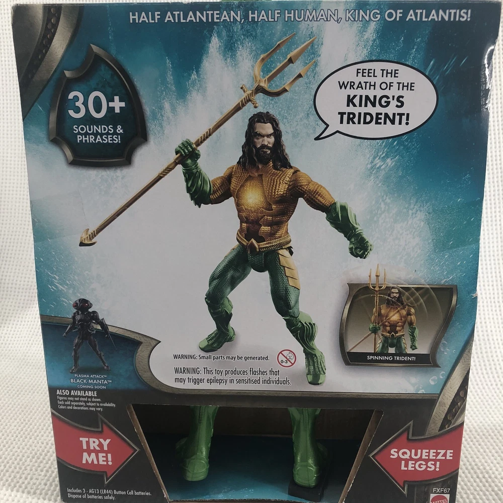 This Aquaman Deluxe action figure is a must-have for any superhero fan. With a height of 12 inches, it features the iconic character of Aquaman from the DC Universe with over 30 sounds and phrases. The figure comes with a trident accessory and features a talking function, as well as squeeze legs together spins the trident spins. The packaging is original and unopened, but the batteries still need to be replaced. The figure is made of plastic and is an original licensed reproduction from Mattel's 2018 collection. It is recommended for ages 4 and up, and is perfect for collectors and children alike. Add this Aquaman Deluxe action figure to your collection today!