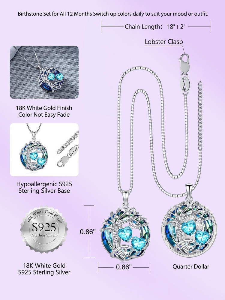 Tree of Life Necklace for Women 925 Sterling Silver Heart Birthstone Necklace Jewelry Anniversary Birthday Christmas Gifts jewelry is a trendy style jewelry collection from charm of women. We advocate that women try to find their inner beauty from life. Our designers come from the United States. They absorb the most fashionable elements in Europe and America. We are humble to accept the suggestions from every consumer. Material: Eco-friendly hypoallergenic 925 sterling silver Size: 0.86*0.86 inches Contents: Tree of Life Birthstone jewelry Package: This irish celtic family tree necklace crystal birthstone pendant necklace for women will be packed in a box bag, it’s a great gift for yourself or the one you love. Perfect for all occasions: A wonderful gift for yourself or any other who you care about, comes with an elegant gift box, you may send it directly to your special her or just as a surprise to remind that special someone how much you care Product Maintenance a.Clean with a soft cloth. b.Store in velvet bag or jewelry box in dry condition. c.Avoid direct contact with water and harsh chemicals. Service:Sincerely provide service for you,60 days free return guarantee promise. -If you have any problem about the item,please contact us directly. -We will solve your problem in 24 hours. 【Tree of Life Necklaces for Women】 Crafted with tree of life and crystal to symbolize eternal love and strength, this necklace serves as an Anniversary Birthday Christmas Jewelry, expressing that the love between you and her is forever. 【White Gold Sterling Silver Necklace 】 features S925 sterling silver throughout, including the chain, pendant, and clasp. The product undergoes rigorous S929 test, ensuring authenticity and quality. Additionally, the women's necklace is elegantly plated with white gold on the outer layer. 【Crystal Birthstone Necklace for Women 】 Crafted with Austrian crystals, the exquisite cut of each gem enhances its brilliance and radiance through light refraction, showcasing a purer clarity. 【12 Colors of Birthstones for 12 Months】 The tree of life birthstone jewelry as a perfect birthday gift to her. Garnet for January, Amethyst for February, Aquamarine for March, Diamond for April, Emerald for May, Alexandrite for June, Ruby for July, Peridot for August, Sapphire for September, Pink Tourmaline for October, Citrine for November, Topaz for December. 【Celtic Tree of life Necklace】 Ready to be Gifted with a Jewelry Box,The package includes a tree of life pendant necklace, a beautifully crafted gift box, a greeting card, and a silver polishing cloth. It is ready to be given as a gift to your girlfriend, or any other woman you deeply care for. March Birthday Gifts Aquamarine Necklaces Birthday Gifts Mothers Day Gifts for Mom
