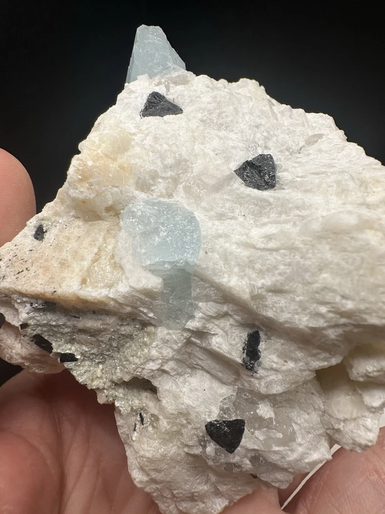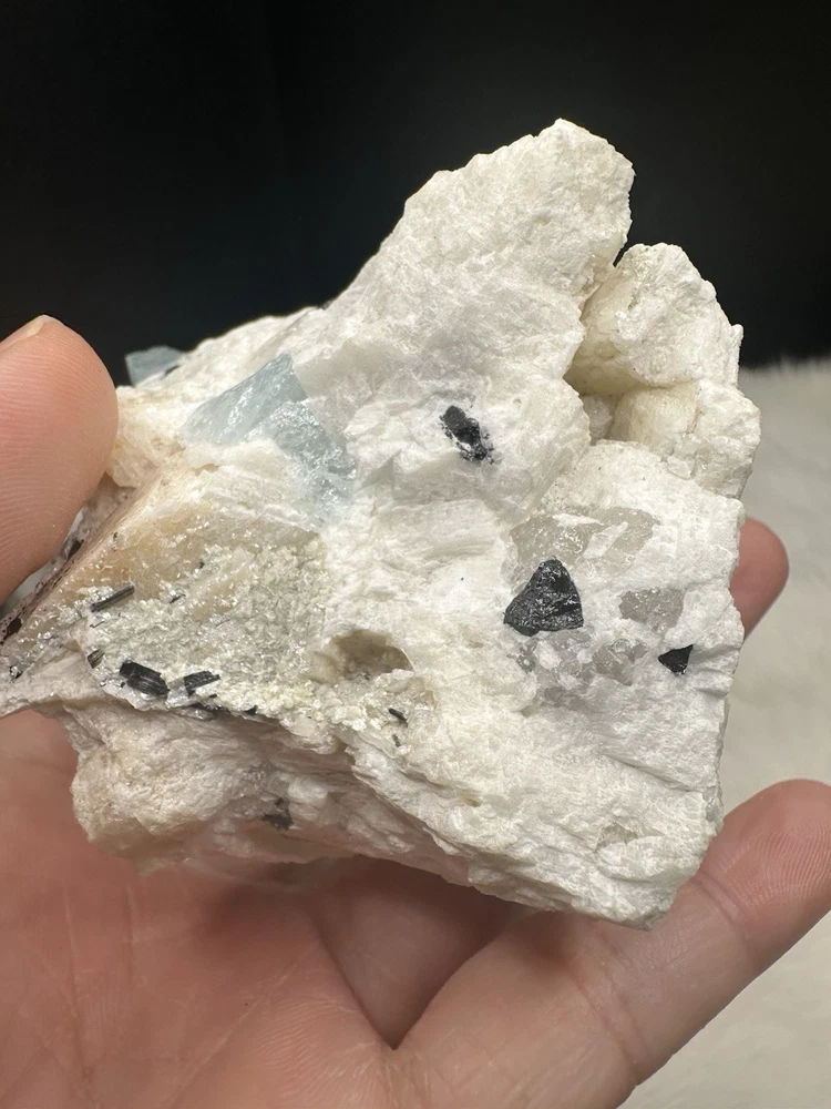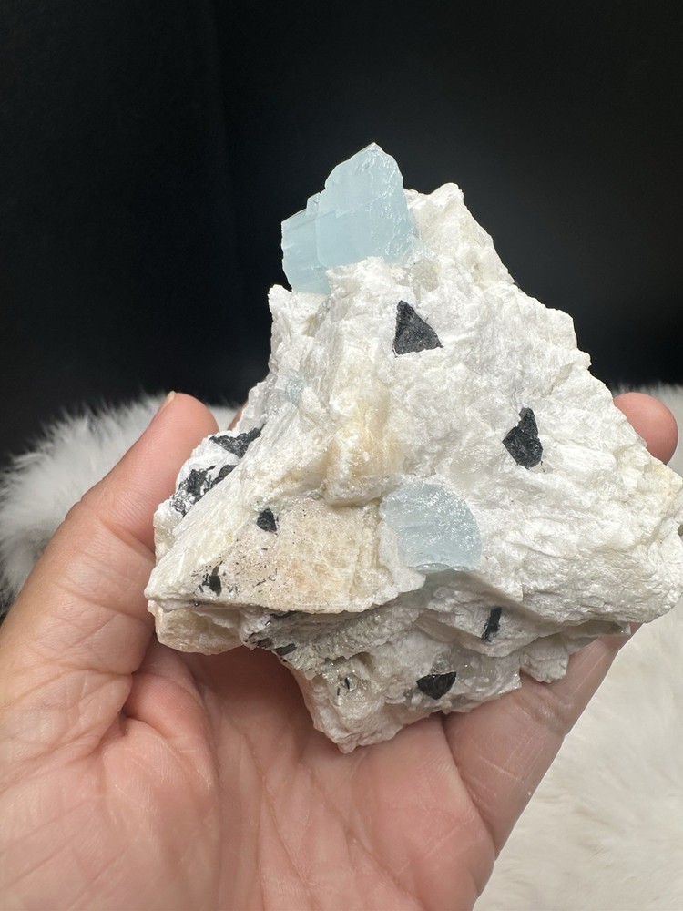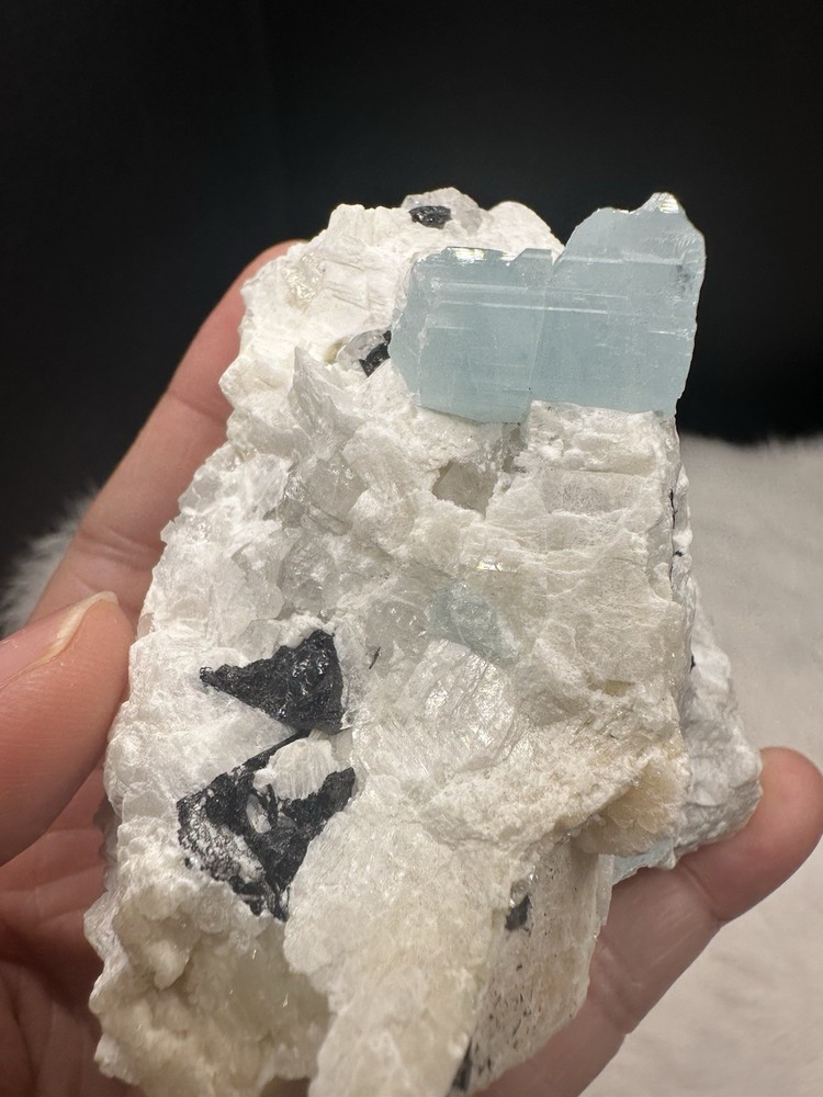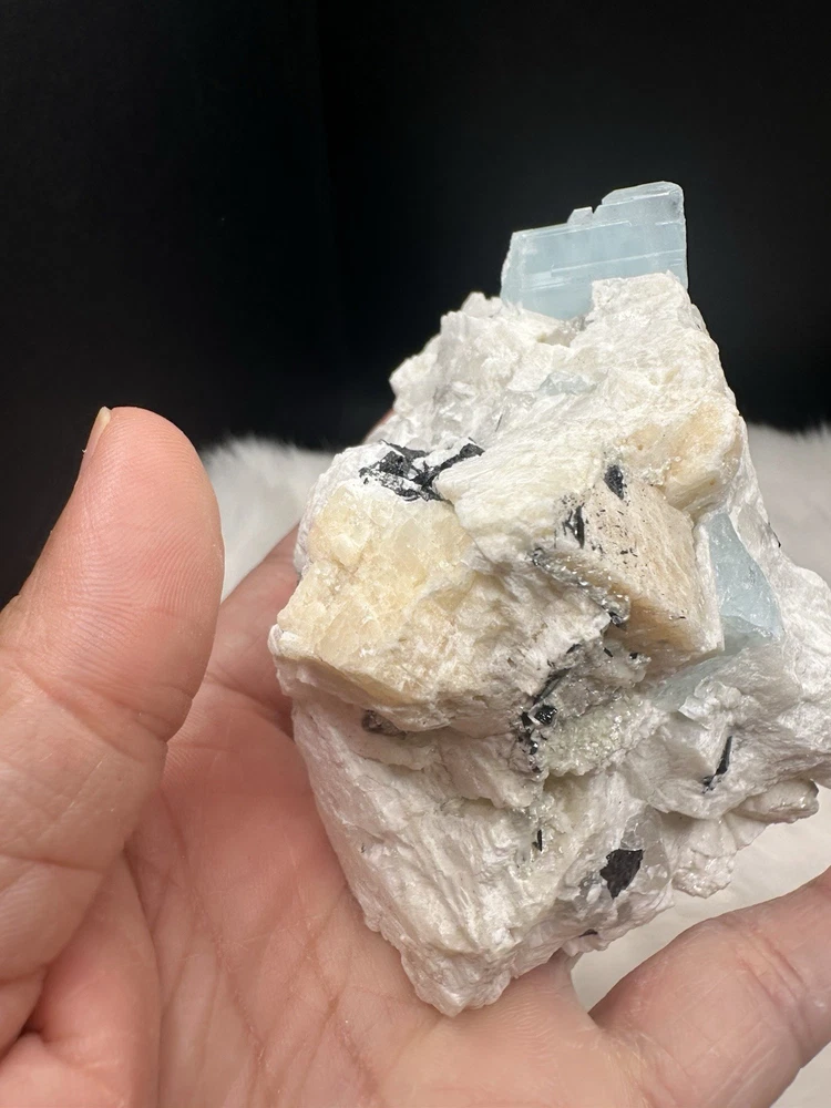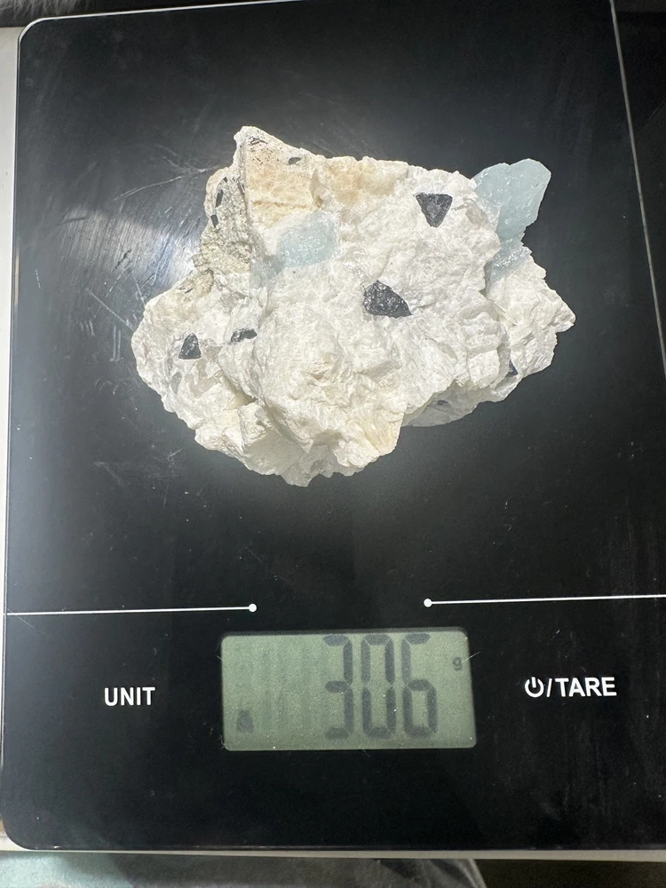This cabinet size specimen is a 306g aquamarine from Pakistan, featuring a natural shape and adorned with feldspar, quartz and black tourmaline and some mica too. This unique piece showcases the beauty of aquamarine in its natural state, set against a picturesque matrix of feldspar and tourmaline. With its origins in Pakistan, this gemstone offers a touch of exotic elegance and geological charm to any collection or display.