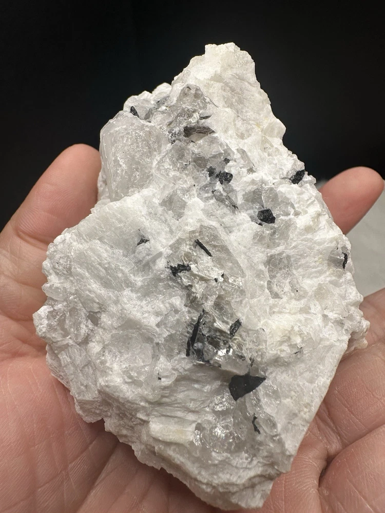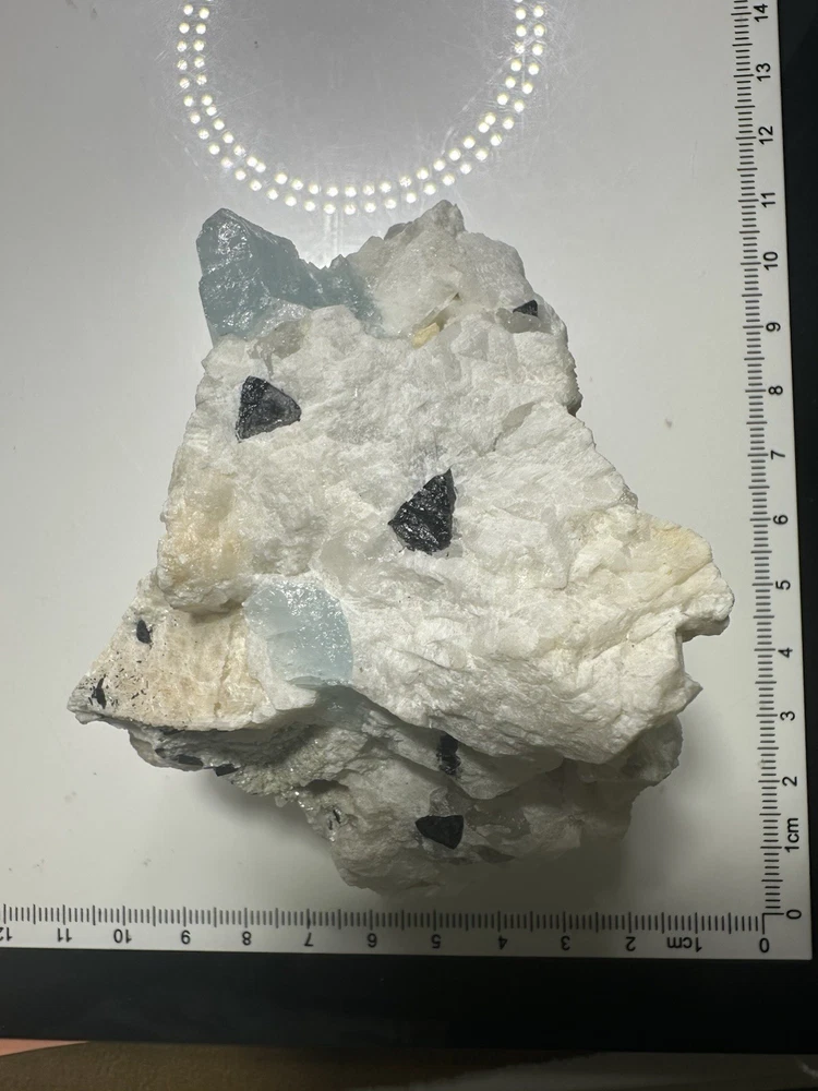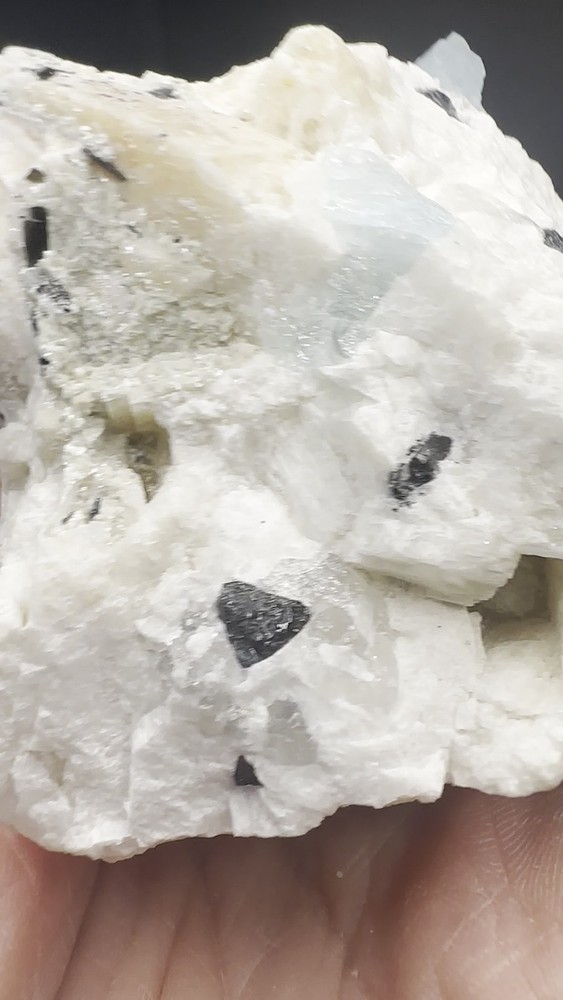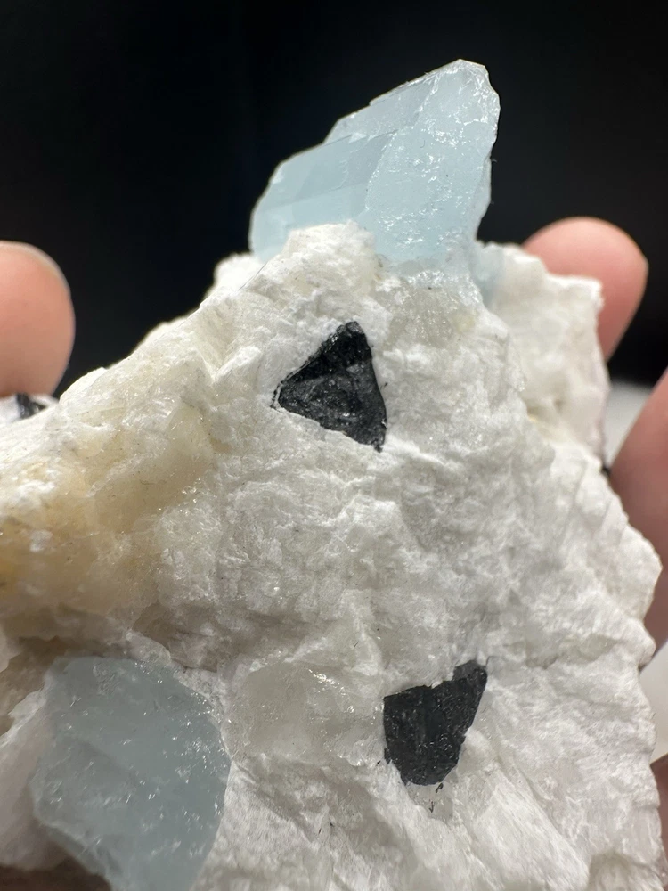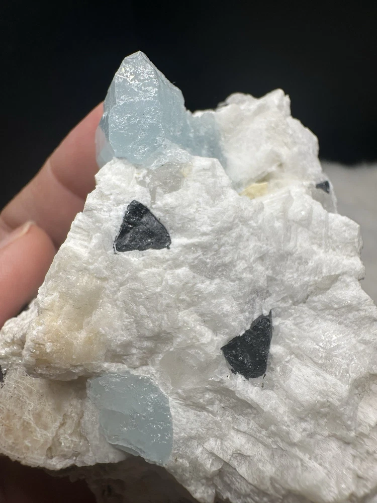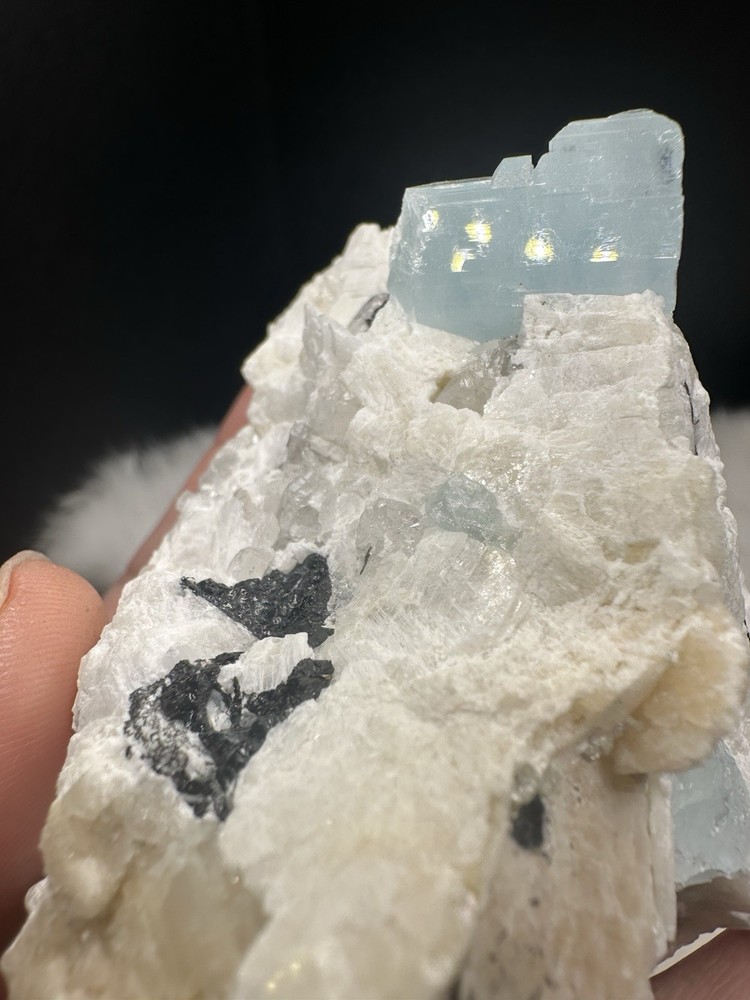 This cabinet size specimen is a 306g aquamarine from Pakistan, featuring a natural shape and adorned with feldspar, quartz and black tourmaline and some mica too. This unique piece showcases the beauty of aquamarine in its natural state, set against a picturesque matrix of feldspar and tourmaline. With its origins in Pakistan, this gemstone offers a touch of exotic elegance and geological charm to any collection or display.