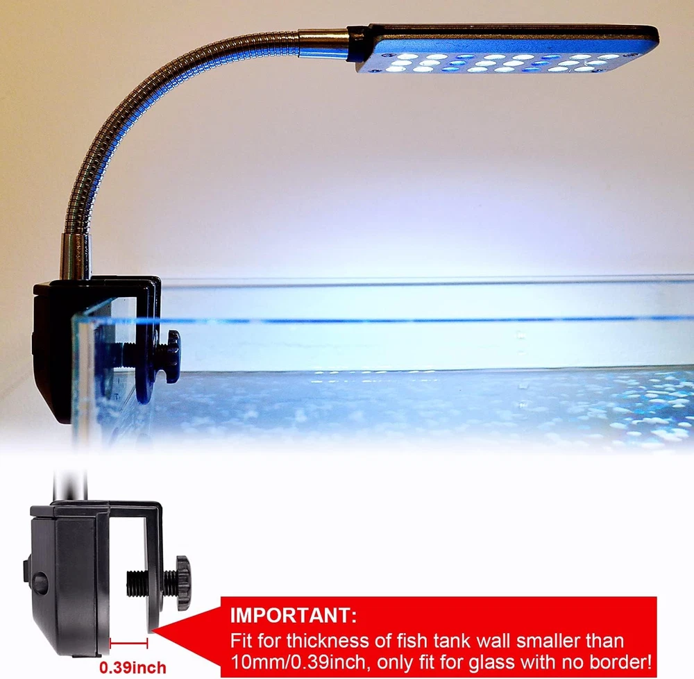 Two Light Modes: the small aquarium light has twenty-four LEDs in total, including eighteen white LEDs and six blue LEDs, in day mode, all lights on; in night mode, blue lights on, the aquarium lights for fish tank suitable for both freshwater and saltwater Super Bright and Energy Saving: with power 1.5 watt, this aquarium LED light gives off very bright crisp light for fish tanks below 10 gallon water; low power consumption, the small fish tank light is 40% energy saving than ordinary LED lights Easy to Use: just clip the aquarium lamp on and adjust the screw on a suitable tightness, and the flexible metal tubing help to adjust the nano aquarium light to any desirable direction and angle Long Lifespan: the service life of the aquarium clip light is 20,000 hours, durable and long lasting, don’t bother you to change your aquarium lights frequently Suggested Aquarium Size: the length of the clip on aquarium light body is 3.54 inches, which is suggested to be used for 6 - 15 inches long fish tanks or 2 - 10 gallon tank Product Description Small Fish Tank Light Clip on Led Light for Fish Tank Below 5 Gallon Goehiaul clip on led light for aquarium has 24 LEDs in total, including 18 white LEDs and 6 blue LEDs, in day mode, all lights on; in night mode, blue lights on, the power is 1.5 watt, suitable for fish tanks below 5 gallon. Adjustable Arm The arm of the fish bowl light is made from high quality metal hose, which help to adjust the light to any desirable direction. 2 Light Modes The small aquarium lighting has two light modes, which is all lights on and blue lights on, to meet different light needs for day and night. High Quality LEDs This LED aquarium light is made of high quality LEDs, no flickering, long lifespan and energy efficient. Customer Application Cases For Fish Bowl For Rectangle Tank For Circular Tank Notes: Please do not tighten the light to much in case it cracking the glass. Only suit for fish tanks with wall thickness smaller than 0.39 inches.