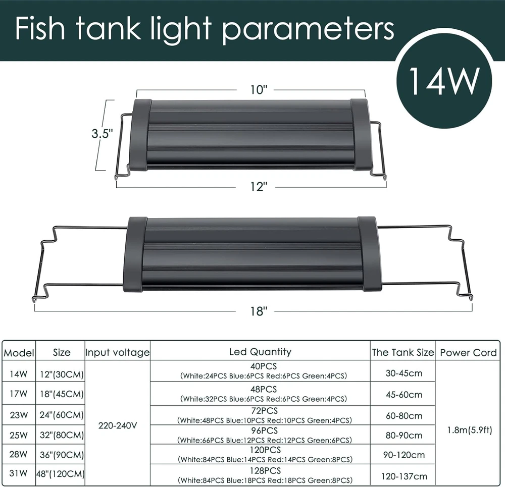 < ul >< li >ππγ 14W Classic Aquarium Light γ 14W light suitable 12inch - 18inch fish tank , input votage is AC100 - 240V , Output votage is DC24 - 72V , 40pcs LEDs ( White - 24pcs Blue - 6pcs Red - 6pcs Green - 4pcs ), Power cord is 5 . 9ft ( 1 . 8m ), Lumen is 773lm , Kelvin is 6500K white LED < li >ππγ 3 Color Light Modes , Independent Controller γ 3 light modes can be set : β White β‘2 rows light White + Blue + Red + Green β’4 rows lightWhite + Blue + Red + Green οΌ Press the switch once to turn on white light , press the switch again to turn off the light , press the switch for the third time to turn on mode 2 white + blue , press again to turn off the light , press the switch for the fifth time to turn on mode 3 white + blue + red + green , and that cycle repeats . Notes : this light cannot be fixed mode . < li >ππγ 5730 LEDs Fish Tank Light , High - definition Translucent γ All use 5730 high - brightness lamp beads , high color rendering , high clarity and transparency , bright colors . The light goes directly to the bottom of the fish tank , making the fish tank more translucent and more ornamental , restoration of primay colors of fish and aquatic plants , closer to nature visual enjoyment . can last up to 20000 hours of lighting . < li >ππγ 4 Rows of Lamp Beads , Adjustable Extendable Bracket γ Compared with ordinary lights , the widened panel , 4 rows of lamp beads , thicker height , speed up the heat dissipation of the lamp . Use 3 . 5mm diameter stainless steel bracket , Stable and durable , adjustable Extendable bracket can fit most fish tanks , Please choose the right fish tank light according to the length of the fish tank . < li >ππγ Full Spectrum Brightness , Sutable for Freshwater Plants γ full specturm ratio for aquarium , make aquatic plants more comprehensive photosynthesis and color development , which is helpful for plant growth and viewing . < br >< div > < div > < h2 > Product Description < div > < div > < div > < h3 > Welcome to AQQA < p > AQQA is a professional shop specializing in aquarium supplies and accessories , all products from this store the actual filming of goods < p > AQQA ----- Aquarium accessories , Quality A +