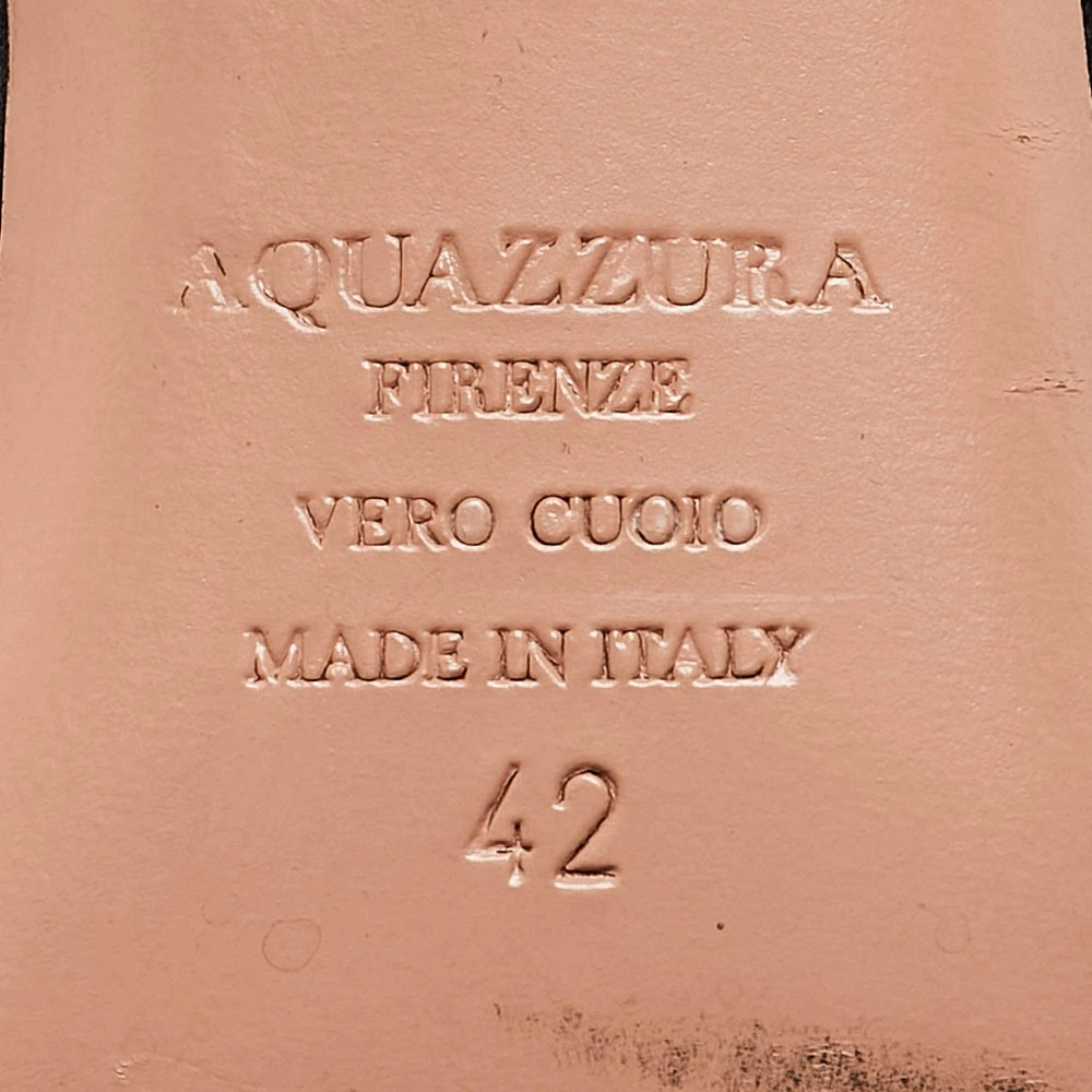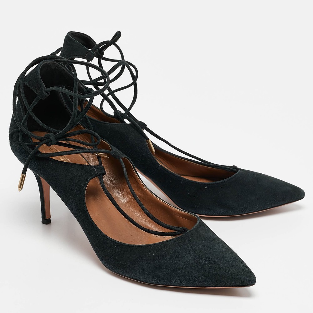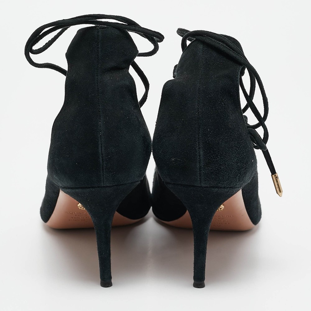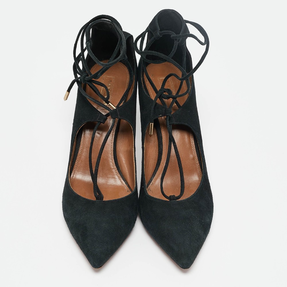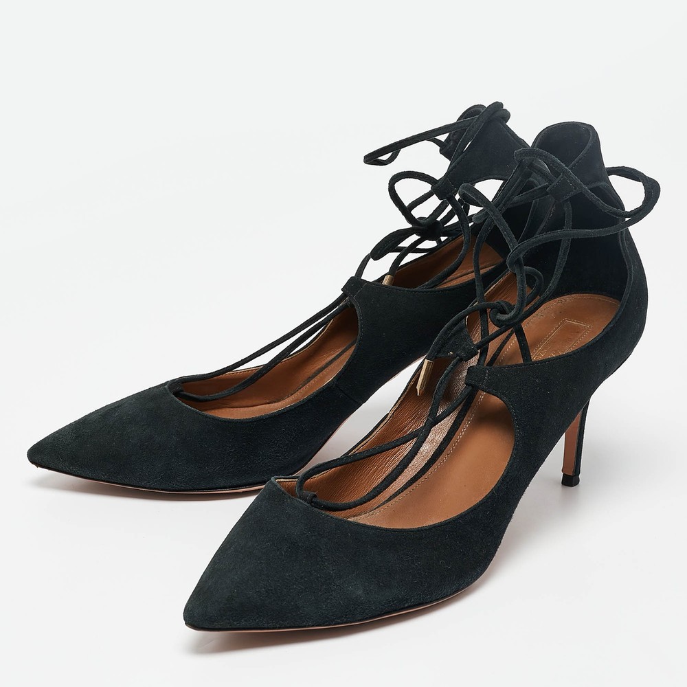 Upper Material: Not Available Outsole Length: 28 cm Type: Tie up Color: Black Heel Size: 8 cm Lining Material: Leather Includes: The Luxury Closet Packaging Brand: Aquazzura Outsole Width: 9 cm Closure Type: Tie up Hardware: Gold Tone Style: Not Available US Shoe Size: Not Available Country of Origin: Italy Exterior Material: Suede Department: Women Insole Material: Leather Sole Material: Leather