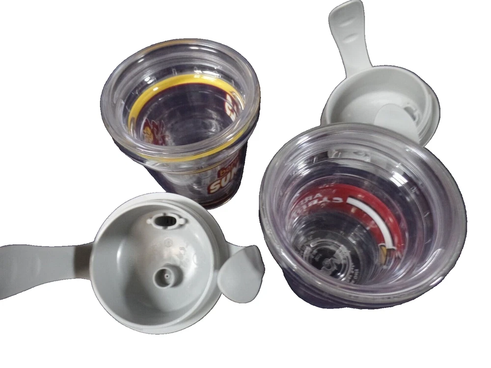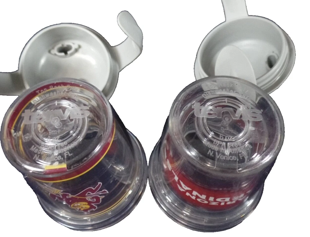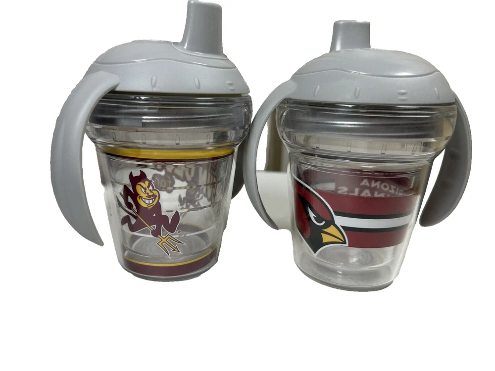 This set of two sippy cups is perfect for your little one who loves to drink in style. Featuring the colors of the Arizona Cardinals and Sun Devils, these cups are made of BPA-free plastic and come with handles for easy gripping. With a capacity of 6 fluid ounces, they are perfect for on-the-go use. The cups are designed with a screw-on lid style and are made in the United States. These sippy cups are a must-have for any baby or toddler who loves sports-themed designs. The cups are durable and easy to clean, making them a great addition to your child's cup collection. Whether you're at home or on-the-go, these cups are sure to keep your child hydrated and comfortable. Note: There are no chew marks on the lids. Please review the photos.